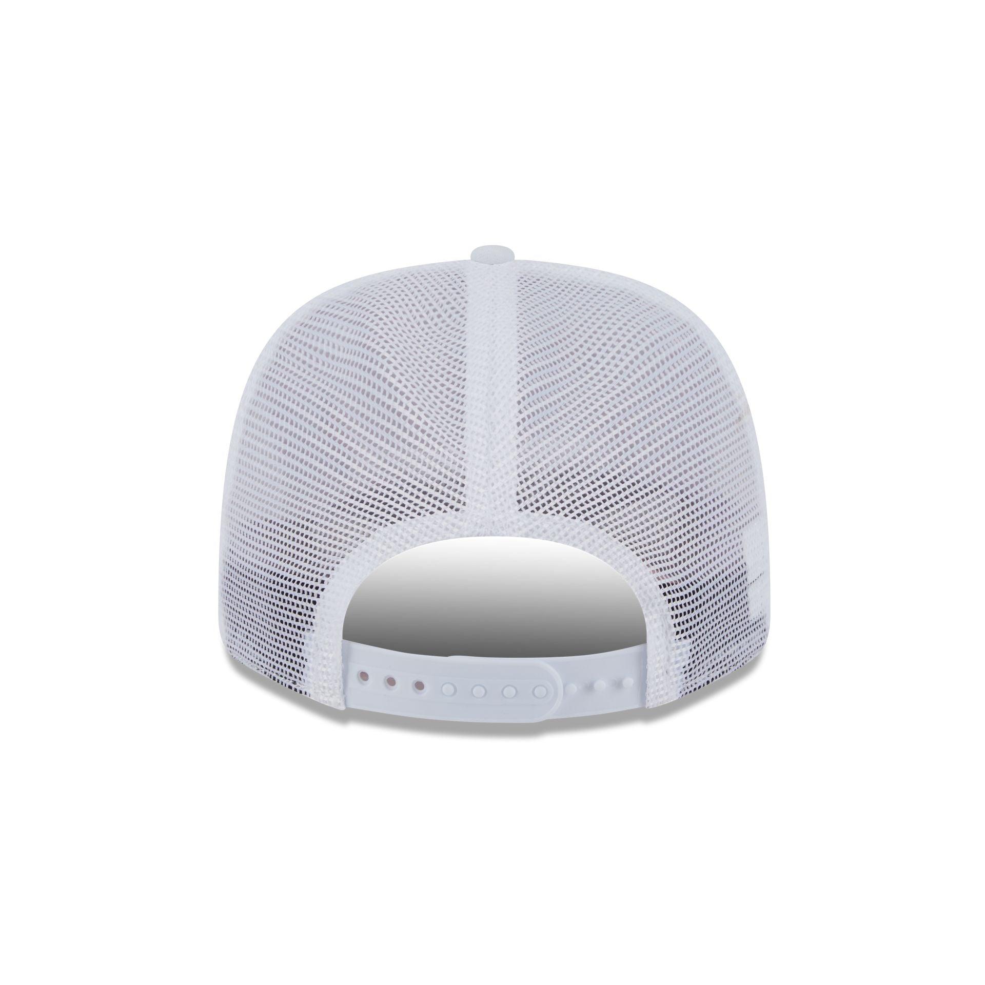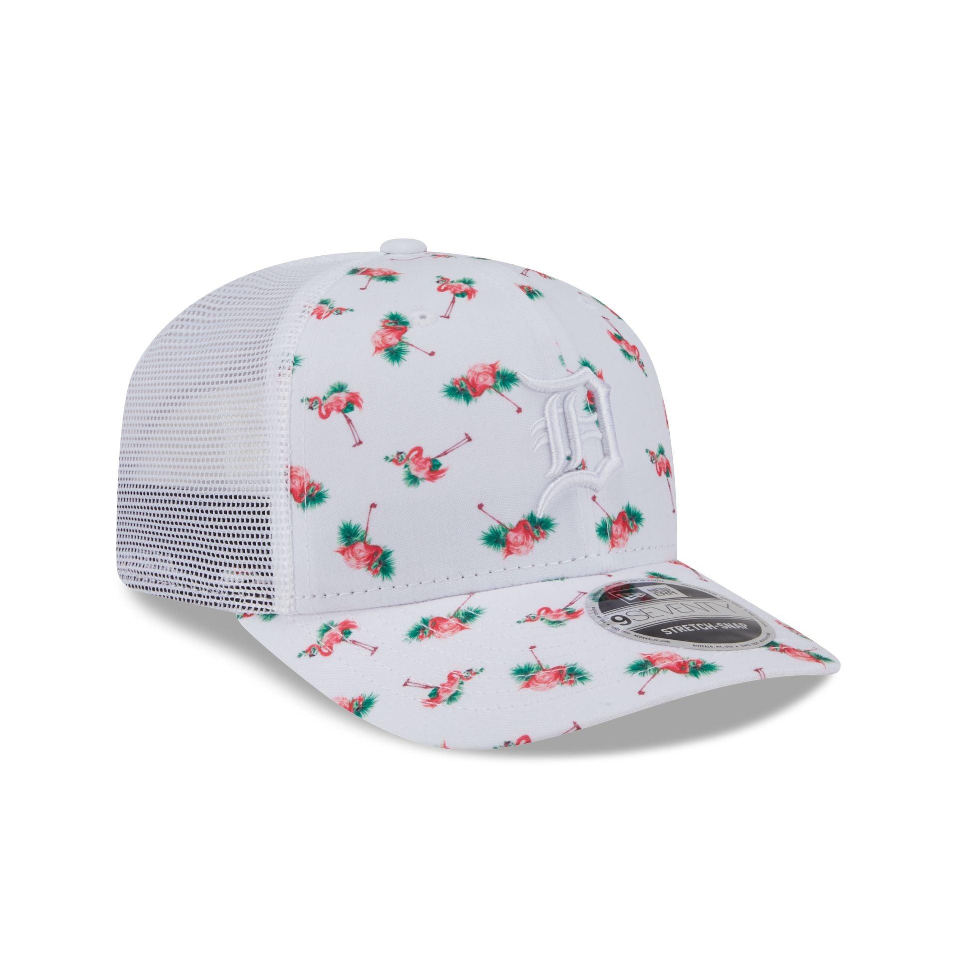 The Detroit Tigers Pattern 9SEVENTY Trucker Hat features an allover flamingo print with an embroidered Tigers logo at the front panels with an adjustable snapback closure at a mesh rear.