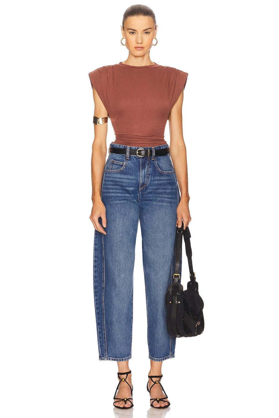 97% modal, 3% elastane. Hand wash. Pull-on styling. Padded shoulders. Midweight jersey fabric. Garment is made with a semi-sheer fabric, undergarments can show through. Made in Portugal. Revolve Style No. ISAR-WS182. Manufacturer Style No. TS0274FB-C3K01E.