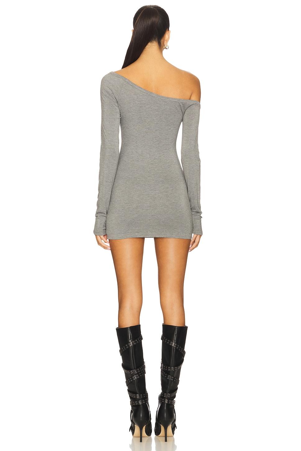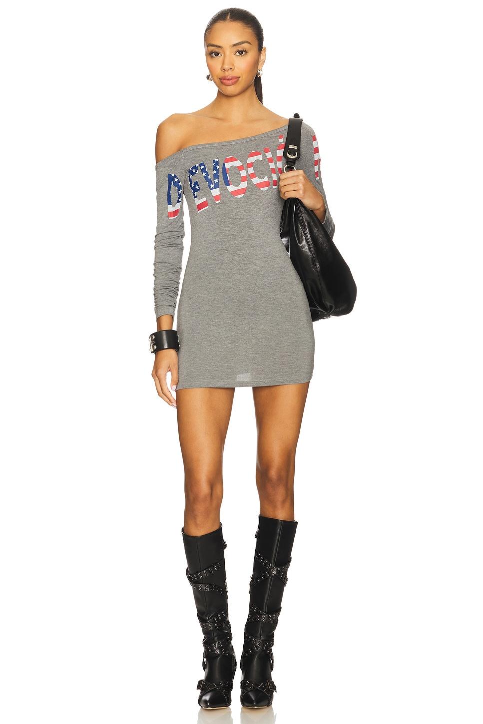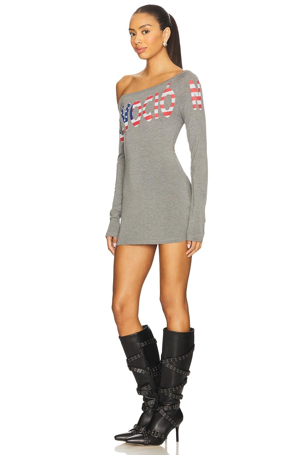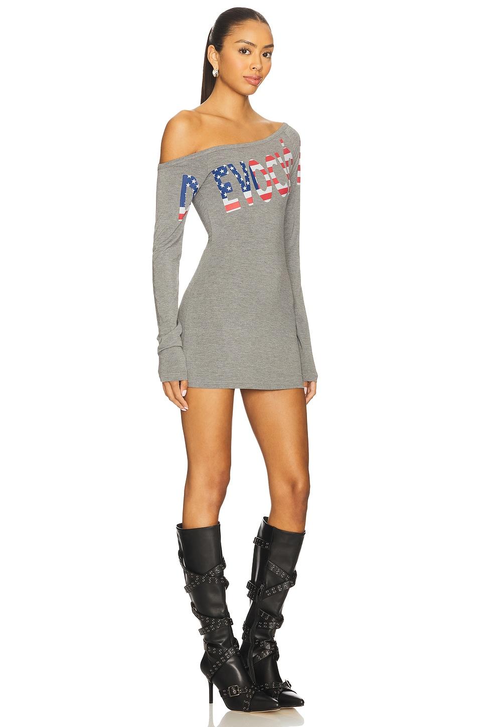 64% polyester, 28% viscose, 8% spandex. Hand wash. Unlined. Pull-on styling. Drop shoulder design. Front print graphic. Midweight jersey fabric. Neckline to hem measures approx 25.5" in length. Made in China. Revolve Style No. NIIR-WD7. Manufacturer Style No. 2025_BS_DRS_DEV_PES_GRY.