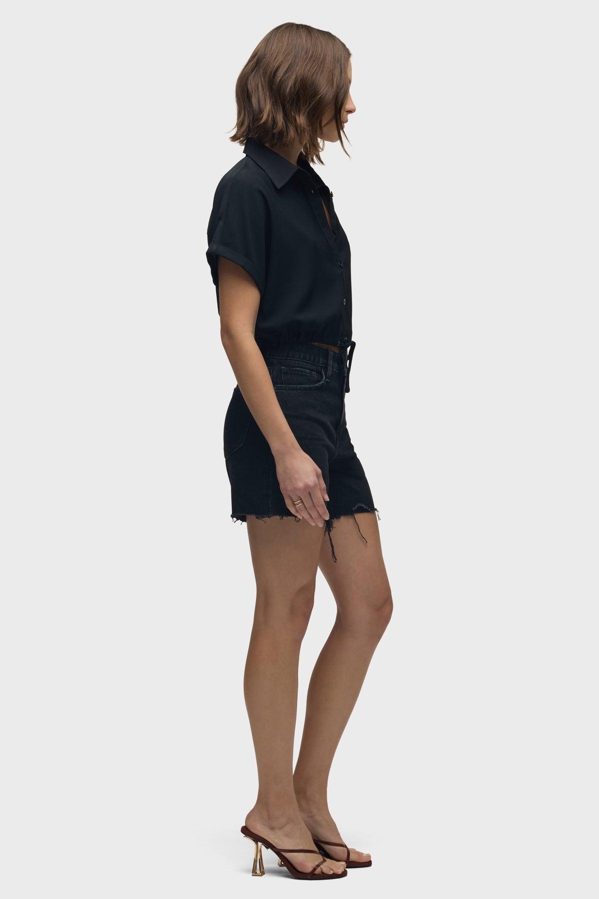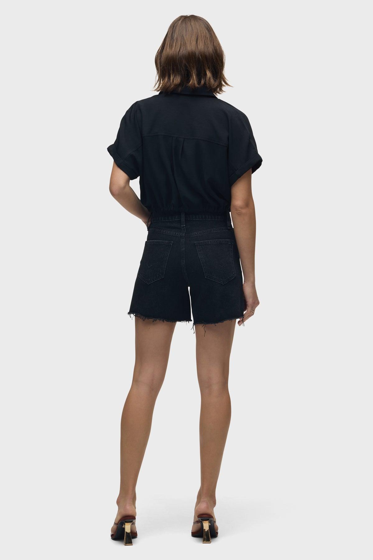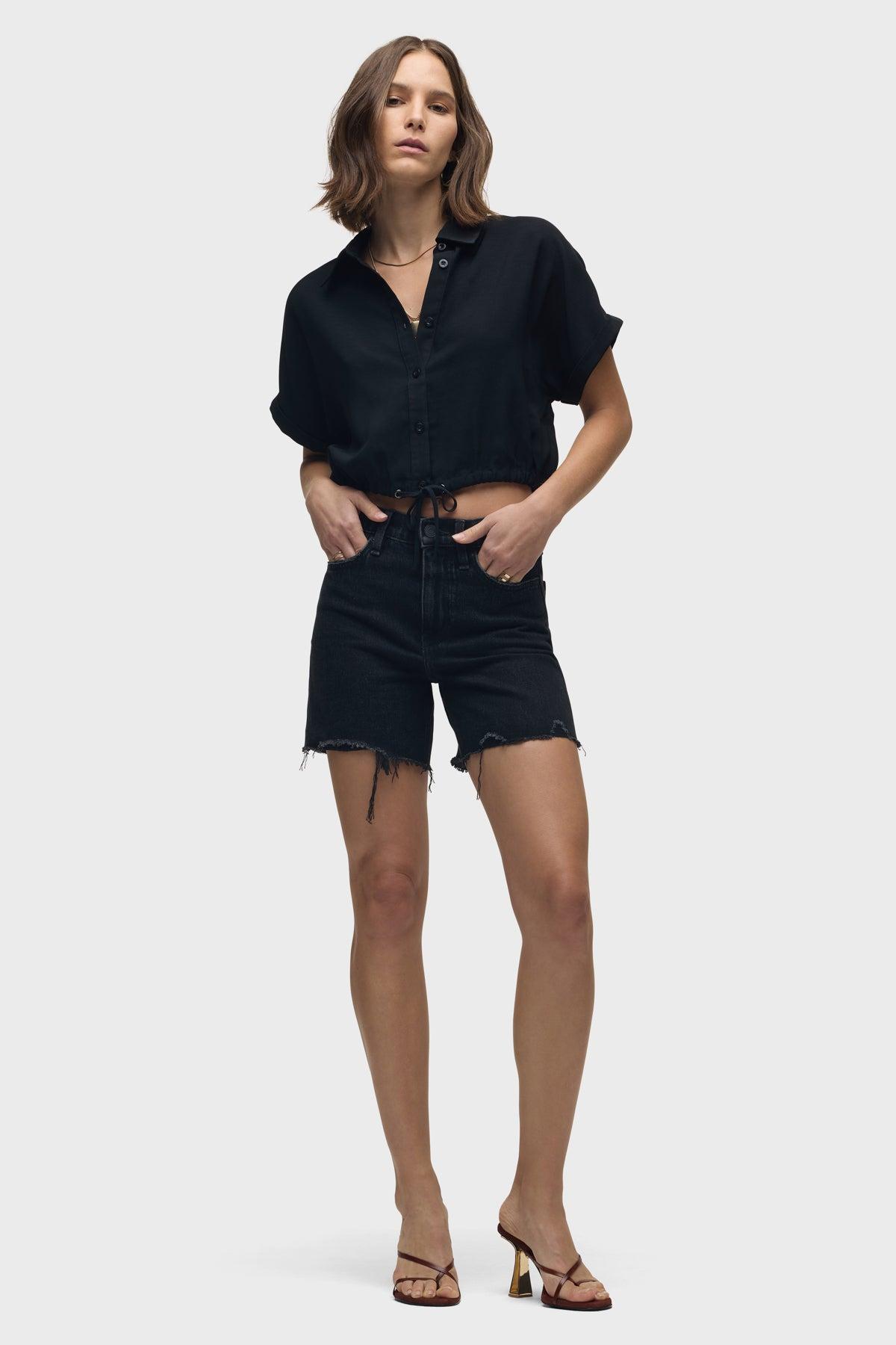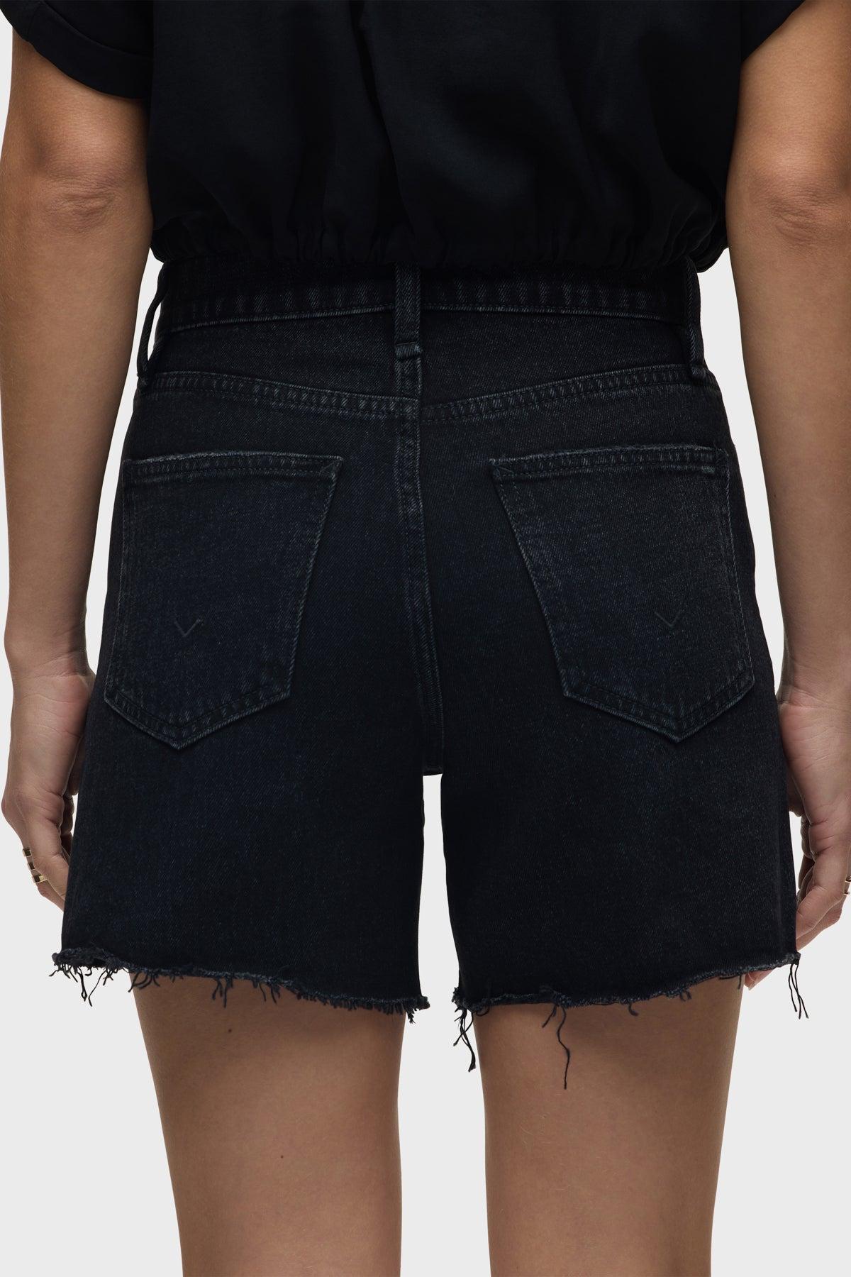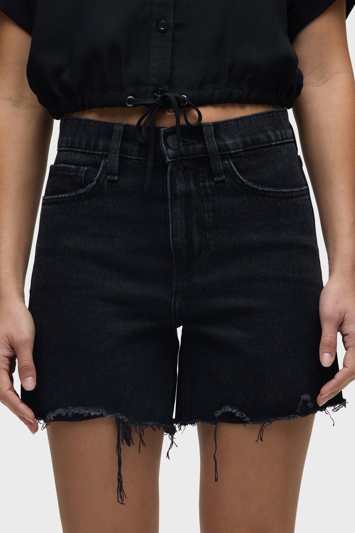 Description The Devon High-Rise Boyfriend Short in Destructed Black has a relaxed boyfriend fit with destruction and a cool destructed hem. This pair is made of a washed black rigid denim with heavy stone washing and edge grinding. Product Details Front Rise: 11", Leg Opening: 23.5", Inseam: 5"Model Height 5'9"Model wearing size 25Measurements based on size 27 Fit & Care Content: 100% CottonMachine wash cold with like colorsDo not bleachTumble dry low or hang to dry