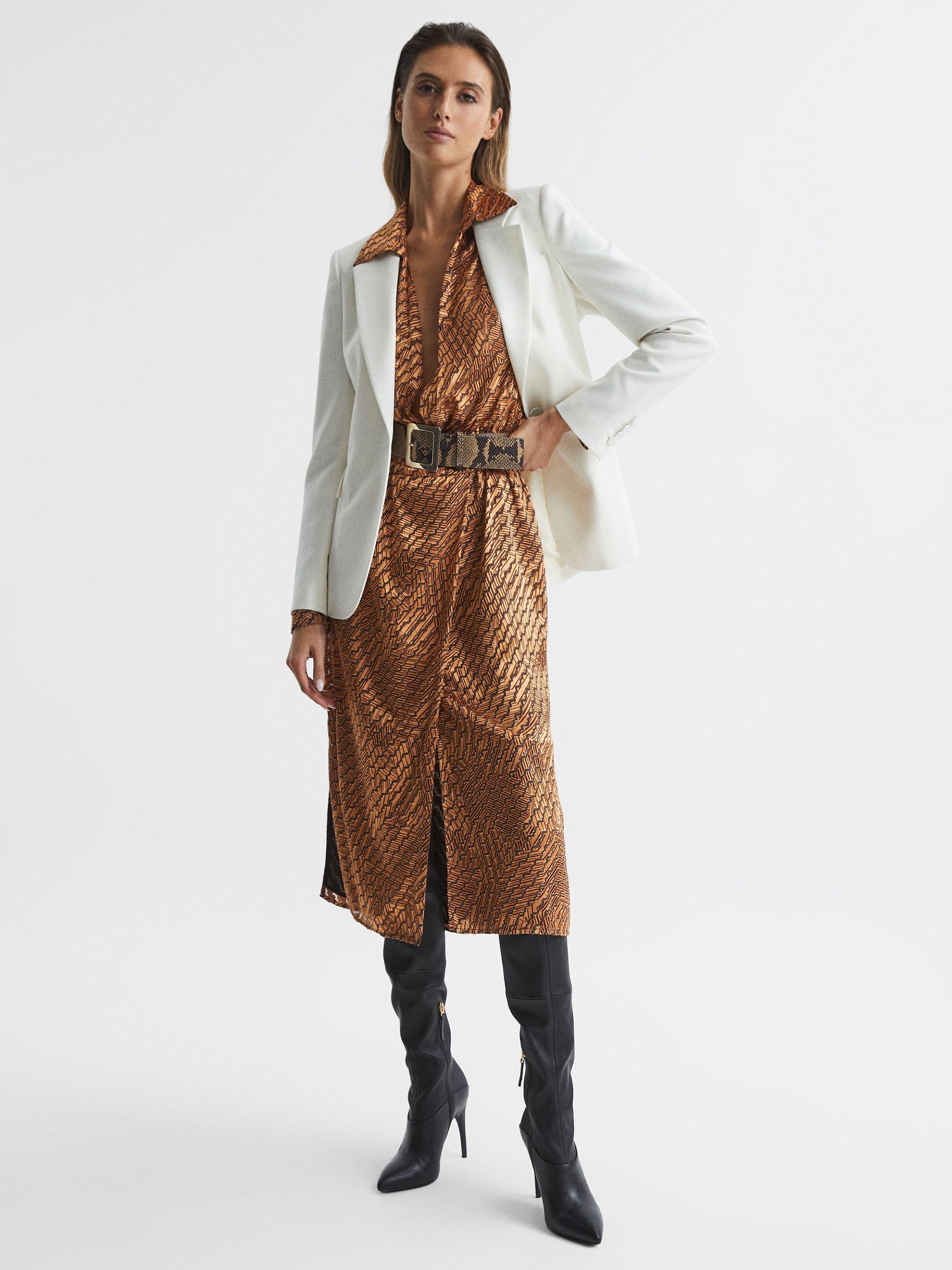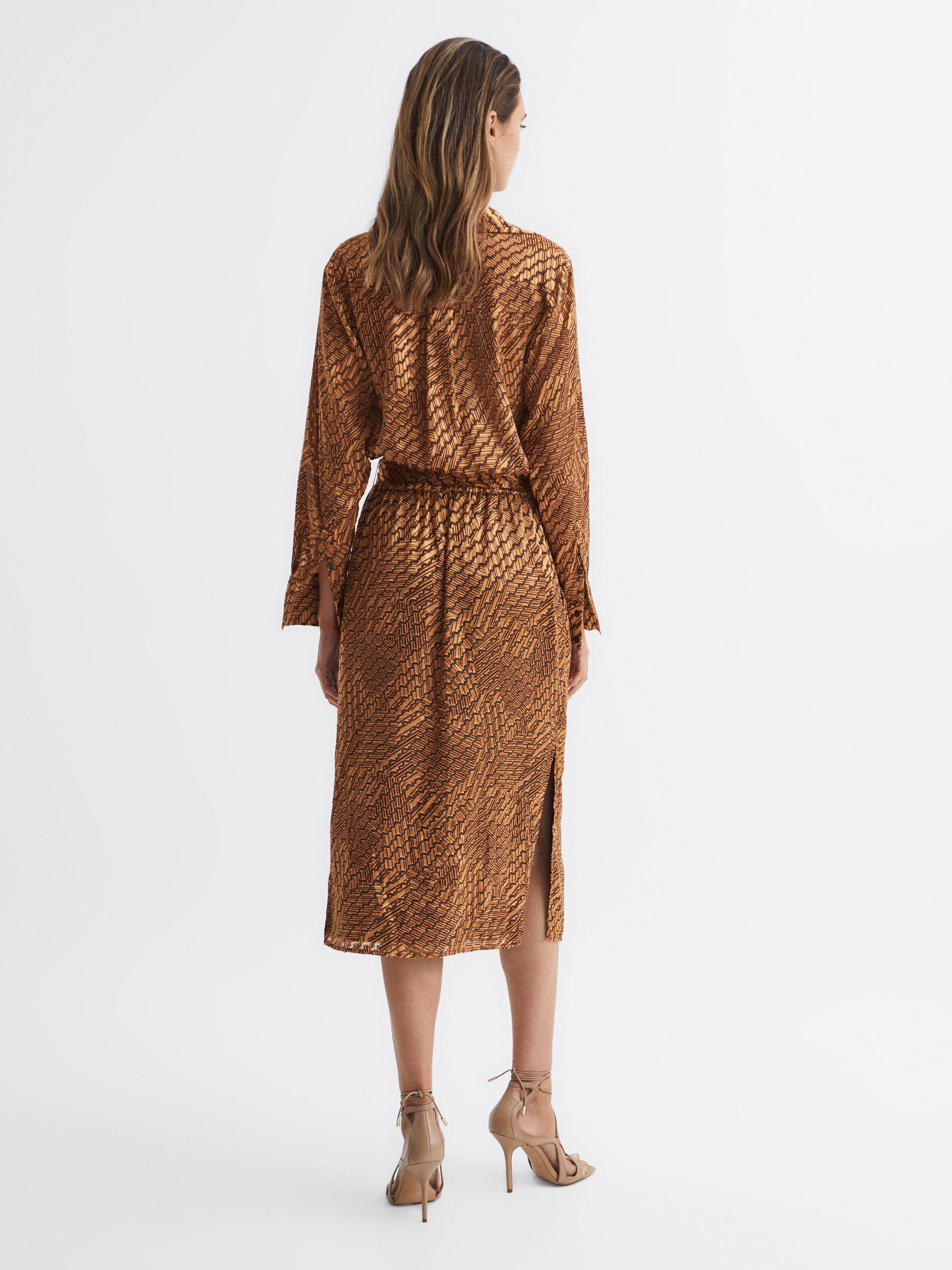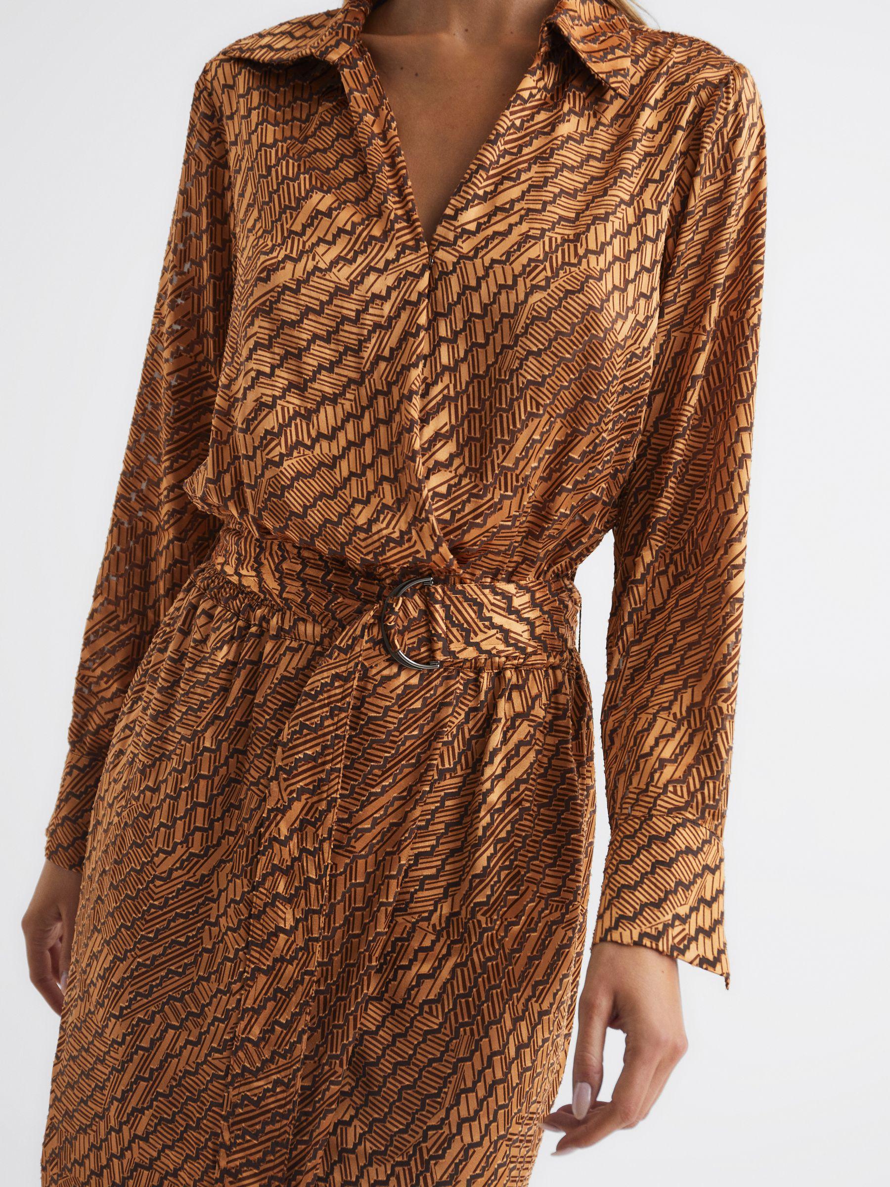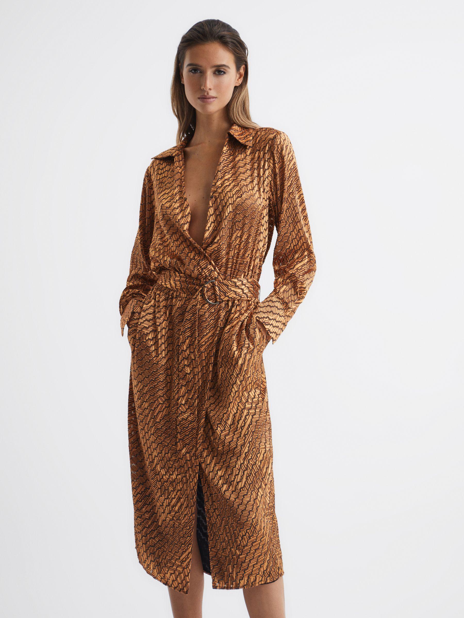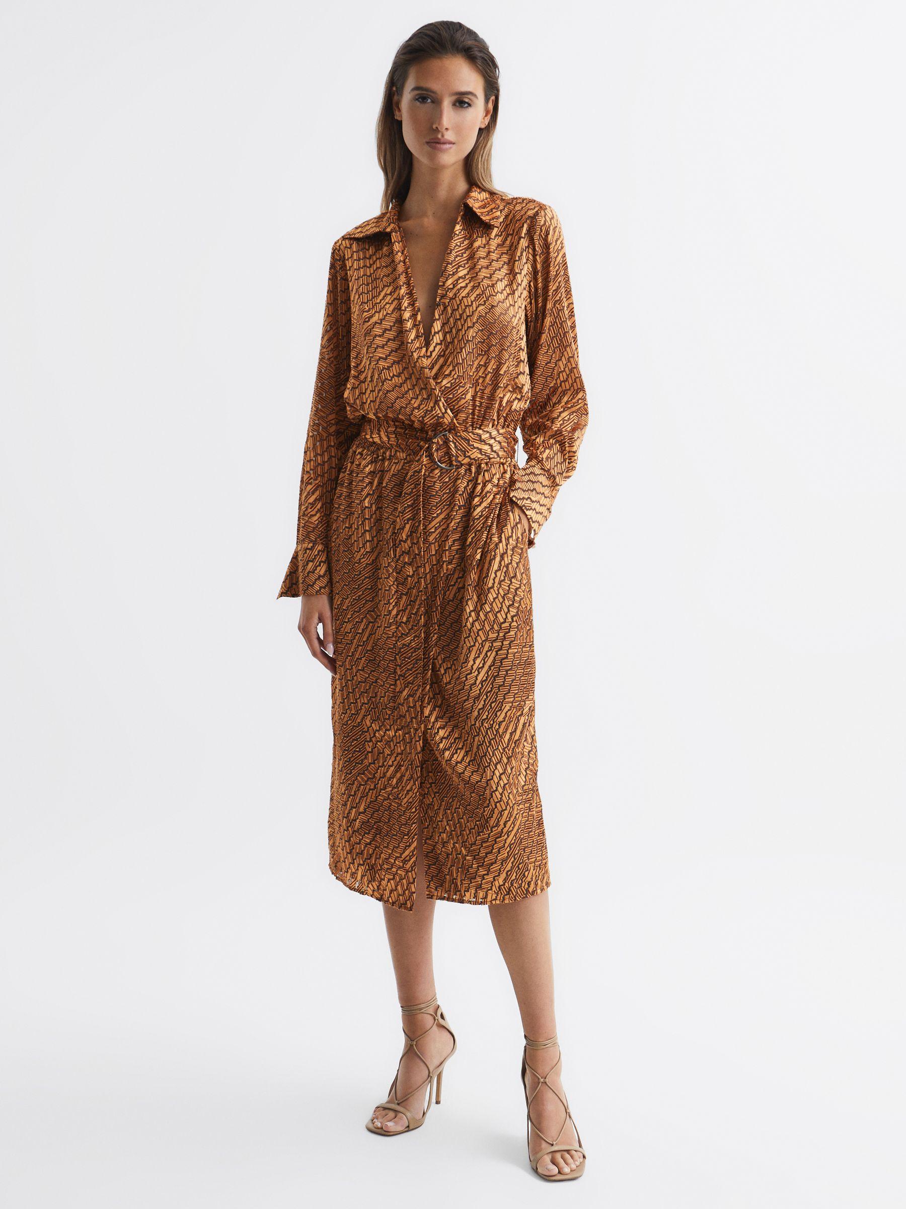 The Emily dress is crafted in a new-season bronze print. It's cut to a midi length with a belted midriff that allows the profile to be cinched for an elegant silhouette. This style is crafted with an open collar, buttoned cuffs and a deep-cut wrap design neckline that lends a classically feminine mood. Wear it with a blazer and heels for an edit that looks good at the office as well as evening plans. Open collar. Wrap style. V-neckline. Belted midriff. Buttoned cuffs. Front slip. Semi-sheer print. Midi-length. The model is wearing a size 8 Measurements of model: Height 5ft 10" / 178cm.
