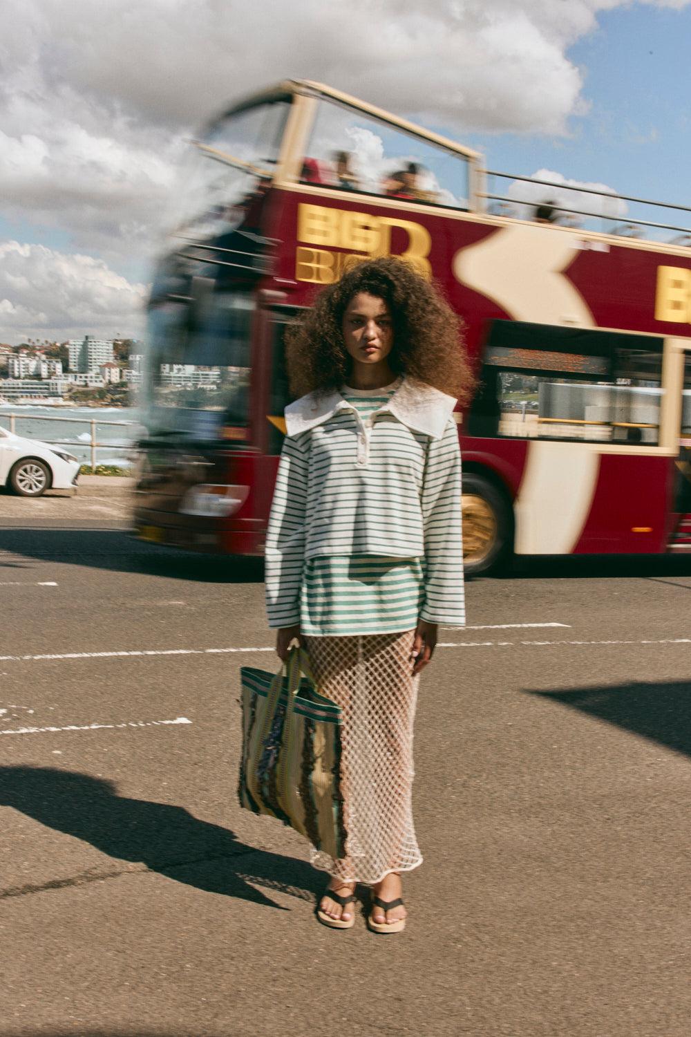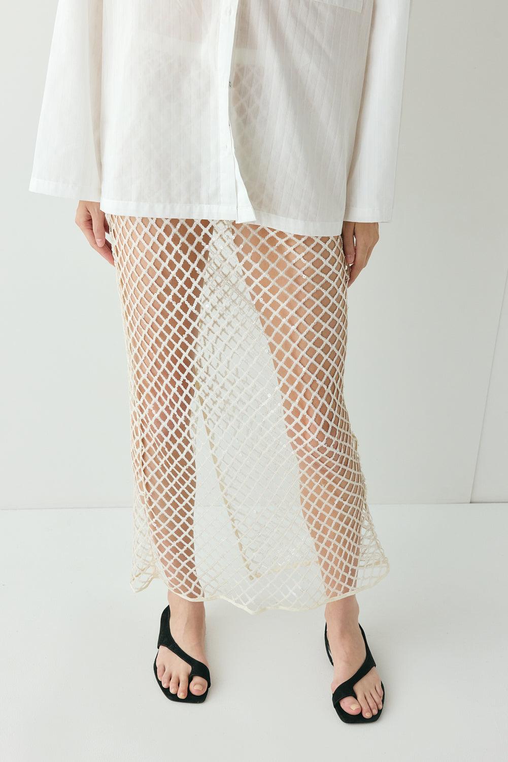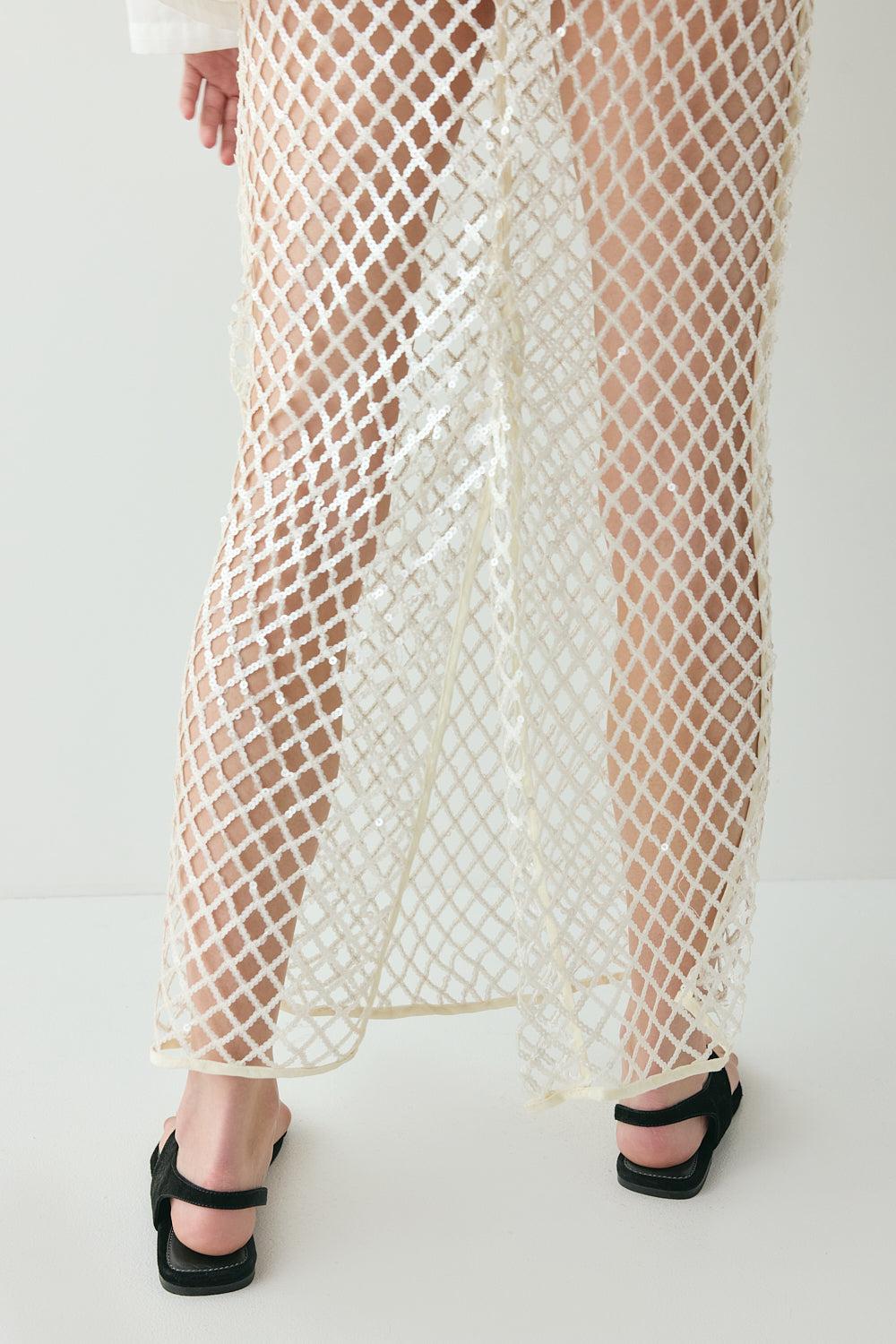 Our bestselling Devyn, reimagined in netting detailed with sequins. It sits high on the waist with a contrast waistband, side zip and a back split to keep things moving. Designed to layer over briefs or pair with the matching top - it’s a statement piece built for contrast.