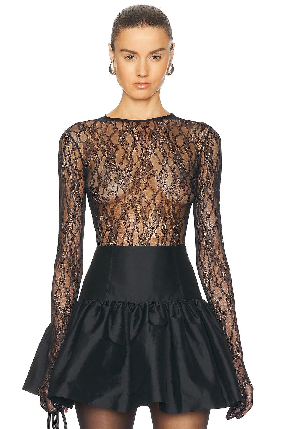top100% polyester / Made in Turkey / Dry clean only / Hidden back zipper closure / Gusset button snap closure / Lace fabric with glove detail / Garment is intentionally sheer, undergarments will show through / Our Style No. NALF-WS13 / Manufacturer Style No. S25_NA00600610565 / Model is wearing size 36.