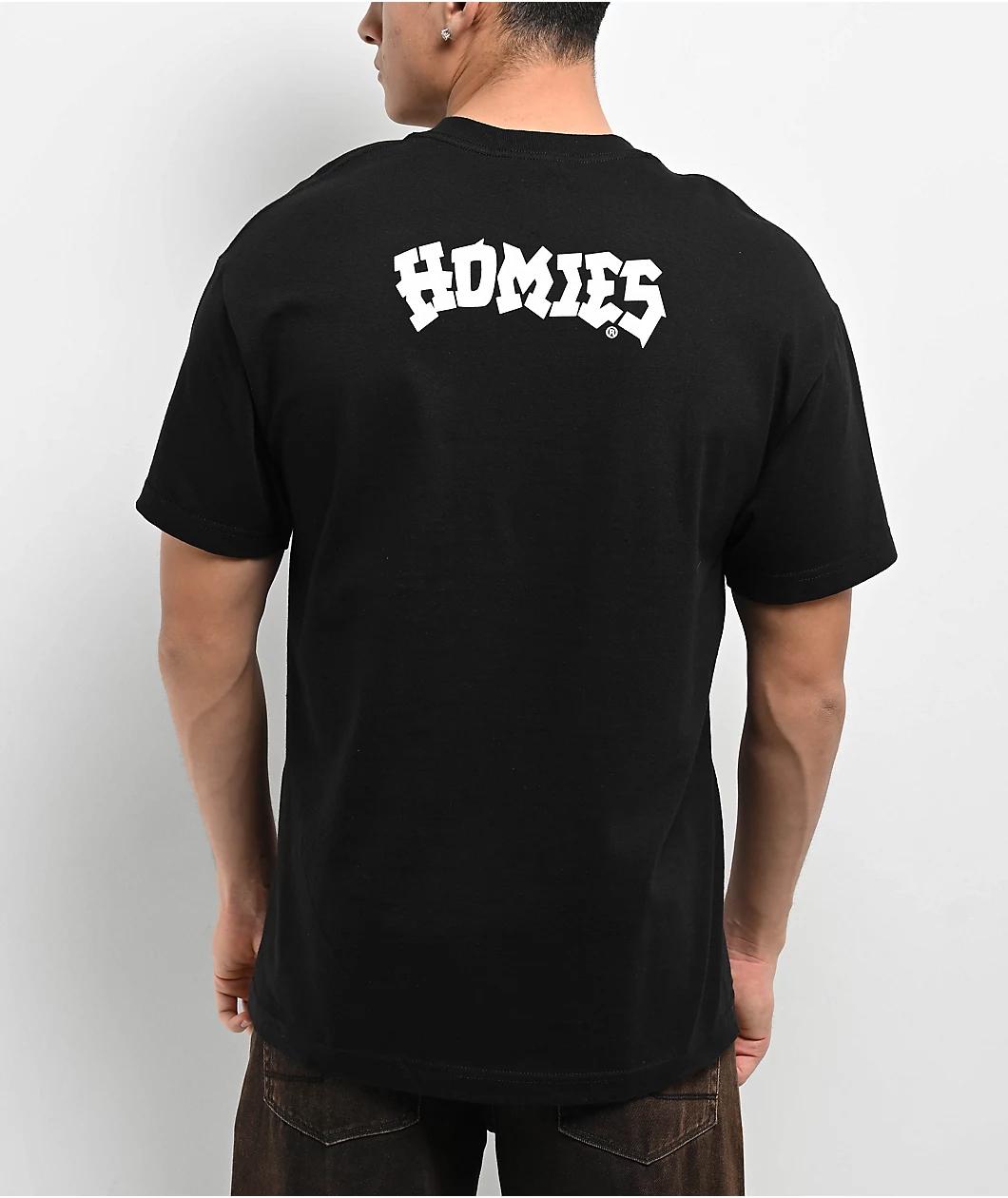 Show off your love for your squad in the Homies Wall t-shirt from DGA. The black tee showcases a group of friends posing with a sleek classic car in front of a grey brick wall with text reading "Homies" on it. Additional white "Homies" text on the ba