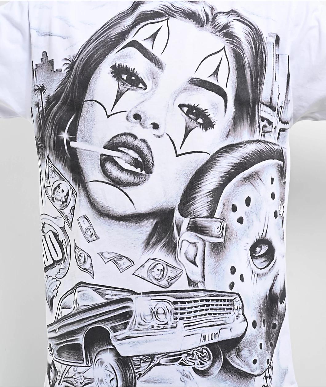 Landing in a clean white colorway, DGK presents the Avenue t-shirt showcasing bold screen-printed imagery. The front of the tee delivers a West Coast vibe with Latinx undertones, depicting a woman displayed in clown make-up with a lollipop in her mou