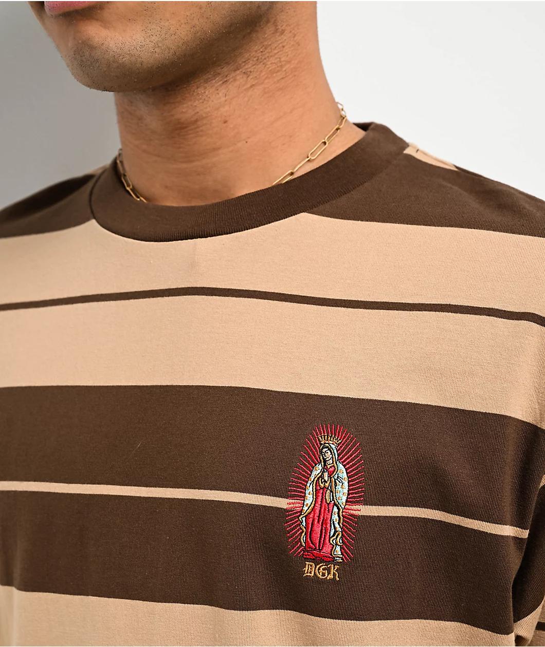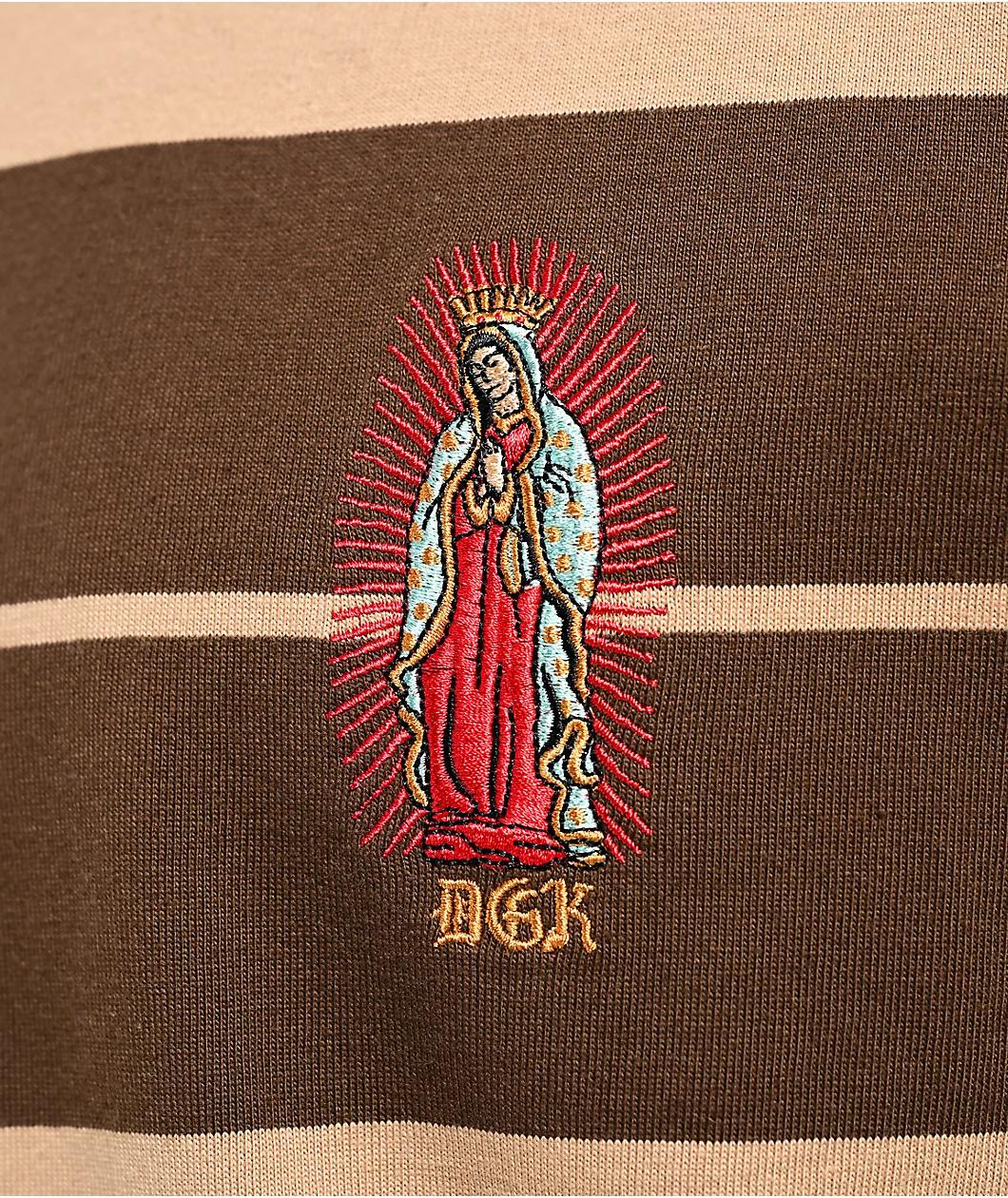 Arriving in a brown and tan colorway, DGK welcomes the Glory knit t-shirt with an embroidered logo on the left side of the chest. The graphic showcases the Virgin Mary with a red aura surrounding her with DGK written in Old English font underneath. T
