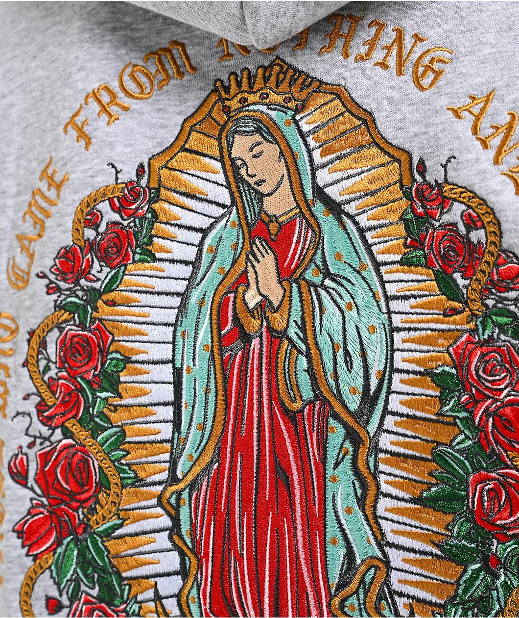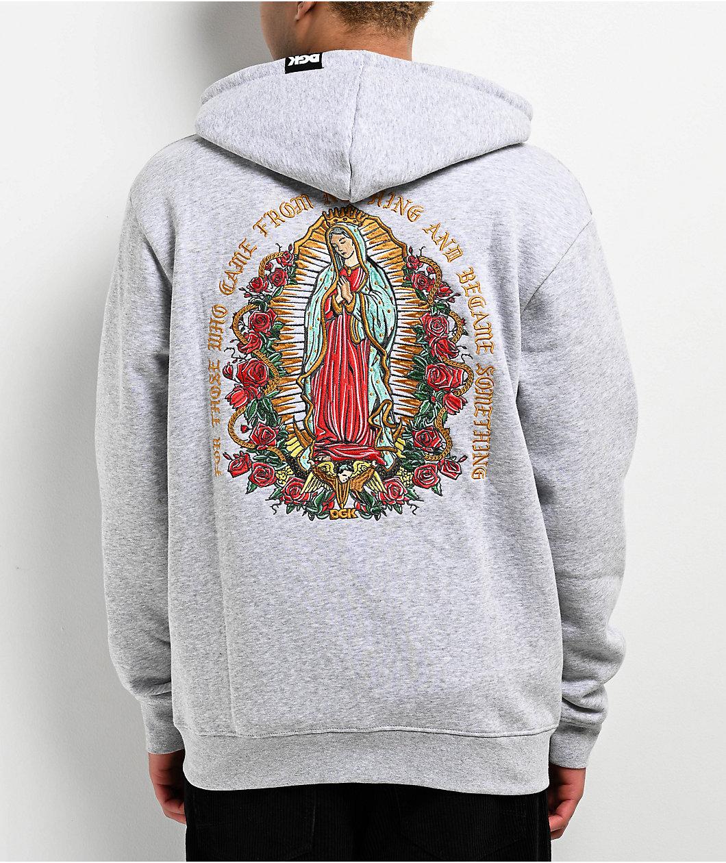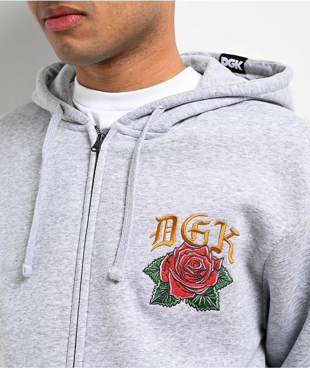 For those who come from nothing, DGK presents the Guadalupe hoodie in a grey cotton blend construction with a full zip closure and embroidered graphics for a high-end look. The front offers a detailed rose and branding on the left chest, while the ba