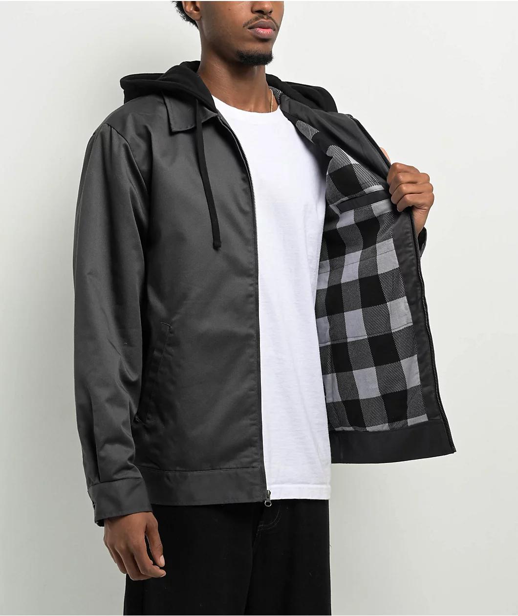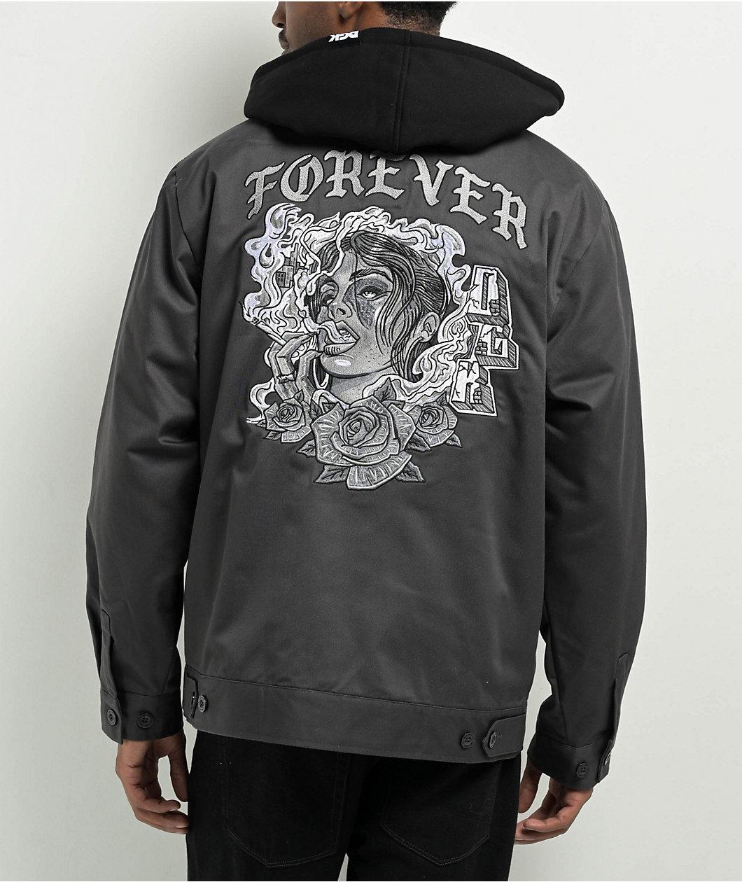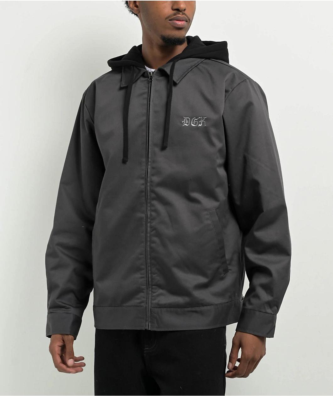 The folks at DGK welcome the Nuestra hooded jacket in a charcoal colorway featuring embroidered graphics on the front and back. The left side of the chest has branding in an Old English font whereas the back displays an image of a woman smoking a joi