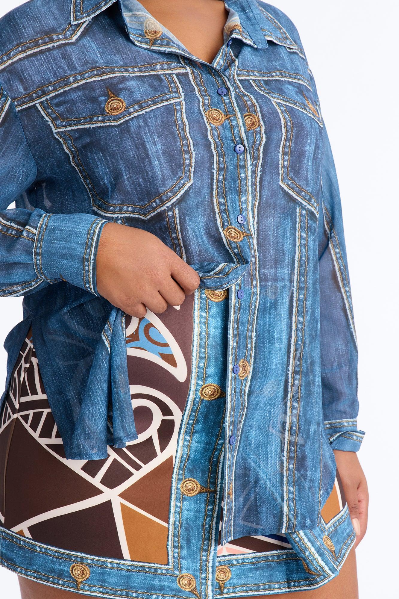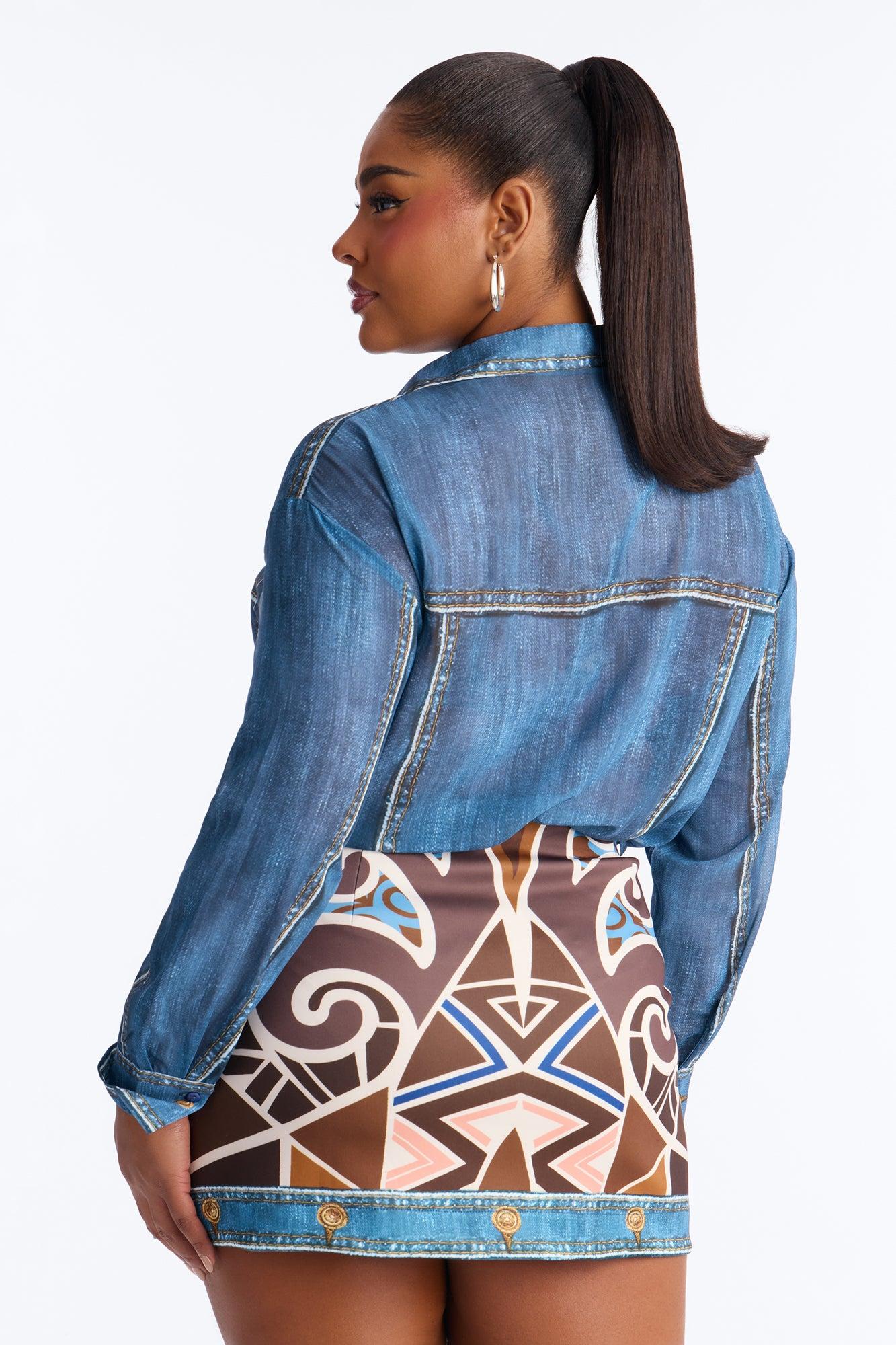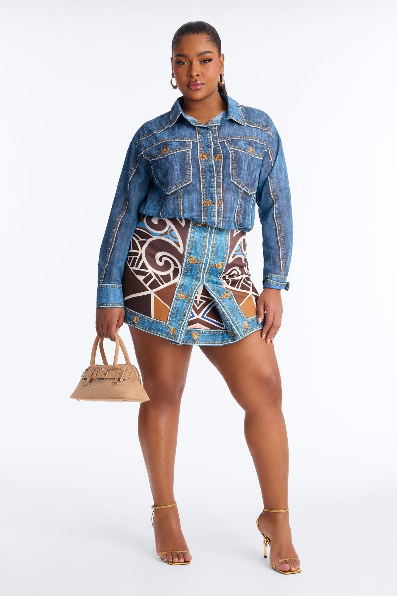 Available In Blue/combo. 2 Piece Ensemble Button Up Blouse And Mini Skirt Set Moderate Stretch Skirt Length 14" Elastic Waistband On Skirt Disclaimer - Print Placement May Vary Top: 90% Polyester 10% Spandex Skirt: 95% Polyester 5% Spandex Imported