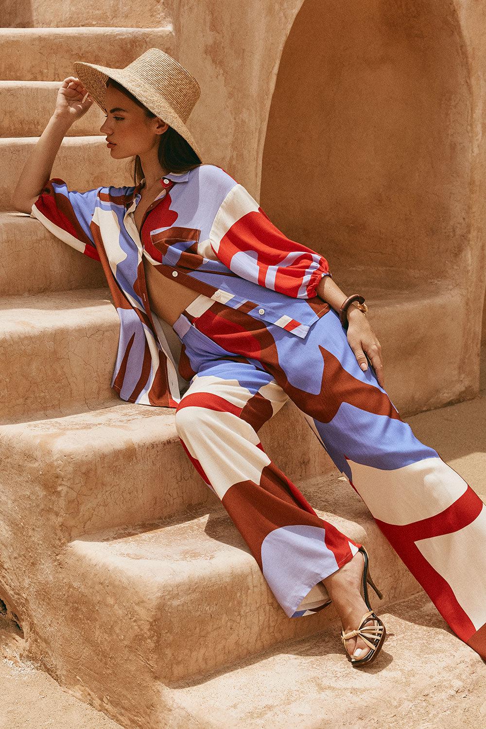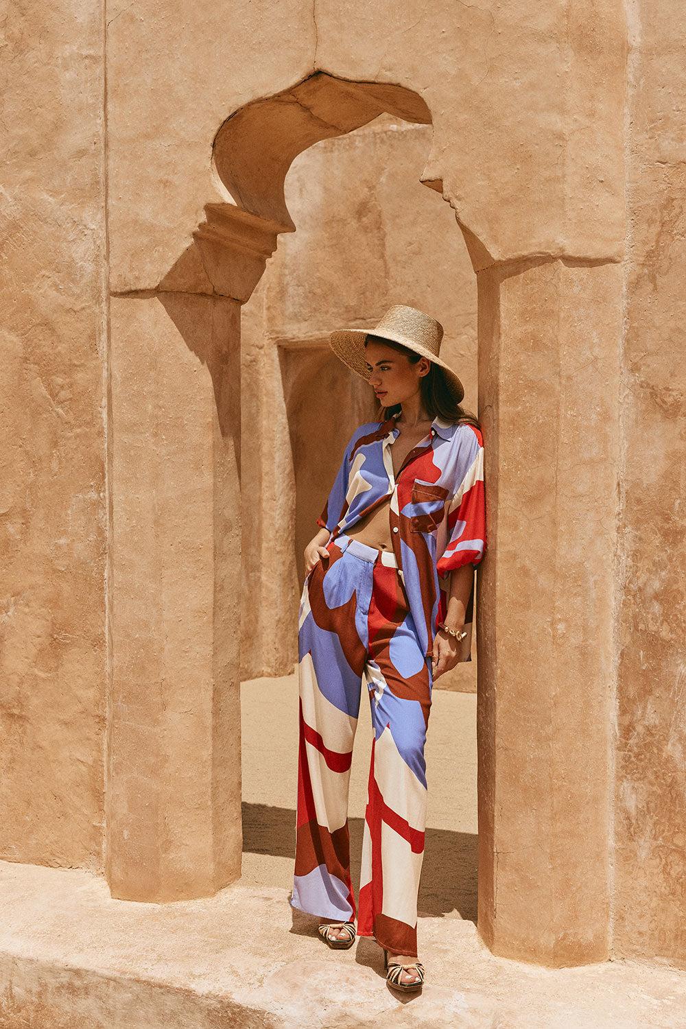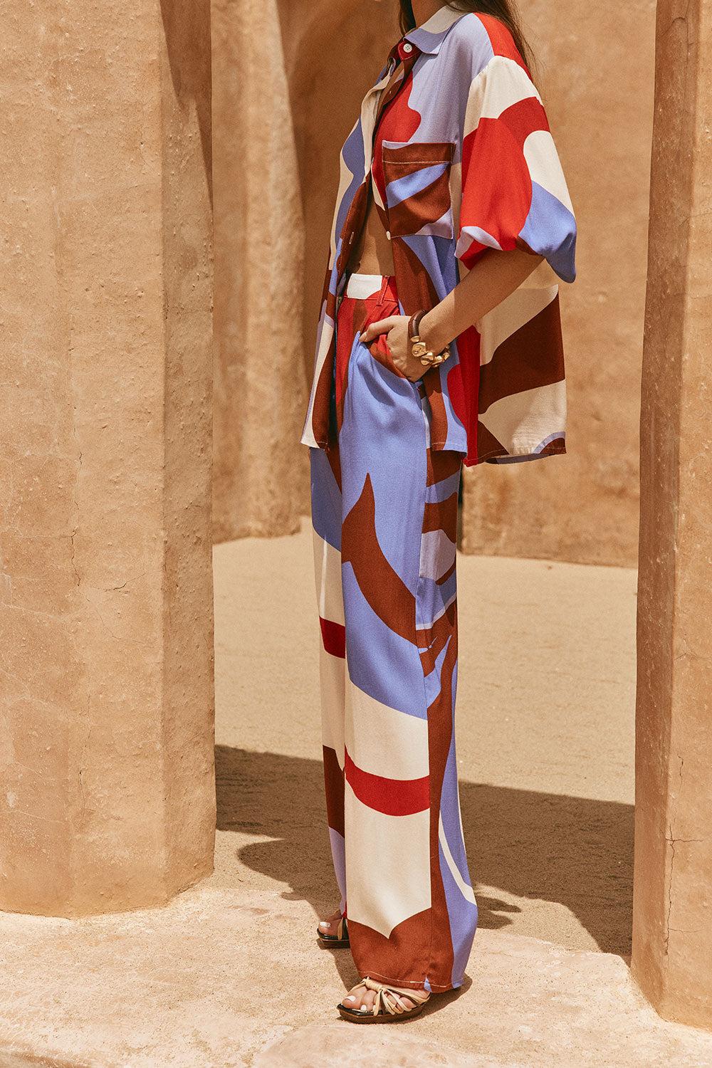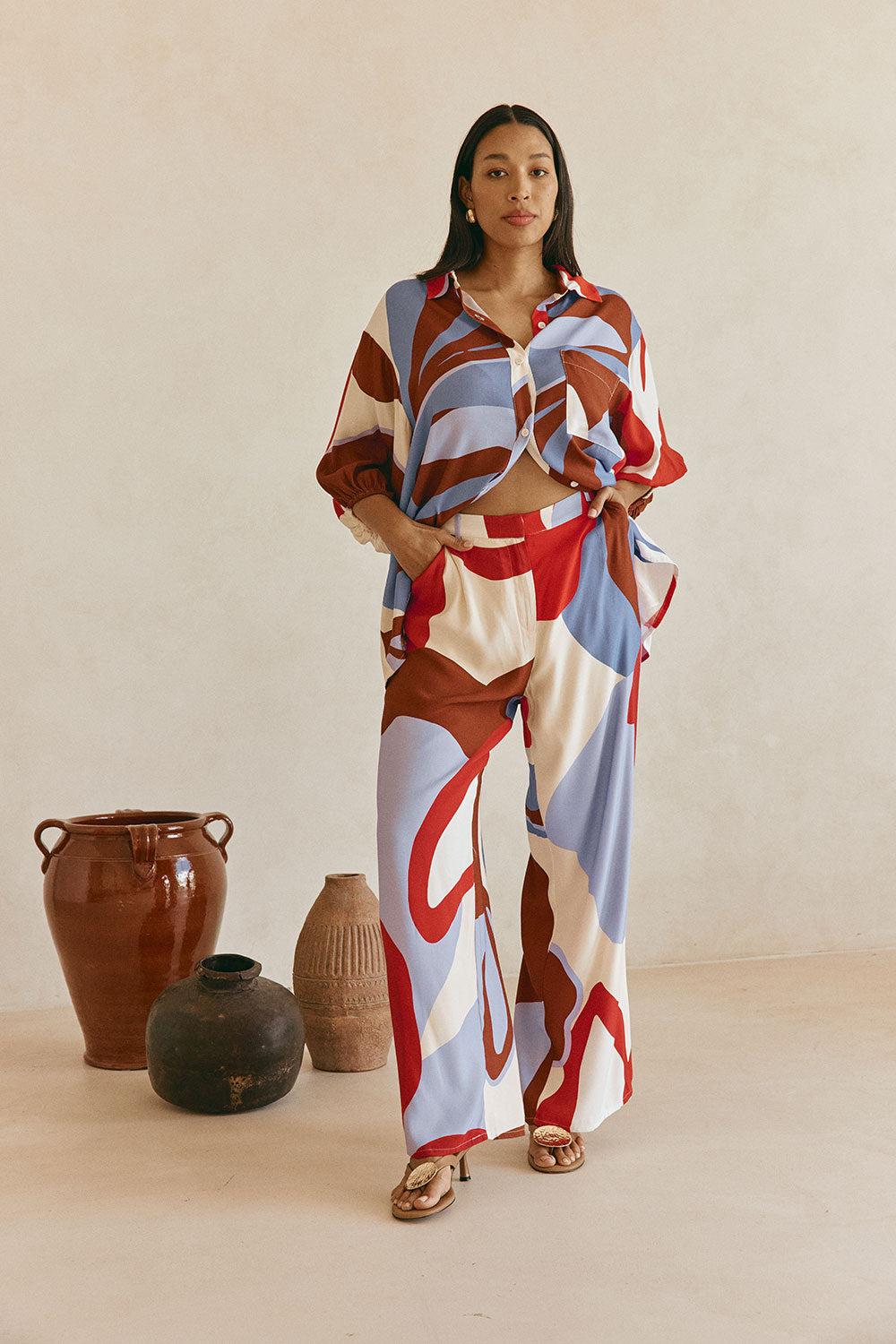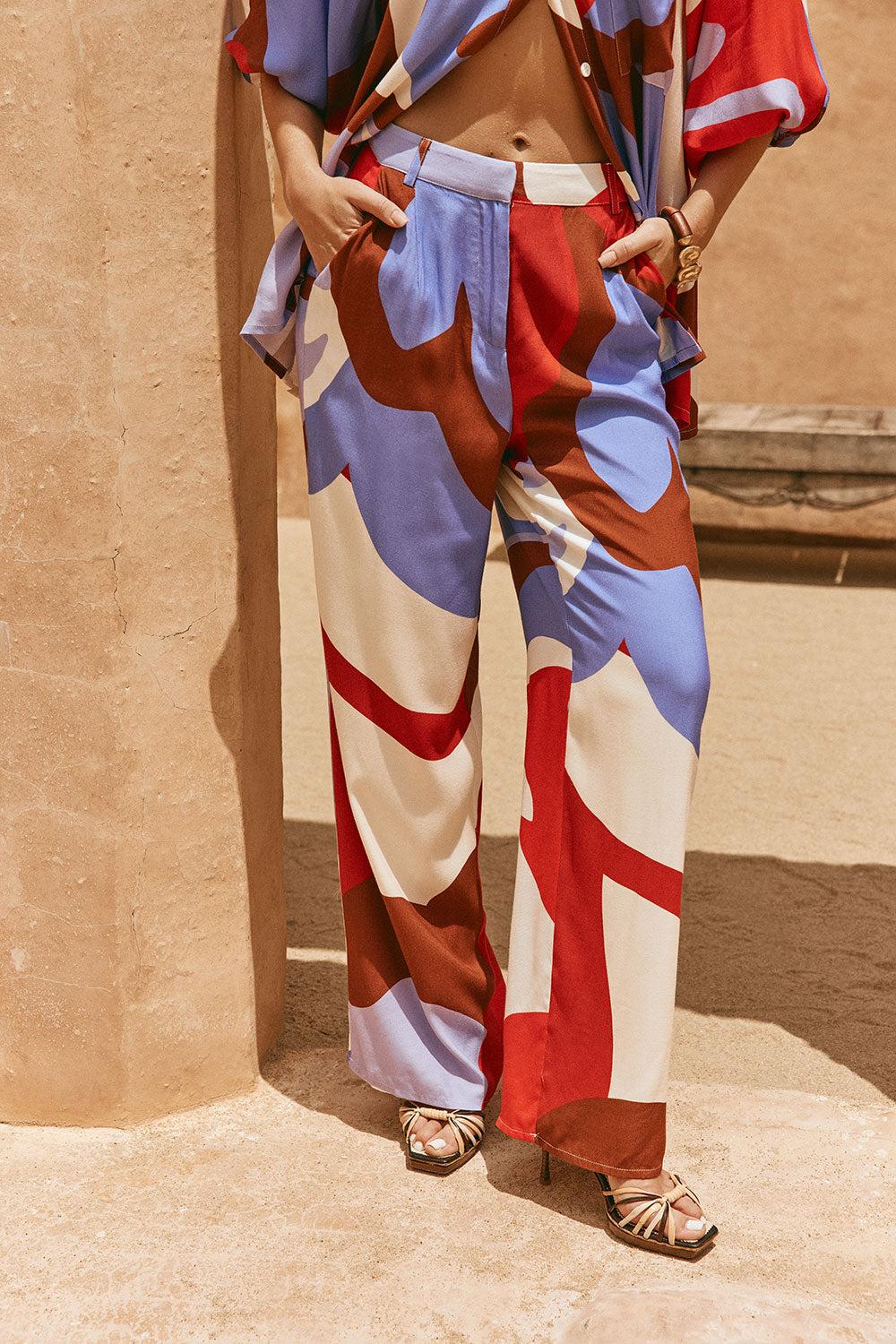 The tailored Dia Pants are made from a luxuriously buttery fabric with our exclusive Valley Red print. They are a high waisted style featuring belt loops at waist, twin pockets and a relaxed fit. Pair with the matching Dia Top or Vian Top for a more casual look! Designed exclusively by Sabo.
