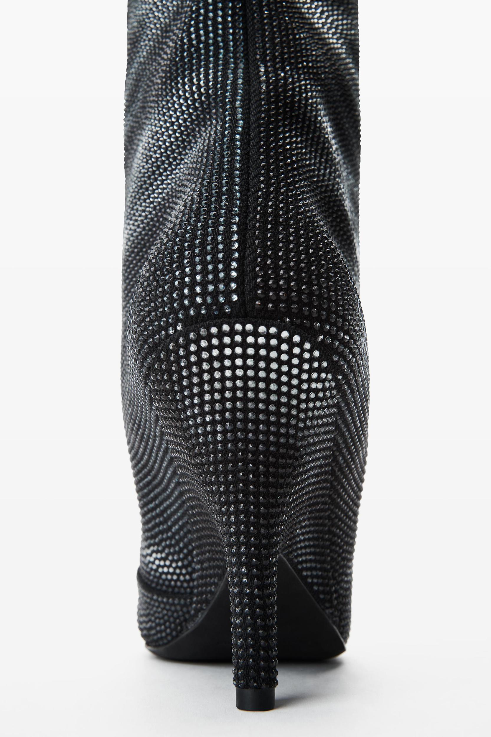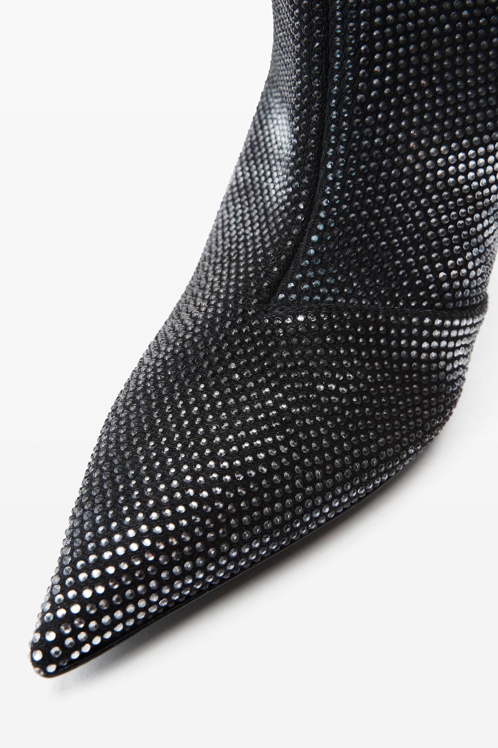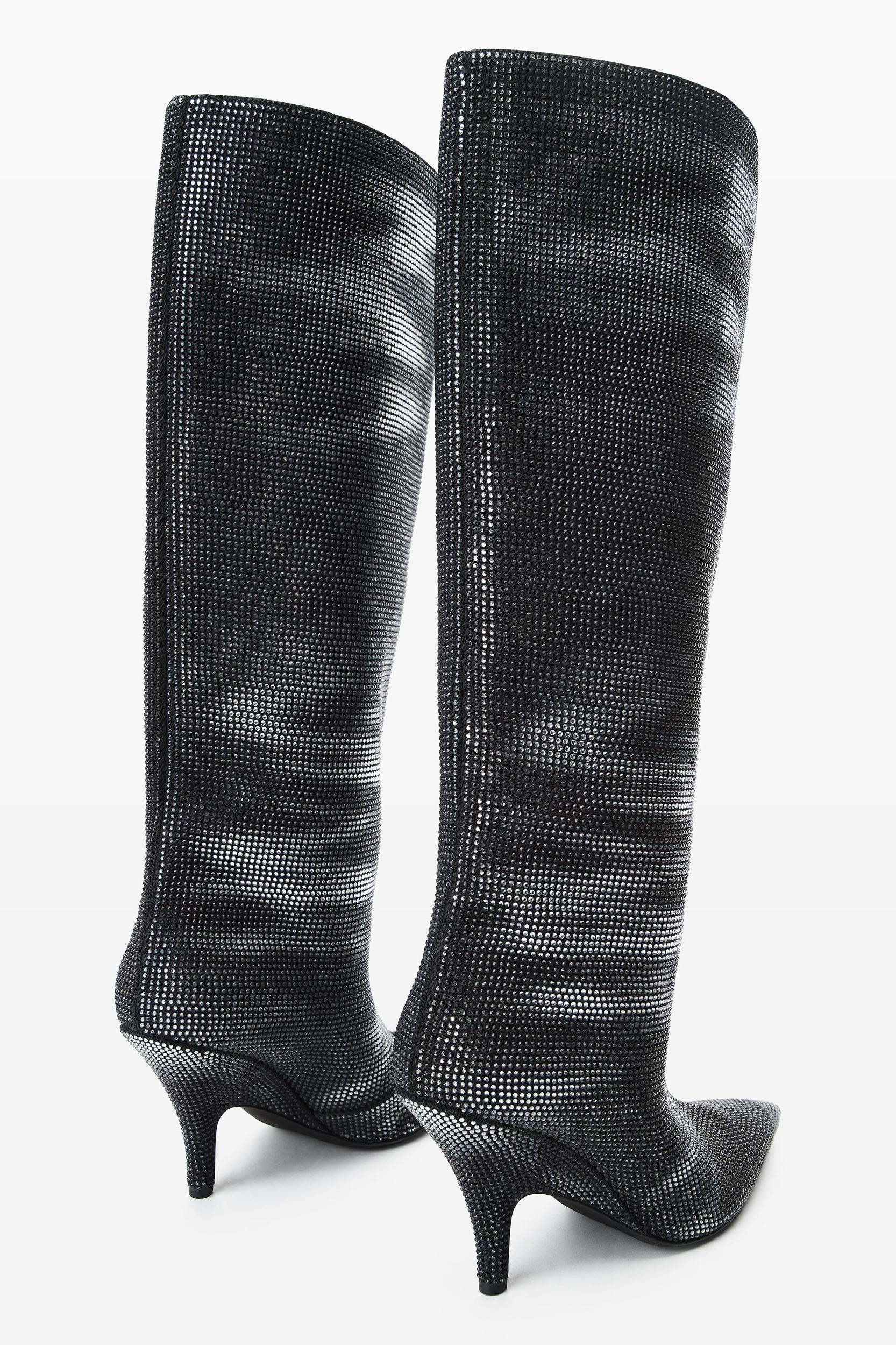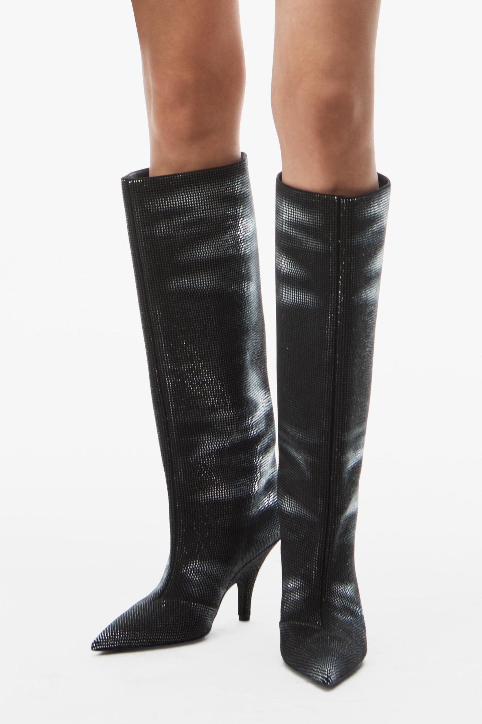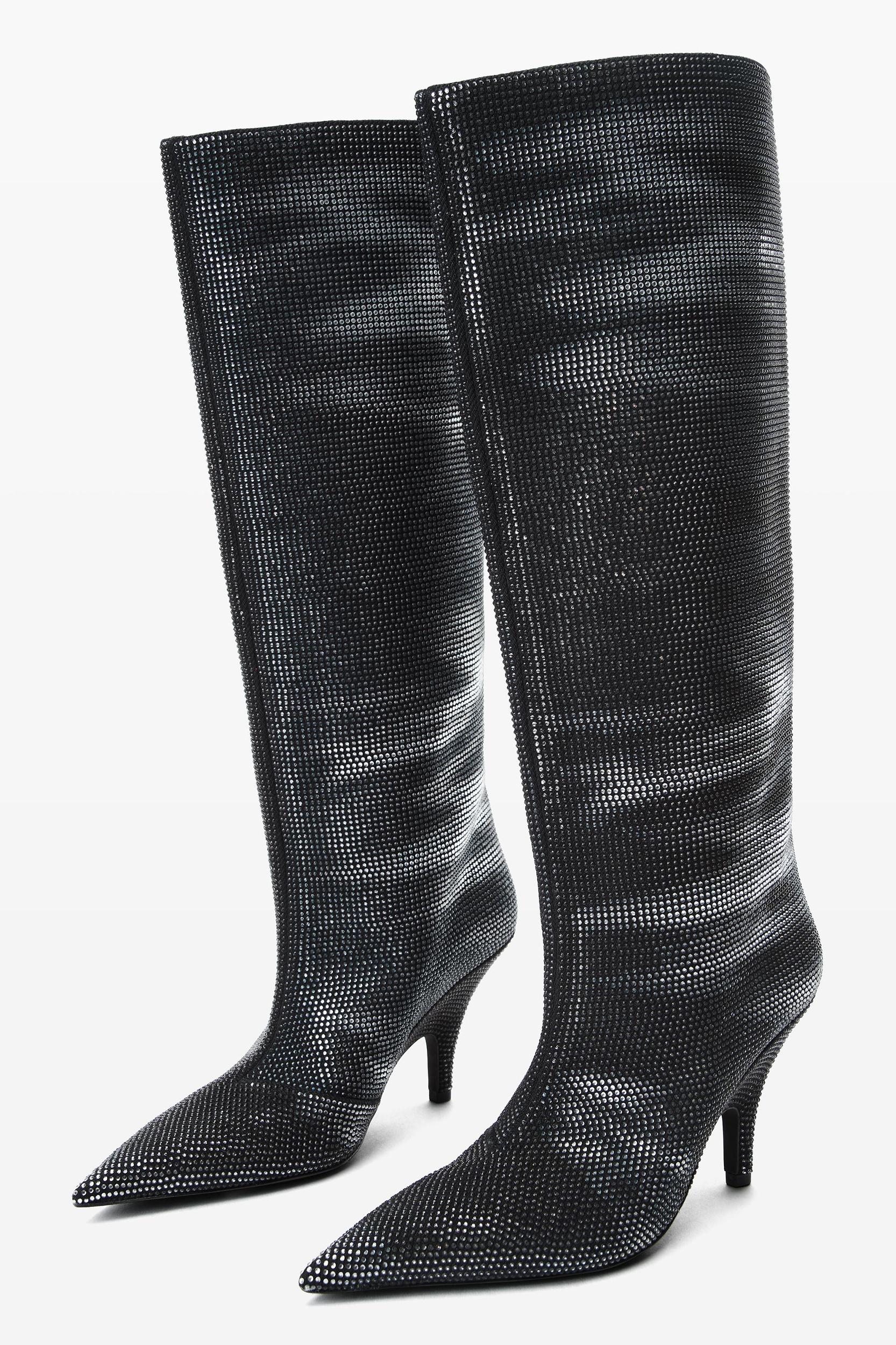 distressed grey crystal hotfix adorns this diablo tall boot, punctuated by a pointy toe. a padded leather footbed provides enhanced comfort to this denim style, fastened by a back-zip closure.