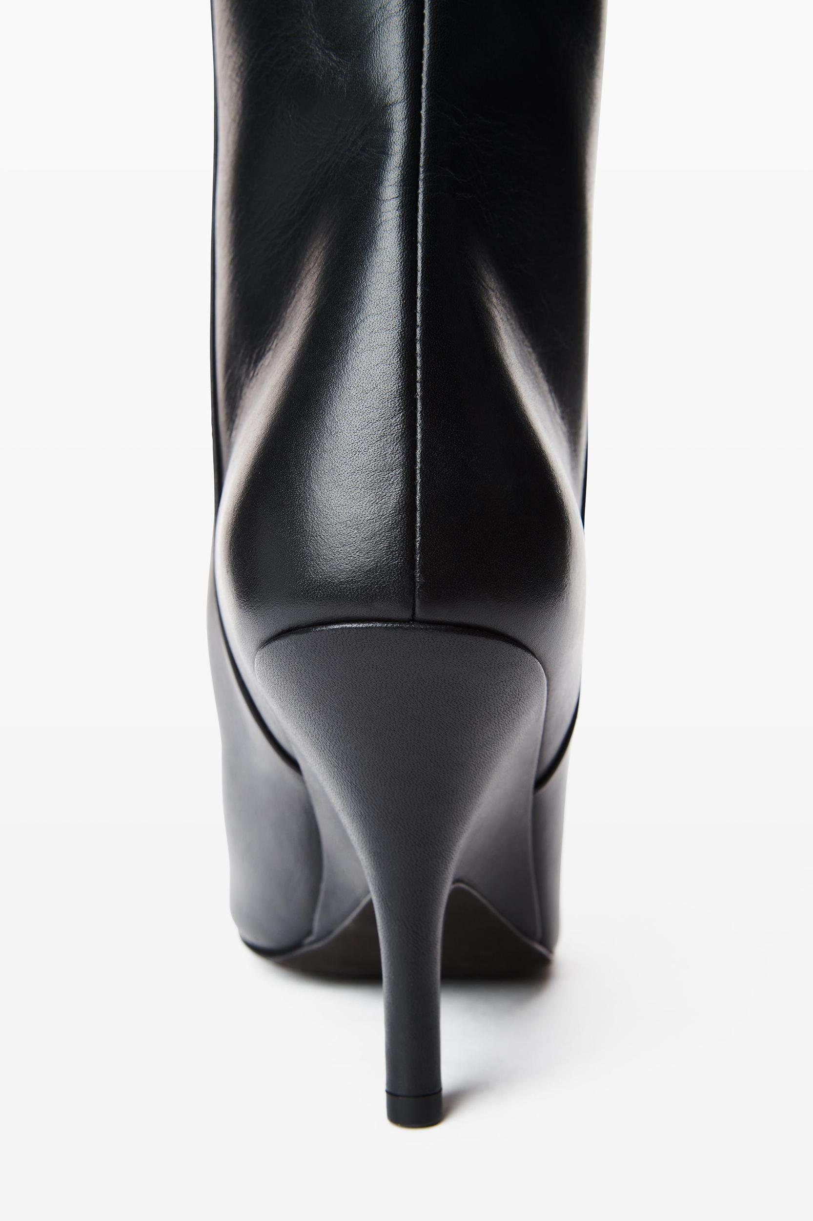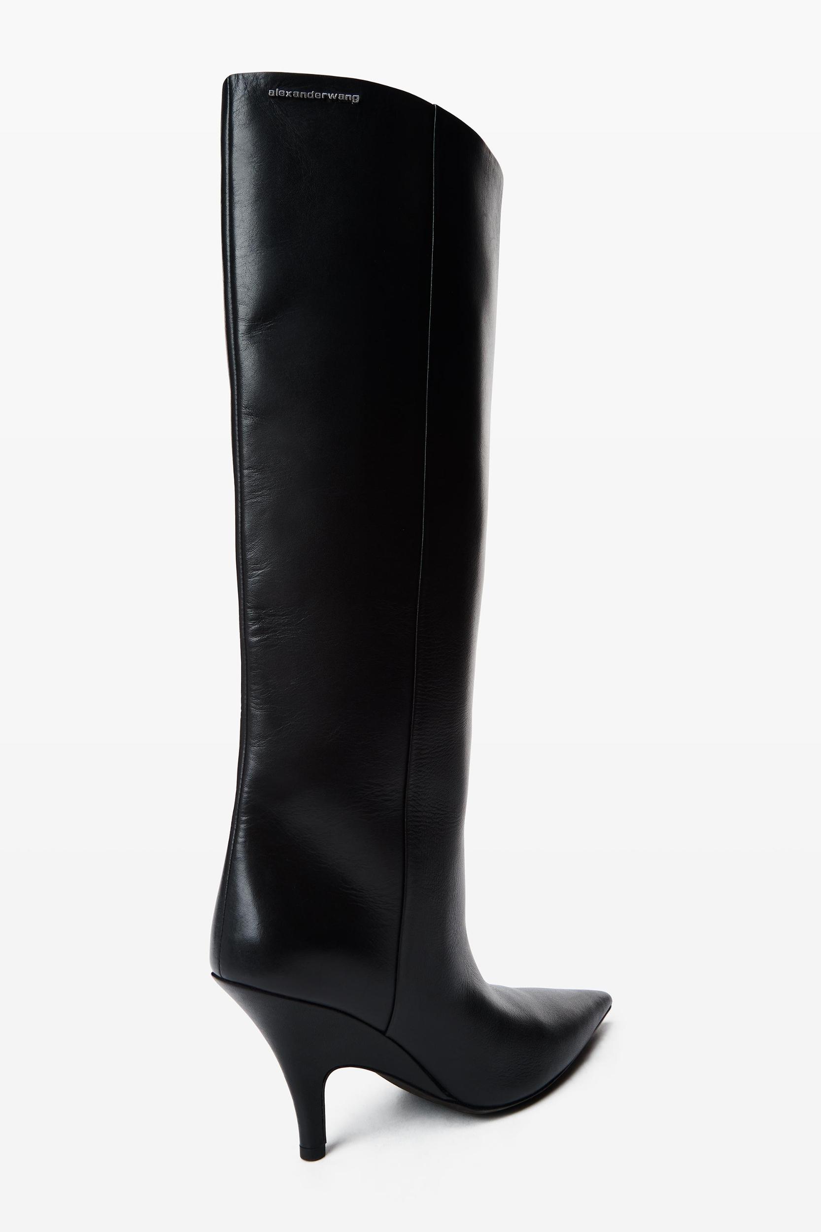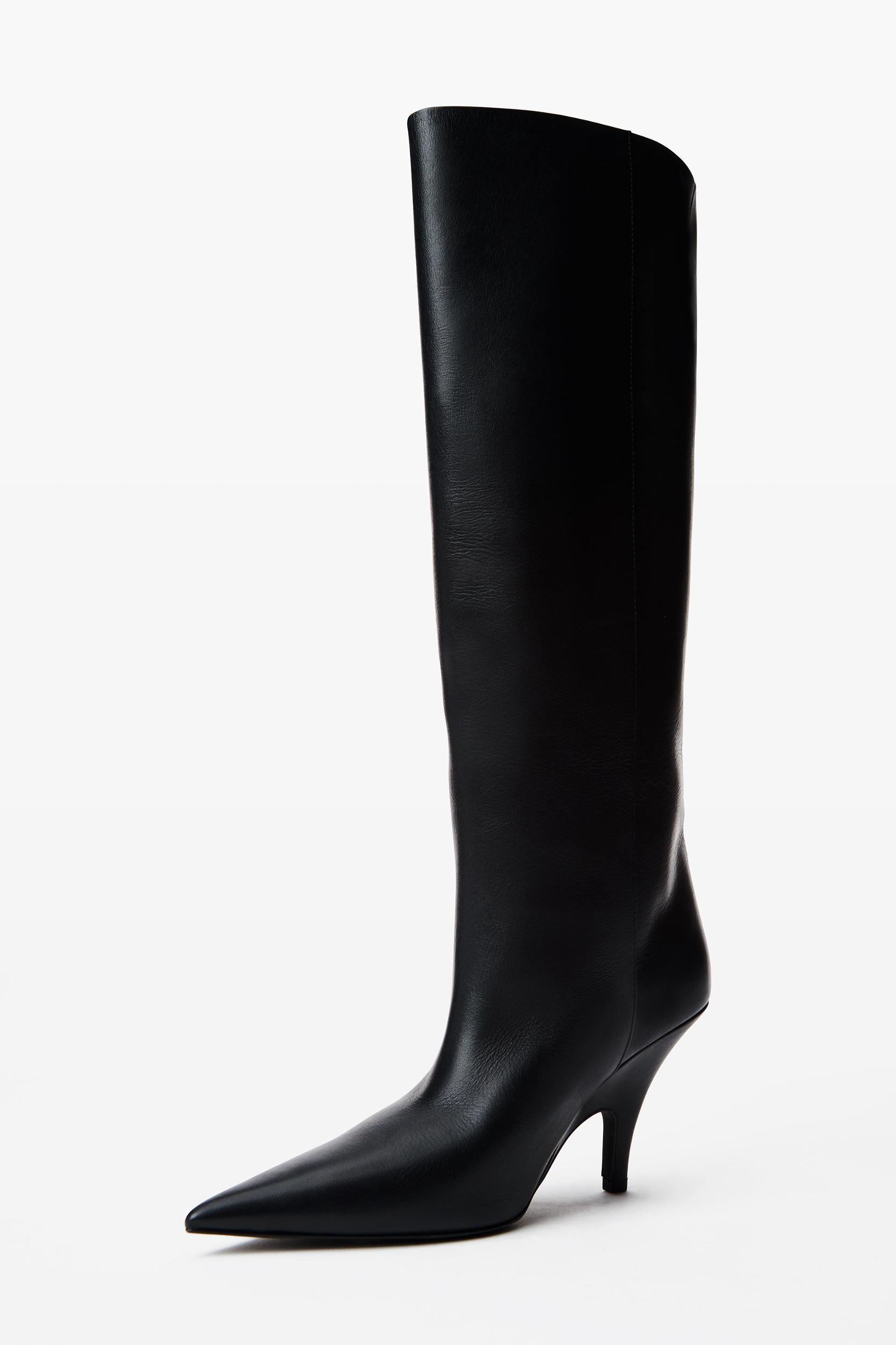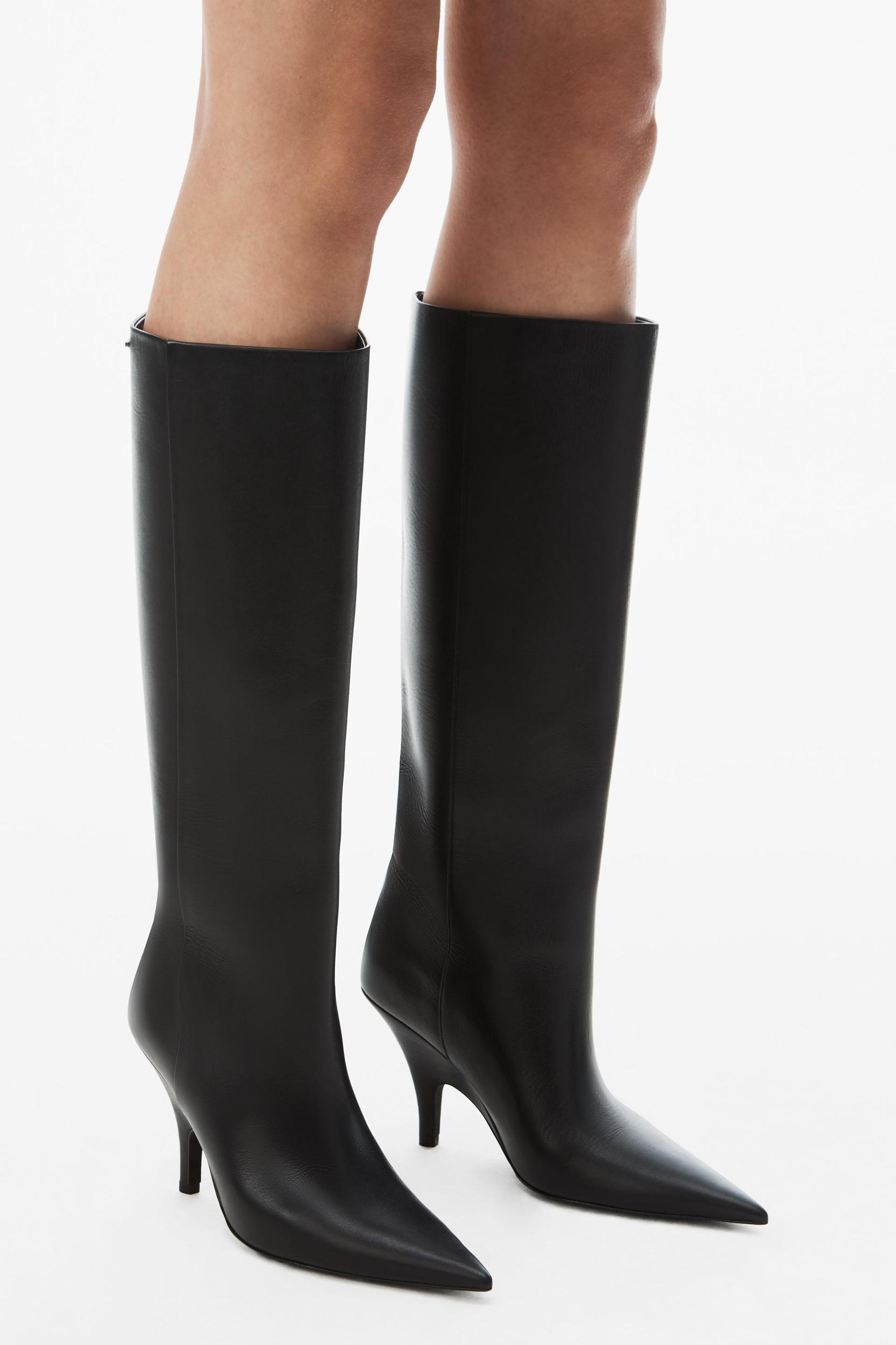 Inspired by a wading boot, the Diablo is crafted of smooth leather and finished with a metal logo lettering. It features a pointed toe, straight shaft and stiletto heel.