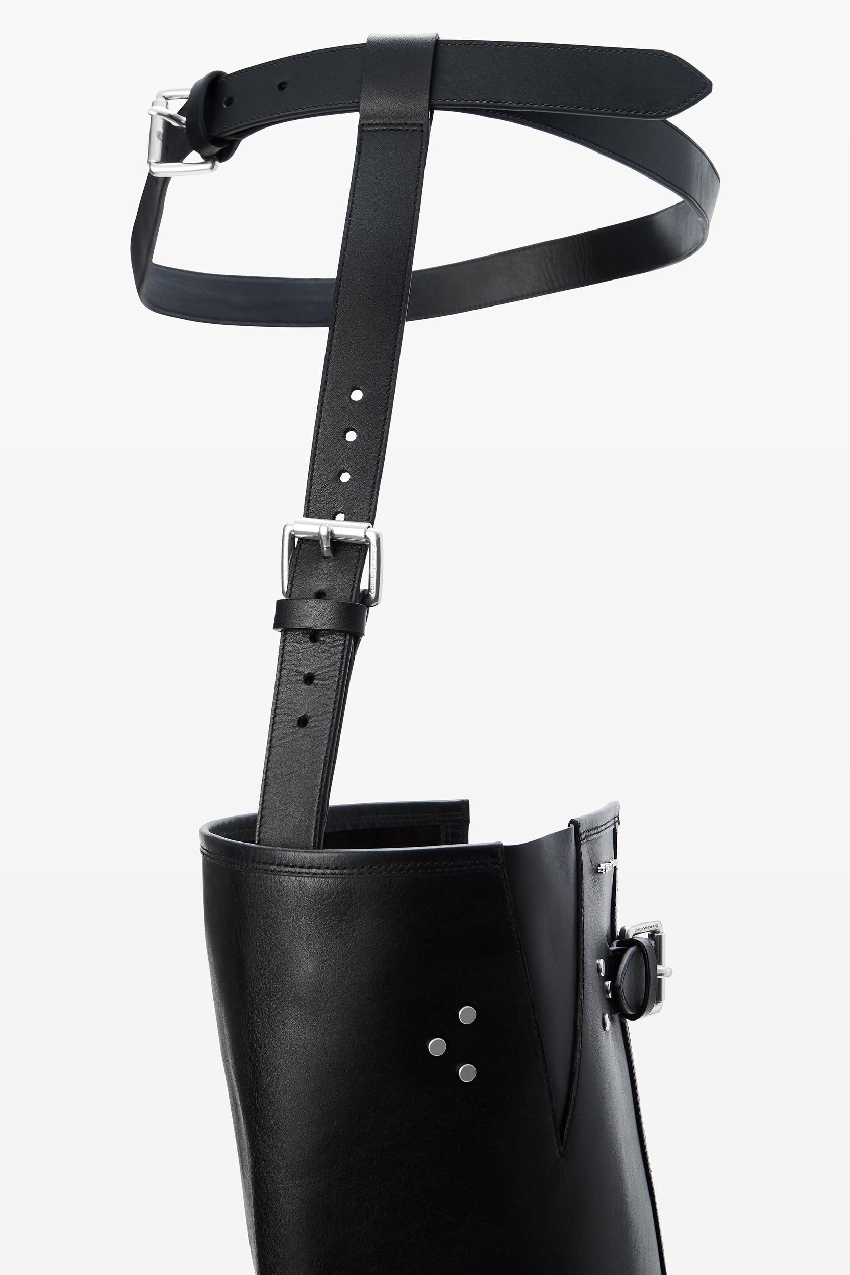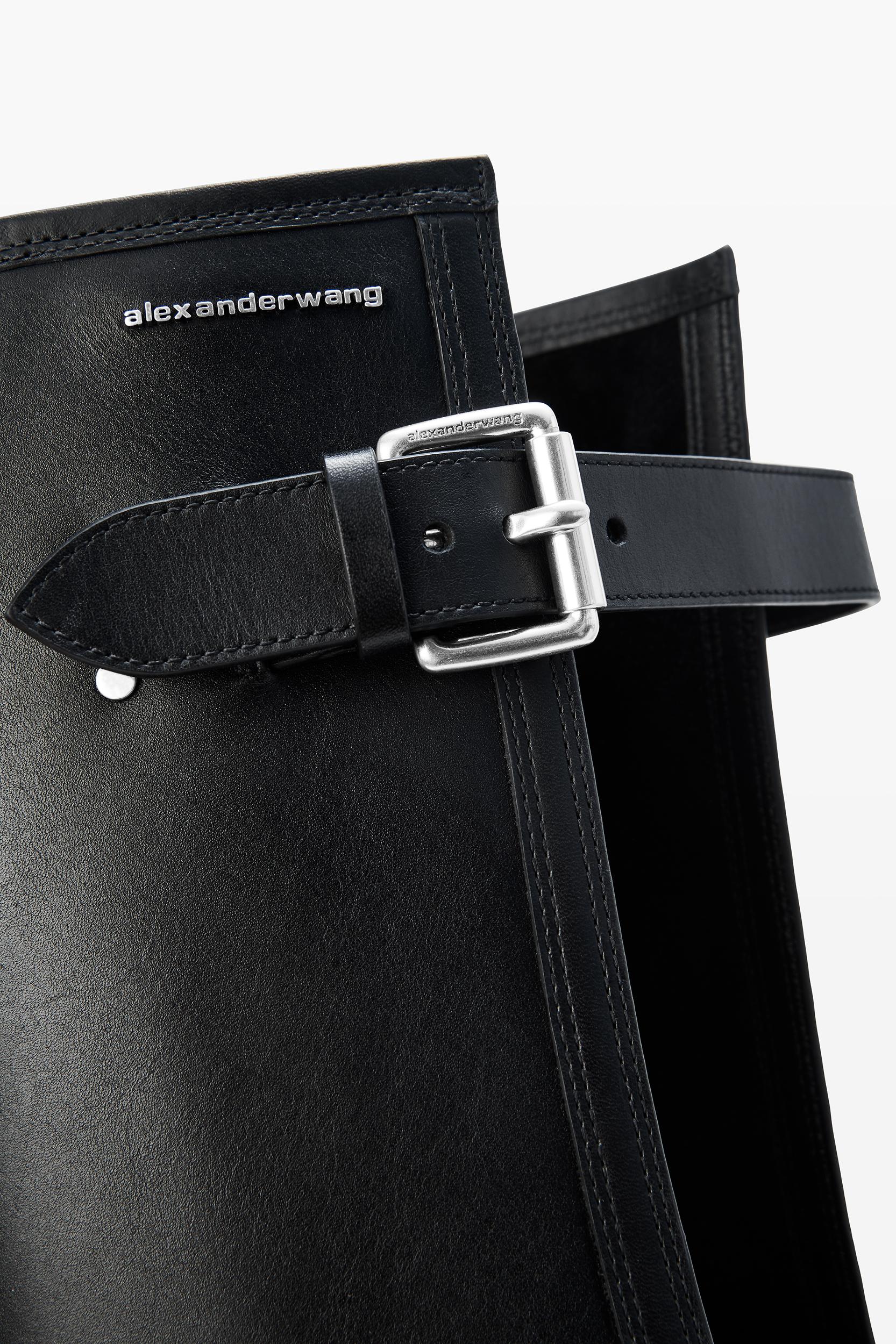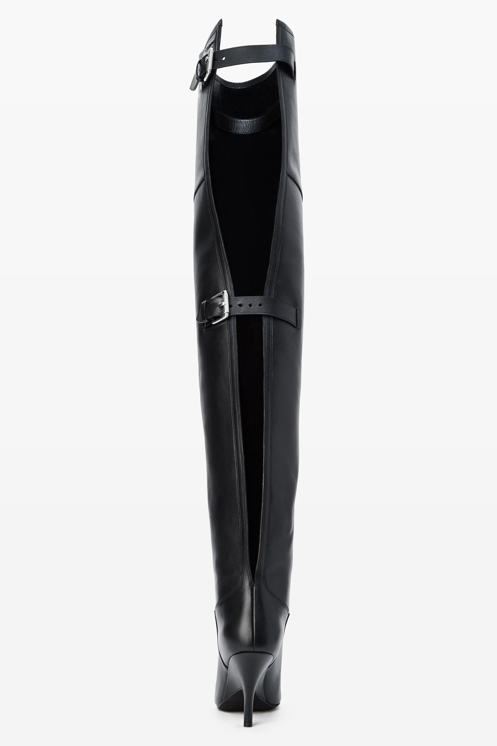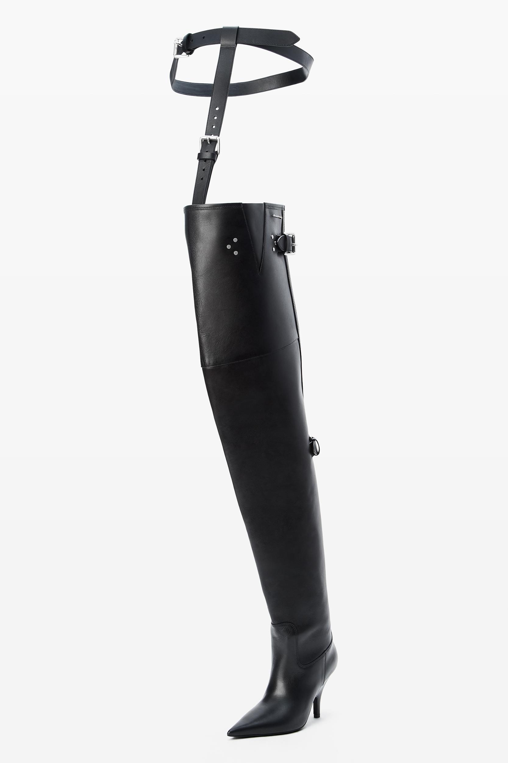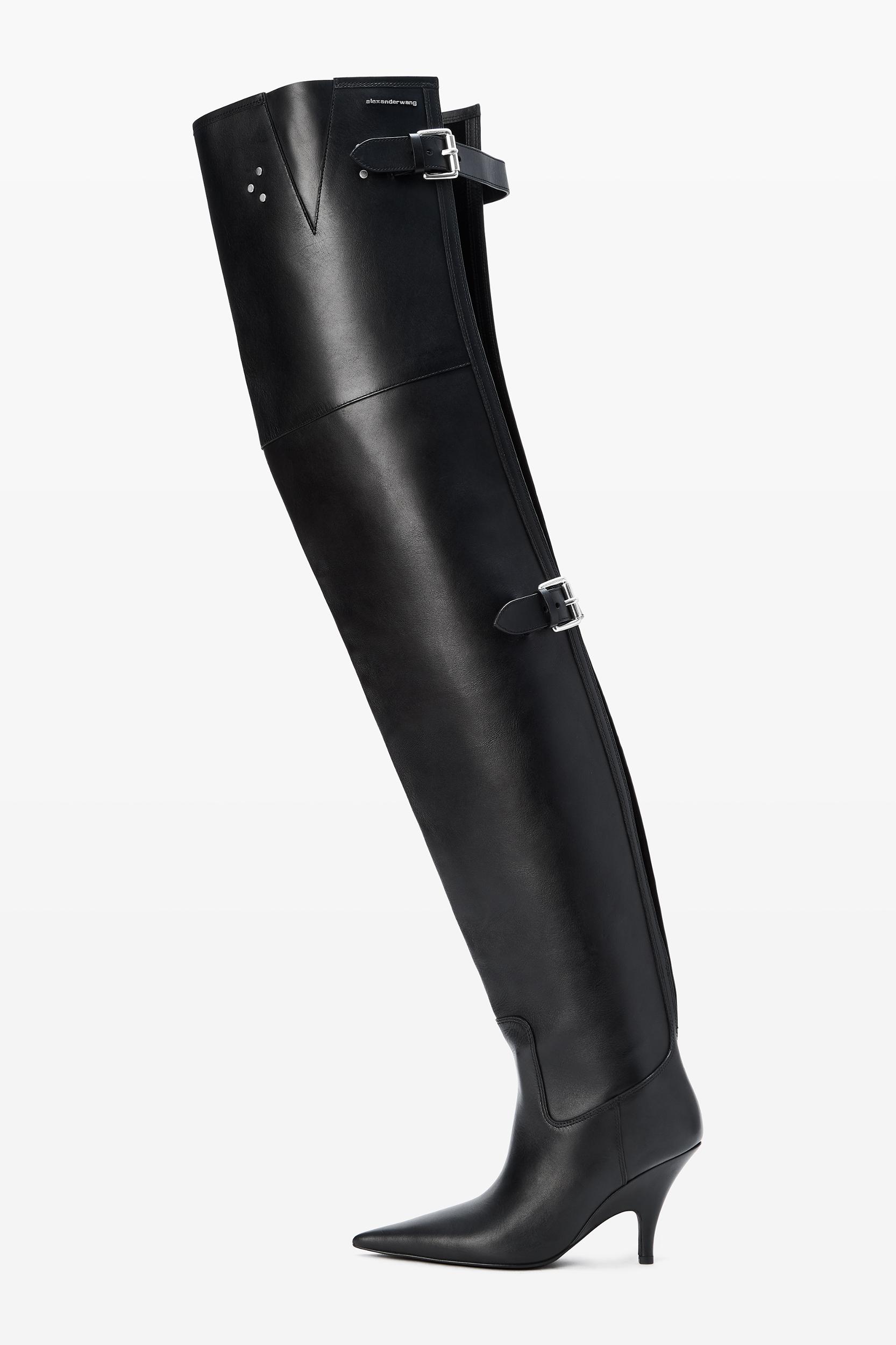 Defined by its thigh-high silhouette, the Diablo is crafted of smooth leather and finished with a metal logo lettering. It features a pointed toe, molded heel and fastens with a belted tab zip closure.