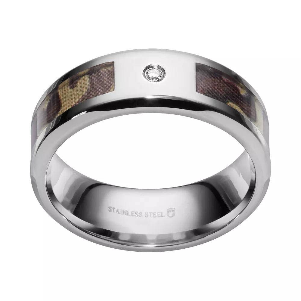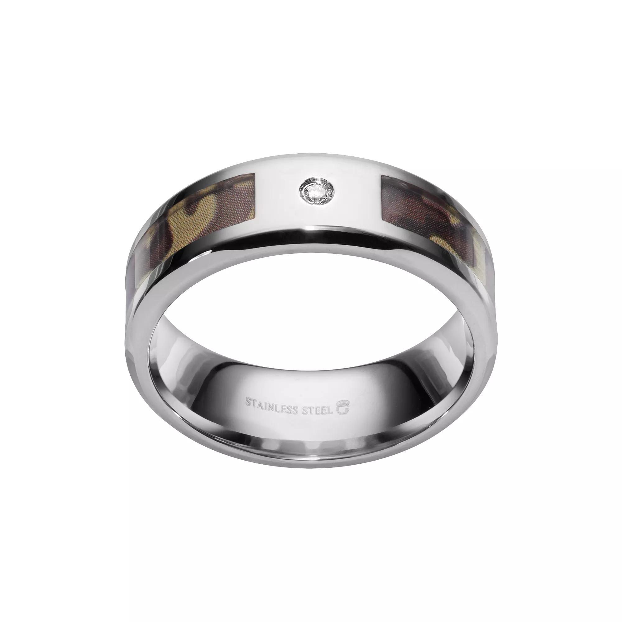 Featuring a brown camouflage stripe and a single diamond accent, this men's stainless steel wedding band is both rugged and refined. Ring Details:Width: 8 mm Metal: stainless steelDiamond Details:Total weight: less than 1/10 ct.Cut: roundSetting: bezelImage(s) may be enlarged to show detail.Diamond weights are approximate. Diamond total weights may vary between .01 and .08 ct. Some diamonds have fewer than 17 facets.Gemstones may have been treated to enhance their appearance. Special care may be required. Please visit our Gemstone Treatment & Special Care Guide for more information. Size: 9. Gender: male. Age Group: adult.