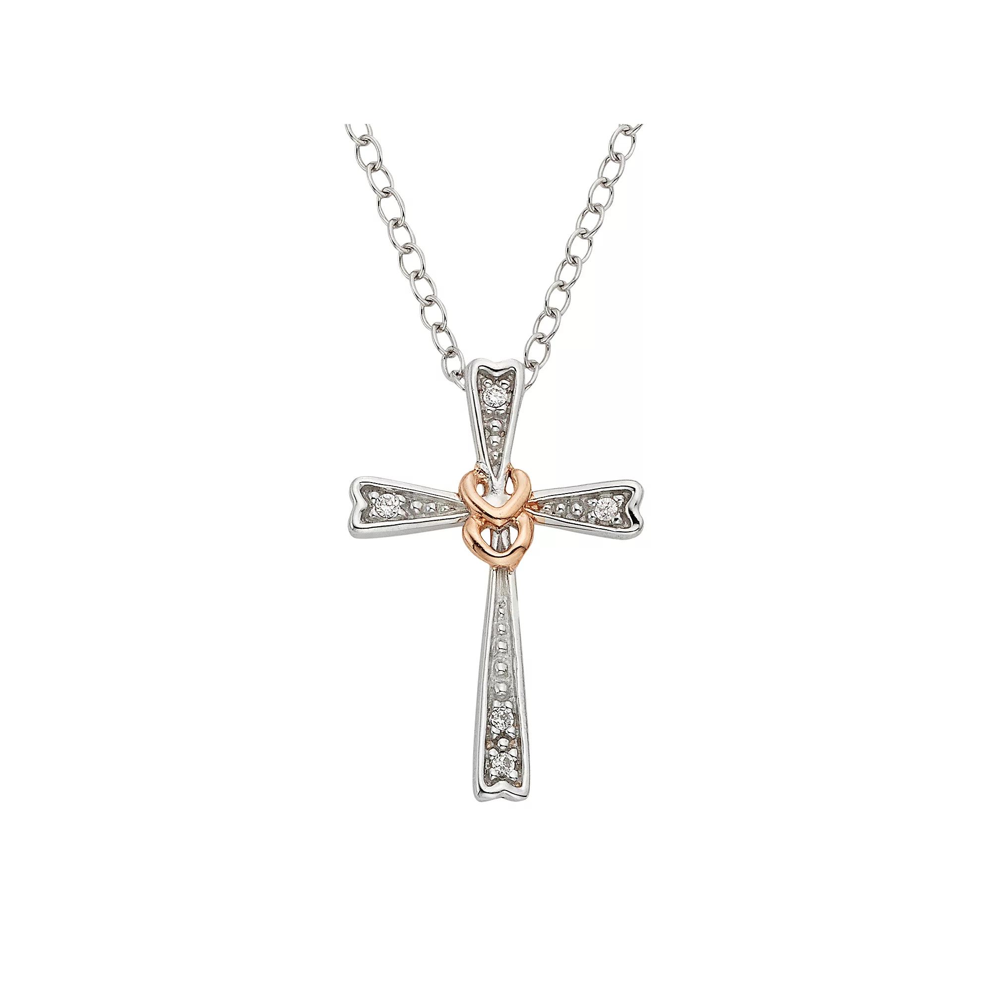 Showcase your faith-filled style when you wear this mesmerizing diamond cross pendant. Comes in a gift box. PENDANT DETAILS Pendant length: .73 in. Chain length: 16 in. with 2-in. extender Clasp: spring-ring Metal: rhodium-plated sterling silver, pink rhodium-plated sterling silver DIAMOND DETAILS Total weight: less than 1/10 ct. Shape: single cut Color grade: H-I Clarity: I2 Setting: pave Image(s) may be enlarged to show detail.Diamond weights are approximate. Diamond total weights may vary between .01 and .08 ct. Some diamonds have fewer than 17 facets. Size: 16. Color: White. Gender: female. Age Group: adult.
