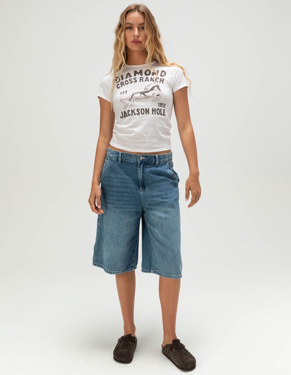 CREAM. Diamond Cross Ranch Blue Horse Baby Tee. Large graphic screened on front. Logo screened at lower back. Baby tee. Crew neck. Short sleeve. 50% Cotton 50% Polyester. Machine wash. Imported.