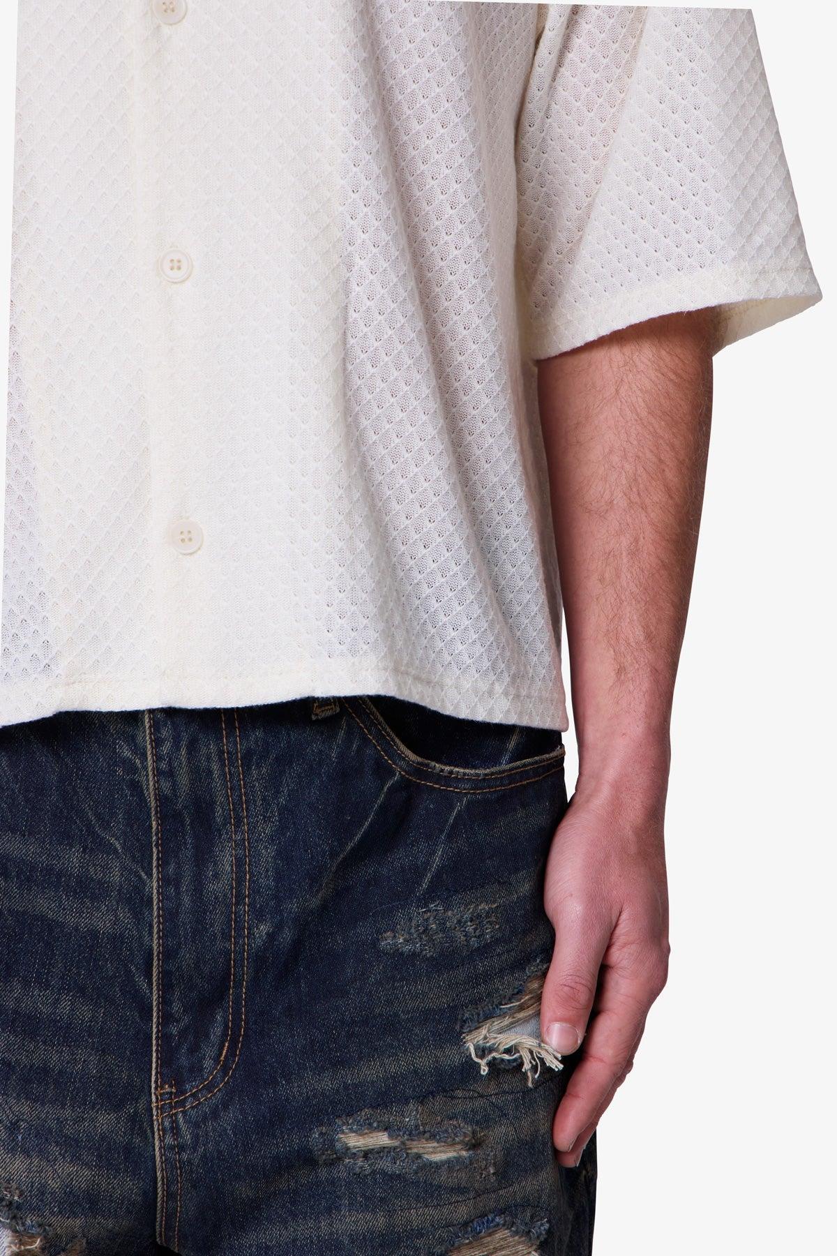 Constructed from a stock-dyed knit blend of 92% polyester and 8% spandex, the Diamond Knit Shirt features a cropped, boxy, and wide fit. Designed with a textured diamond knit pattern, it includes a notched collar and full button closure. details Cropped, boxy, wide fit 92% Polyester 8% Spandex knit Diamond knit pattern