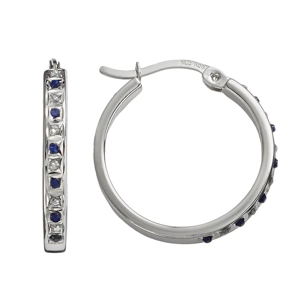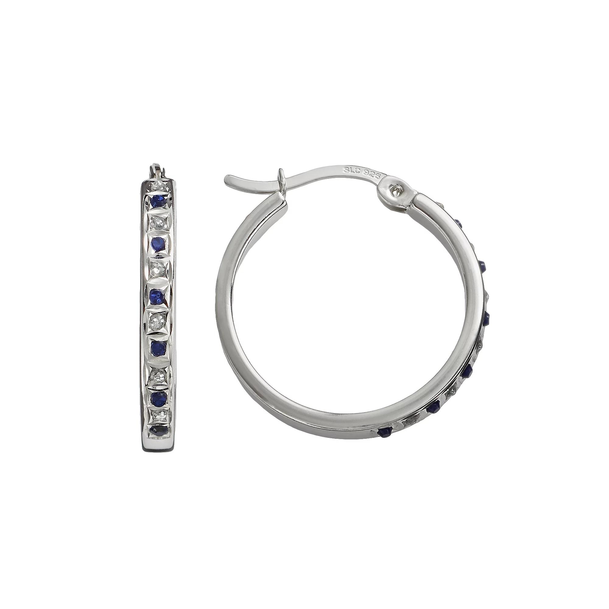 Alternating sapphire stones and diamond accents give these hoop earrings a dazzling glow. Comes in a gift box.Earring Details: Diameter: .75 in. Backings: click-it Metal: platinum over sterling silver Model no. SDF21615SW Stone Details: Stone type: genuine sapphire Cut: round Diamond Details: Total weight: less than 1/10 ct. Cut: round Image(s) may be enlarged to show detail. Diamond weights are approximate. Diamond total weights may vary between .01 and .08 ct. Some diamonds have fewer than 17 facets.Gemstones may have been treated to enhance their appearance. Special care may be required. Please visit our Gemstone Treatment & Special Care Guide for more information. Size: One Size. Color: White. Gender: female. Age Group: adult. Material: Platinum Over Silver.