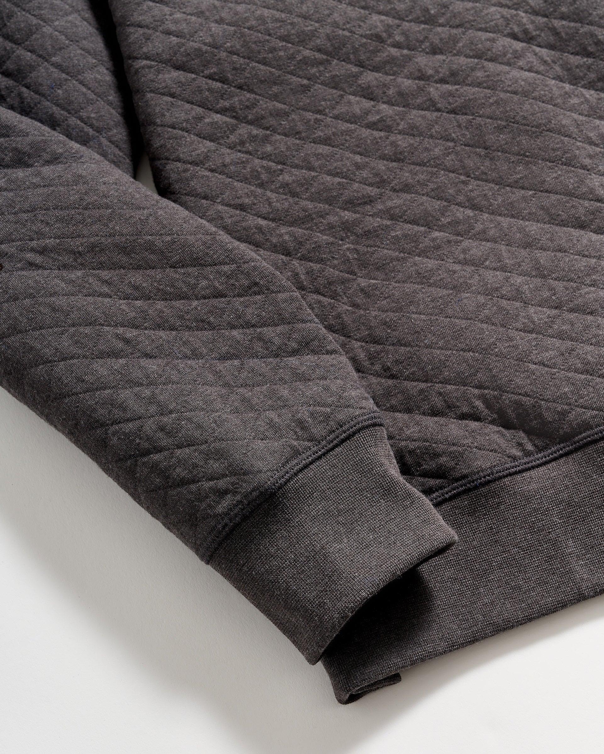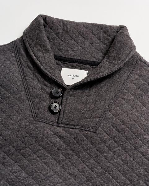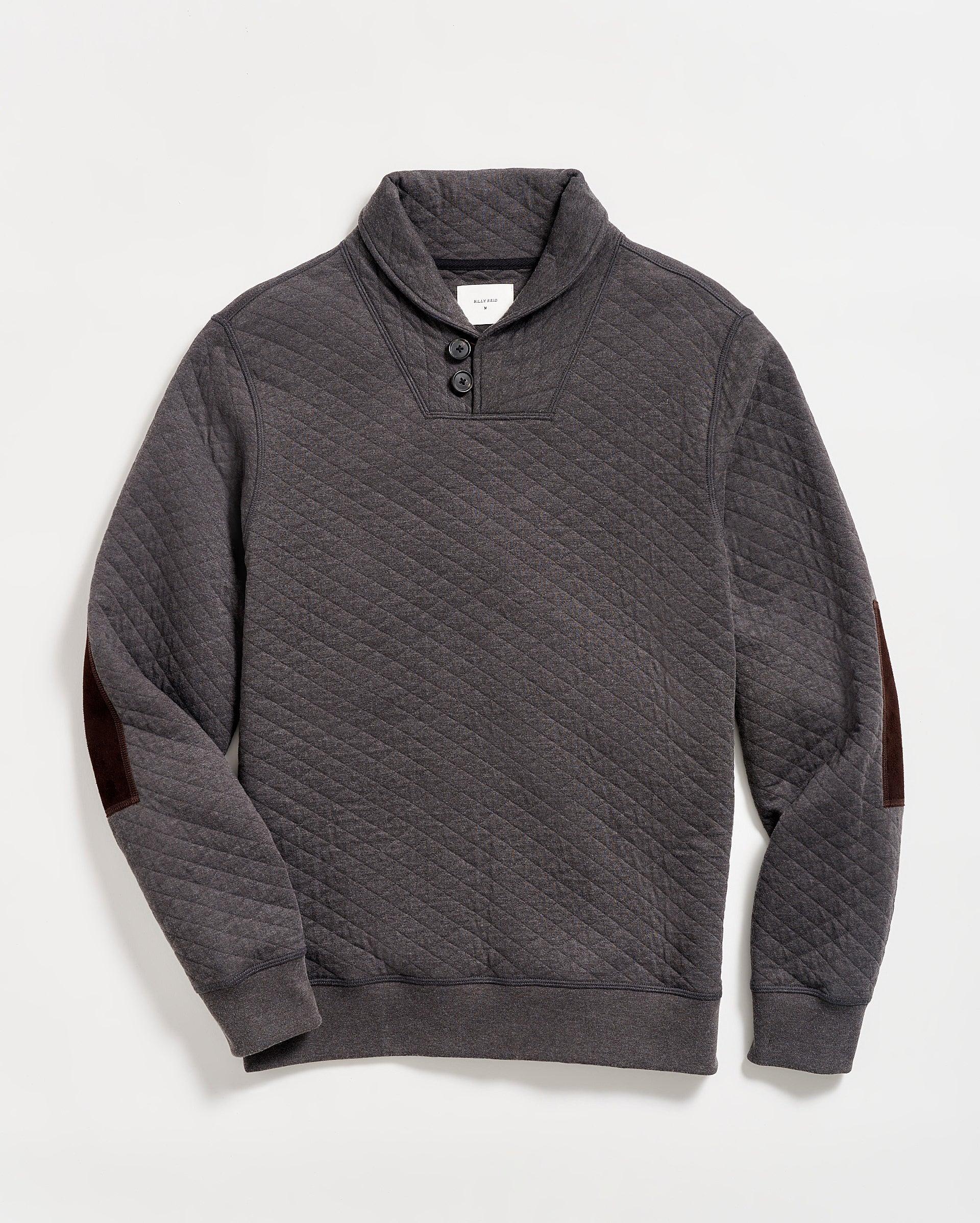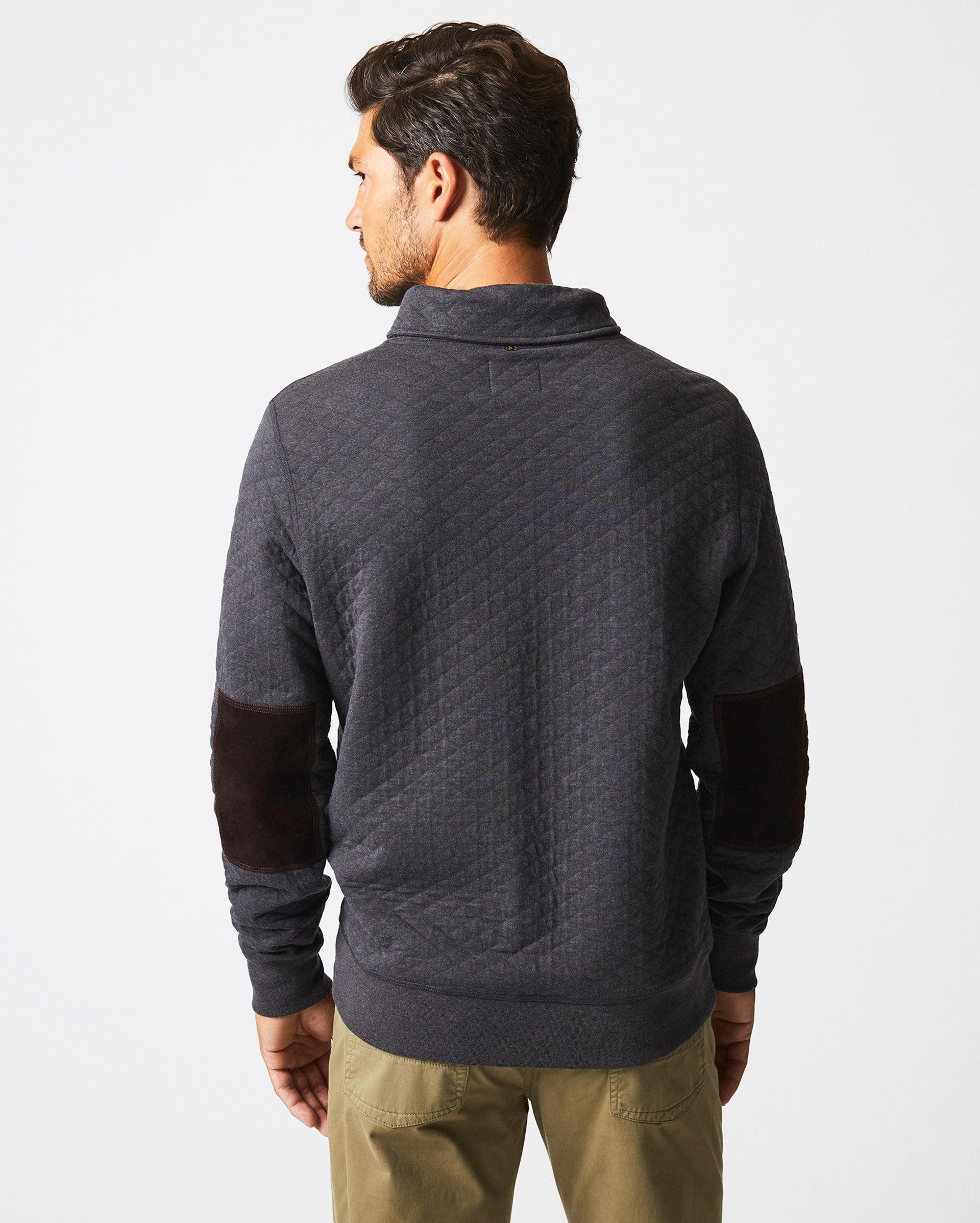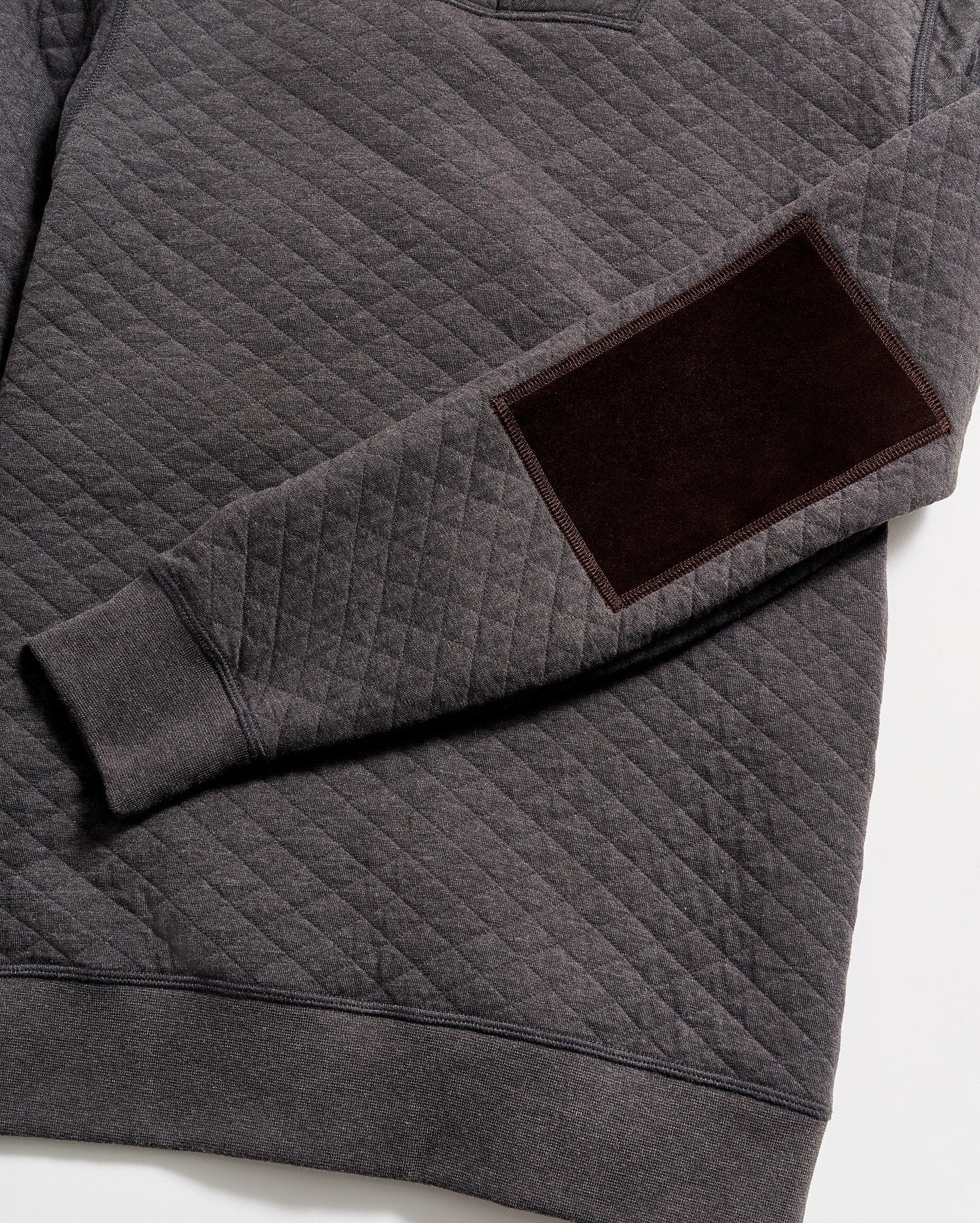 A smart and versatile layering piece, the Diamond Quilt Shawl features suede elbow patches and leather button loops, crafted from a lightweight cotton blend.