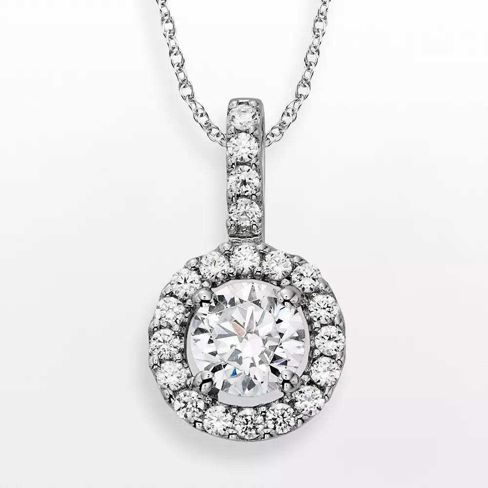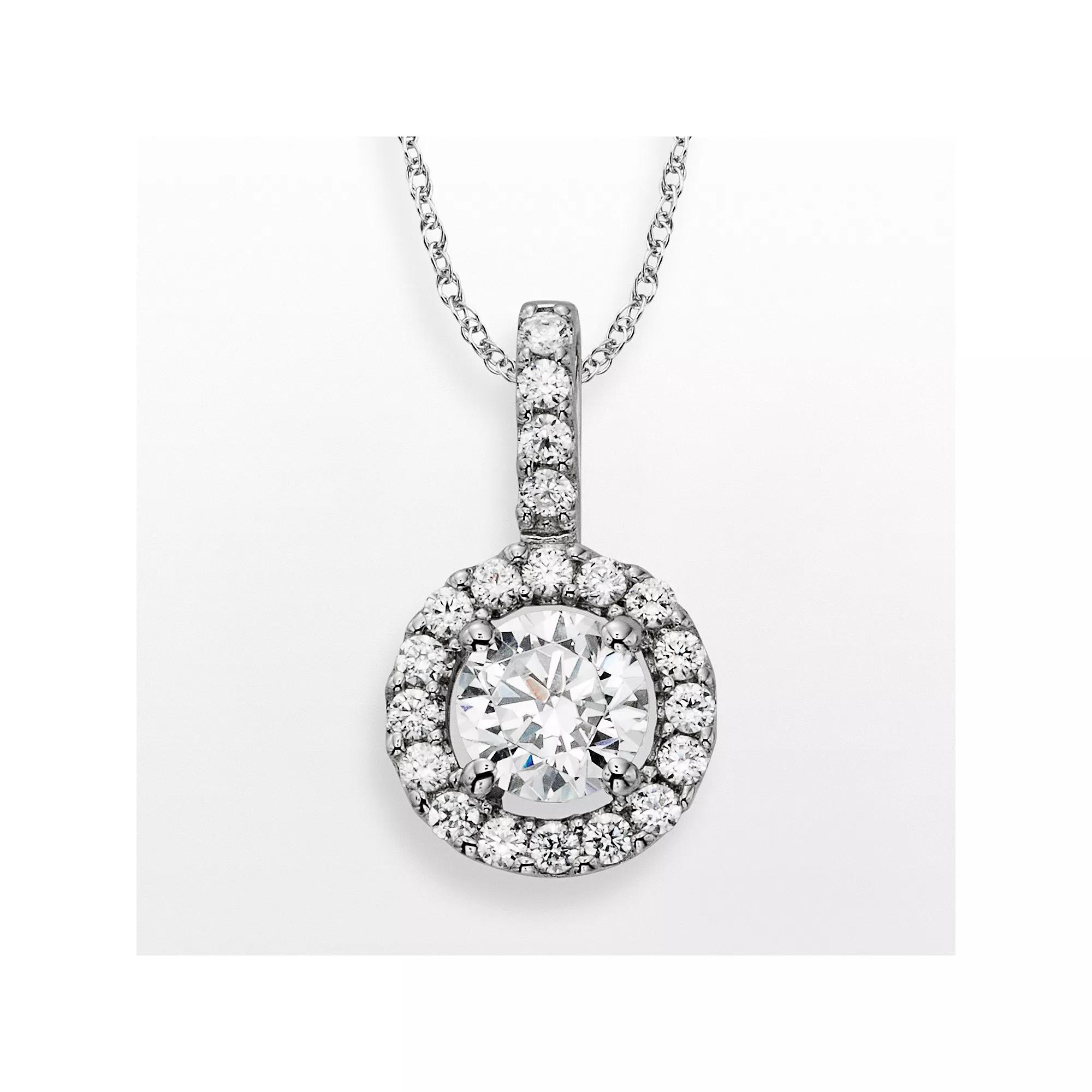 Watch her eyes light up over this simulated diamond halo pendant from Diamonore. Pendant Details: Pendant length: .41 in. Chain length: 16 in. Clasp: spring-ring Metal: rhodium-plated sterling silver Diamonore Details: Diamond equivalent total weight: 1 1/2 ct. Cut: round Setting: prong Diamond equivalent carat (ct.) Total Weight (T.W.) represents the approximate total weight of diamonds of equivalent appearance. Gemstones may have been treated to enhance their appearance. Special care may be required. Please visit our Gemstone Treatment & Special Care Guide for more information. Size: 16". Color: White. Gender: female. Age Group: adult.