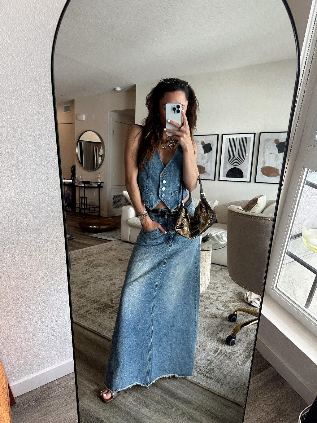 Smart, sophisticated, easy, and fab, our Diane Denim Vest is perfect for the office or casual weekends with your tribe. The newest color-way to our best selling white Diane Pinstripe Vest, this style is perfect for the warm-weather months ahead. You can’t help but look and feel cool while wearing it.