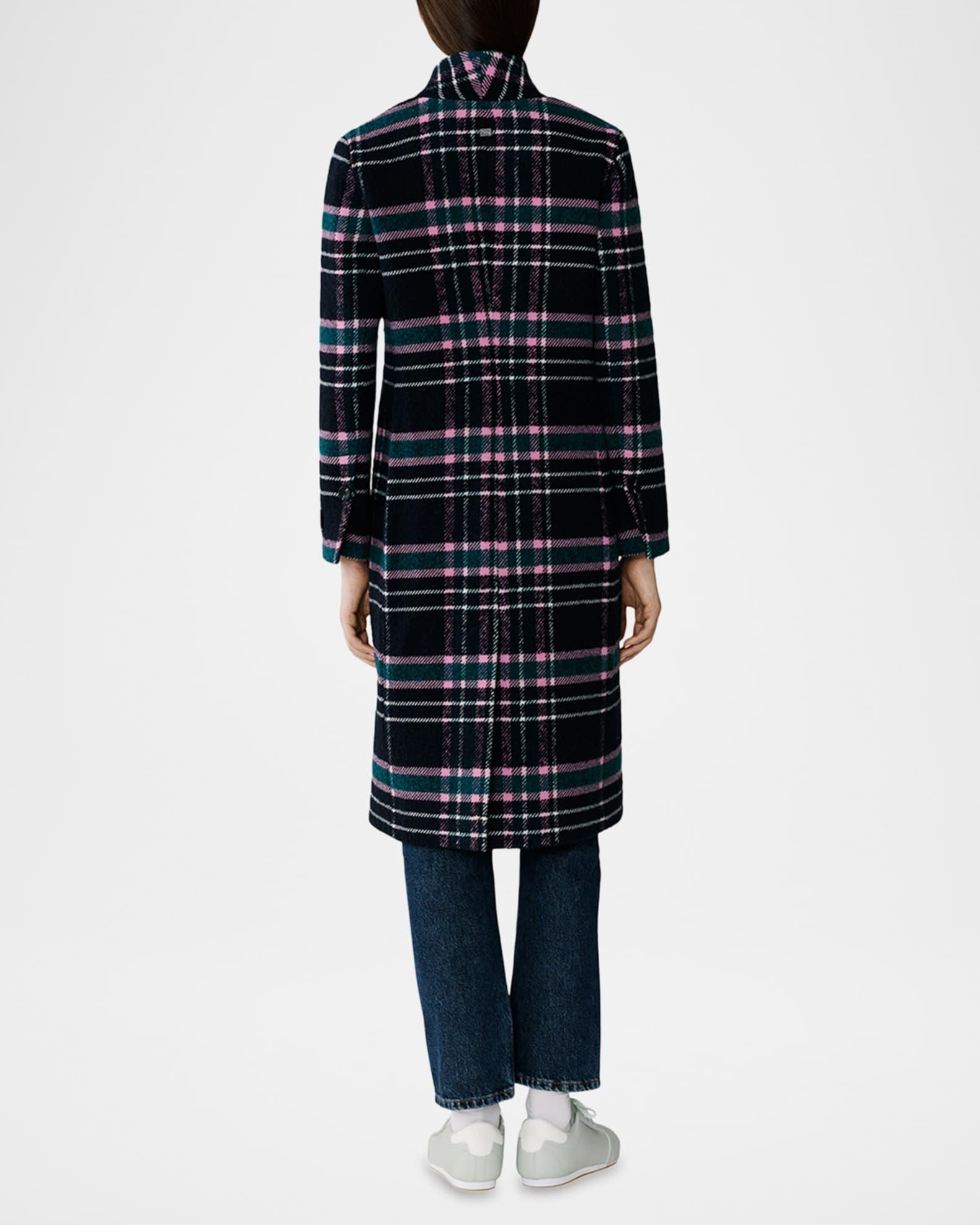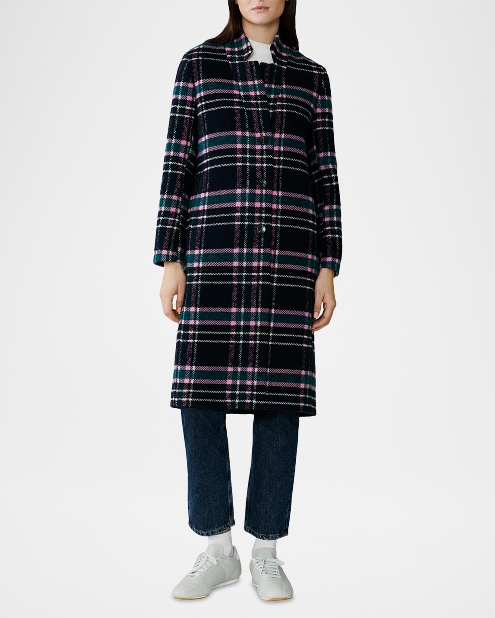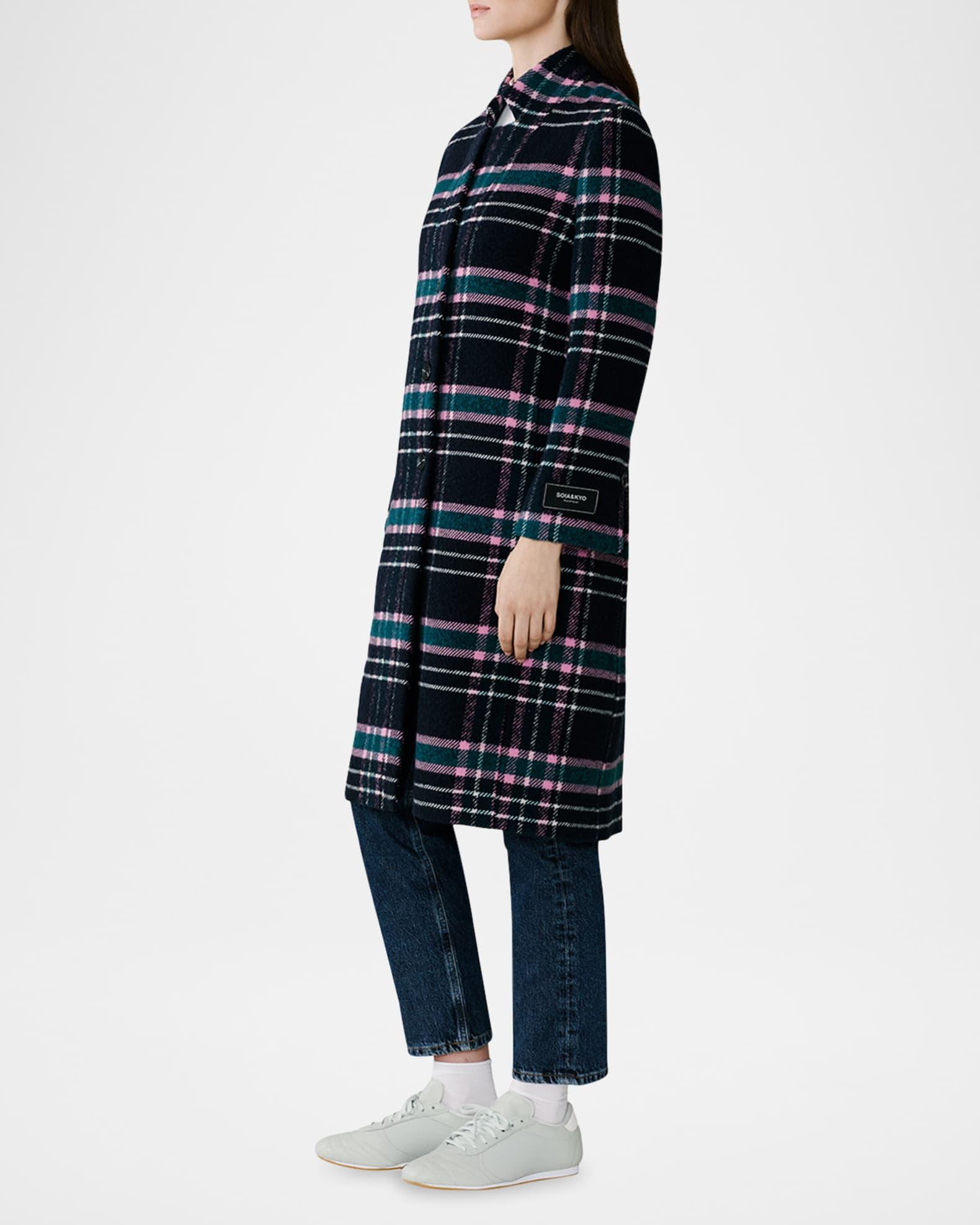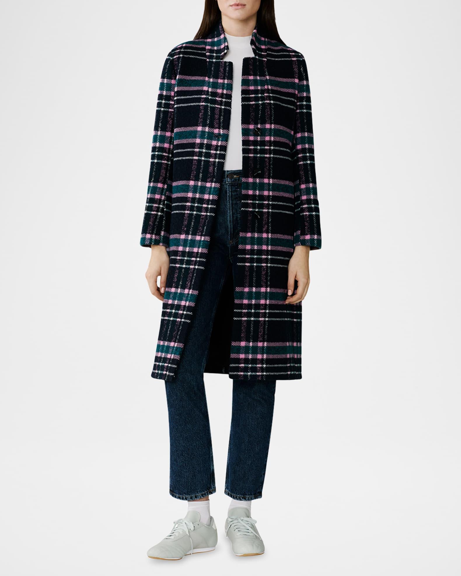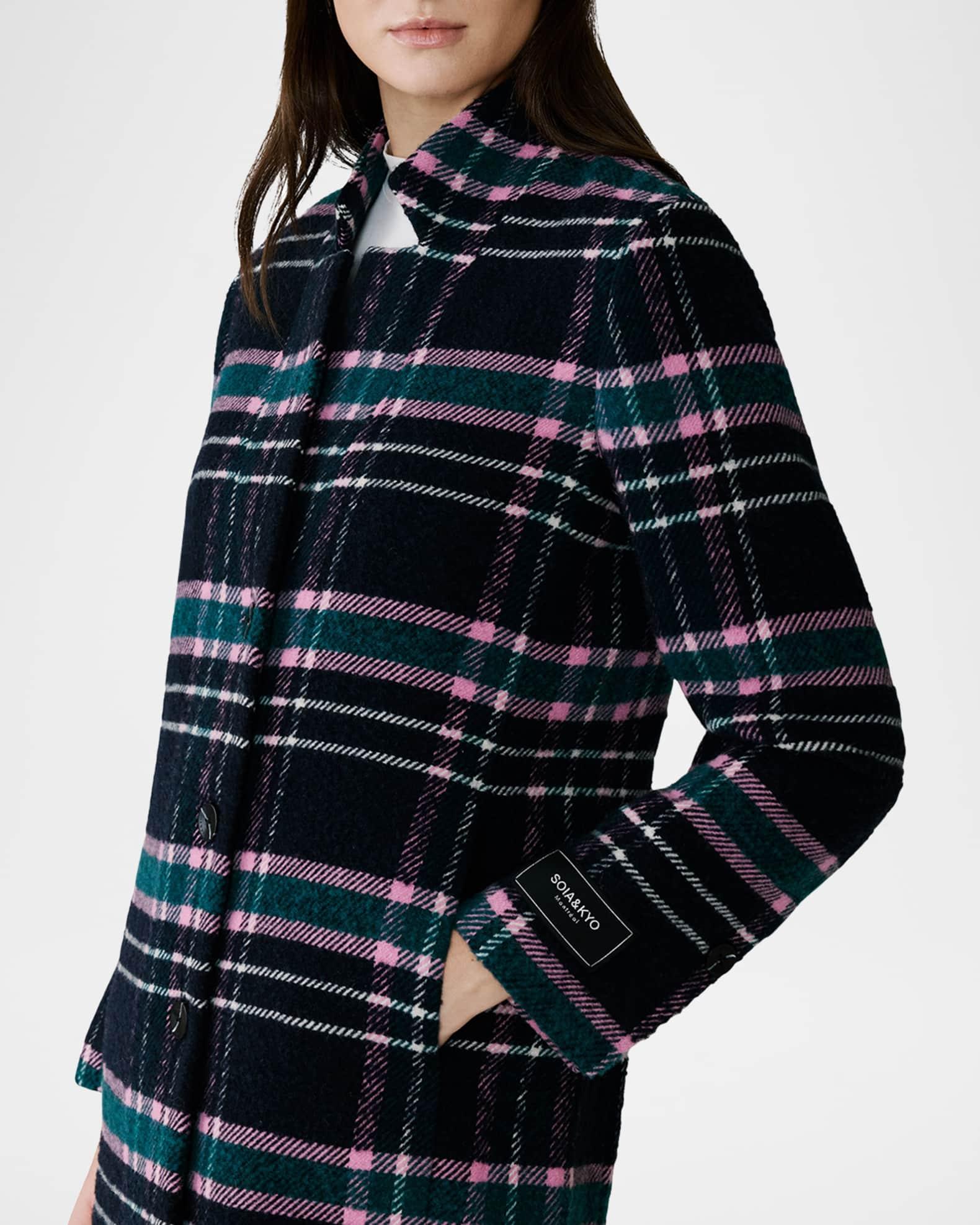 Featuring a vibrant plaid print, the "Diane-C" coat by Soia & Kyo is crafted from a soft wool blend and offers a classic silhouette with subtle tailoring throughout. Notched lapels Single-breasted front Long sleeves with vented cuffs Side pockets Classic fit Walking vent Button-front Wool/polyester/acrylic Lining: Polyester Dry clean Imported