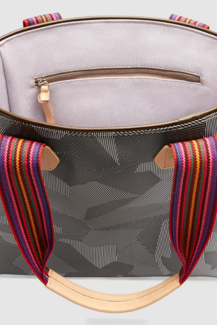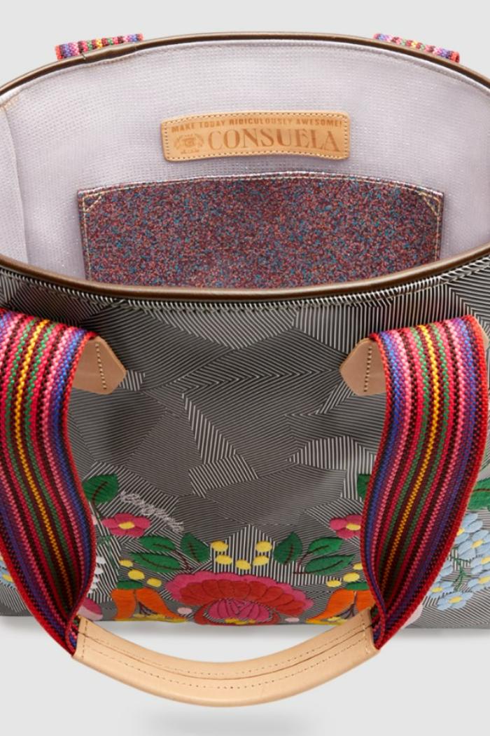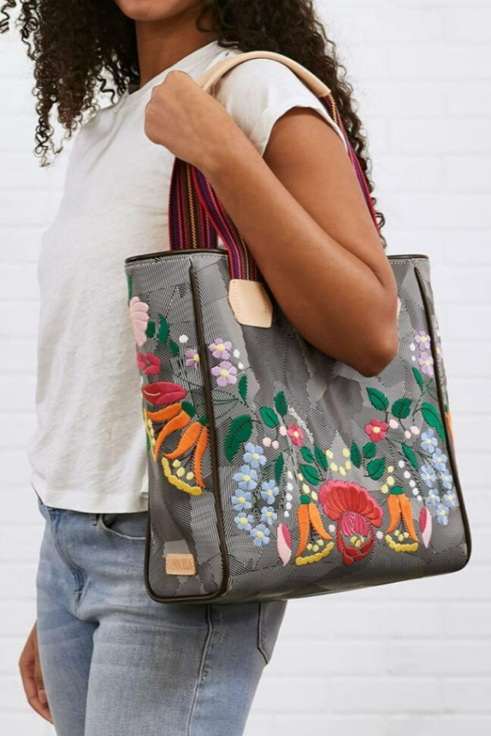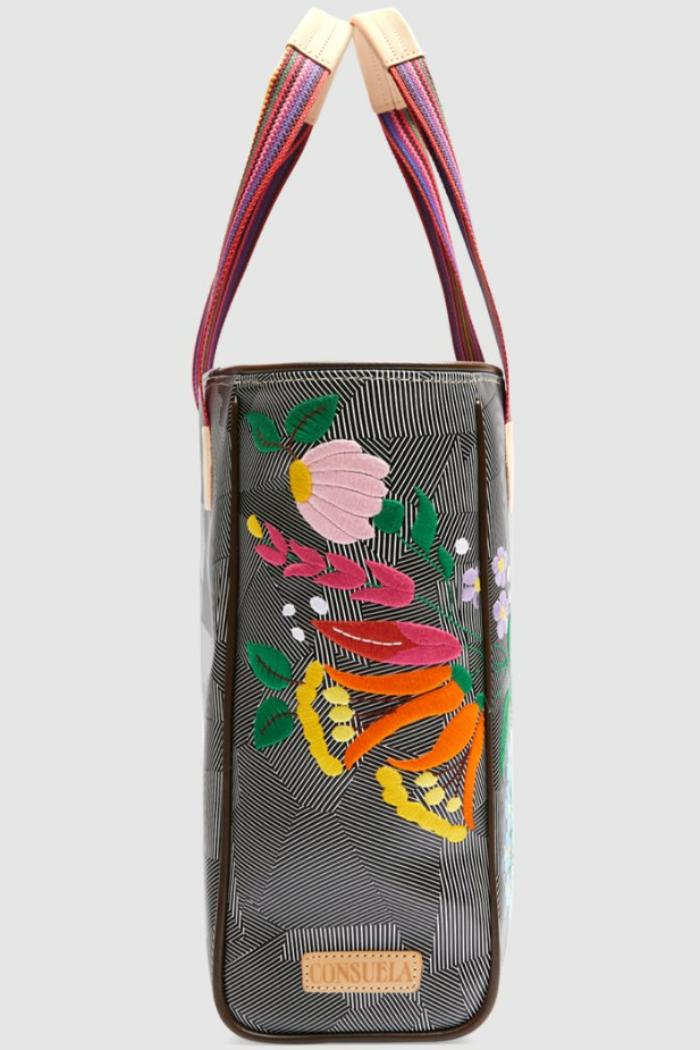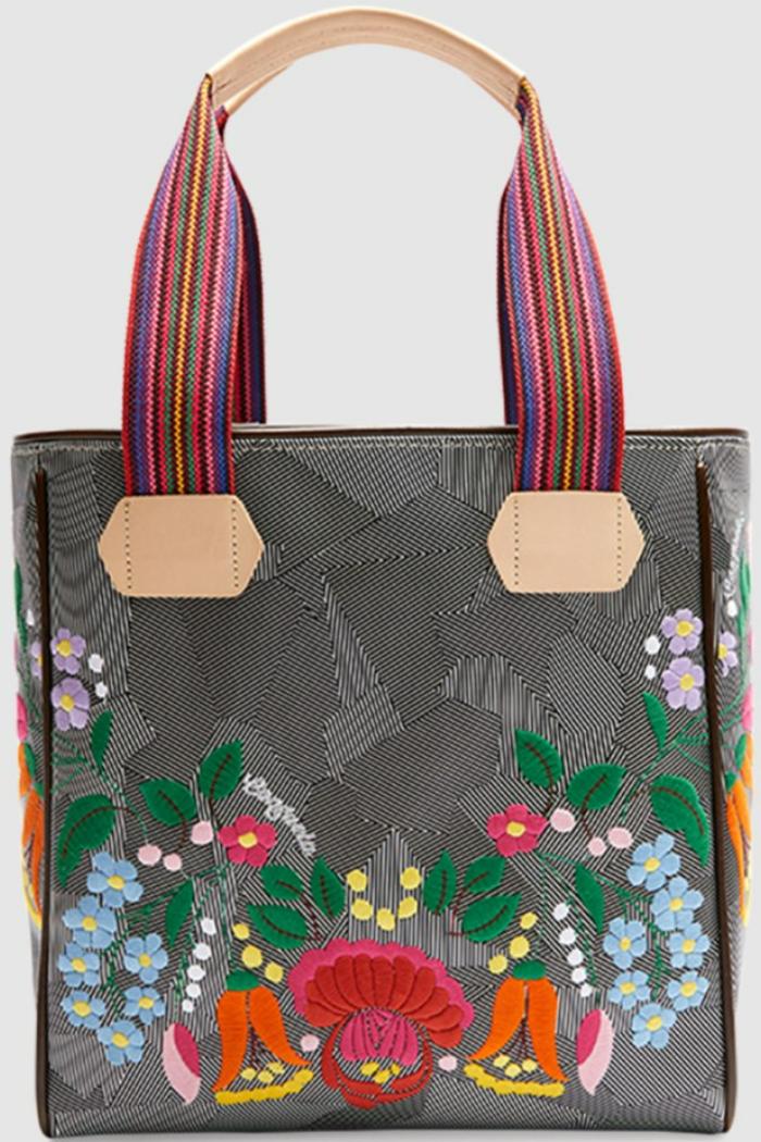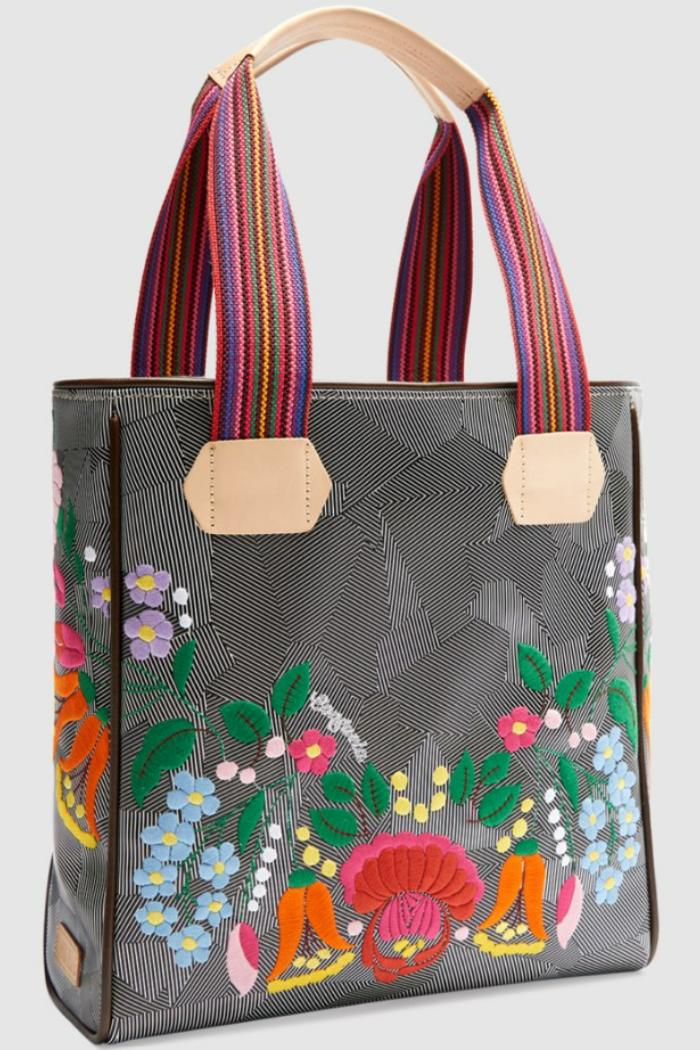 The Consuela Classic Tote simply stands the test of time, this silhouette has been a Consuela Classic since the beginning. The Classic Tote holds its shape as it takes on the journey with you, carrying the essentials and bringing the energy too. Tote Features: embroidered textured exterior, Diego natural leather accents, interior open pocket and zipper pocket, signature woven handles for long-wear and comfort. Dimensions: 13 1/2” (W) x 13 1/2” (H) x 5 1/2” (D), 8 1/2” Drop