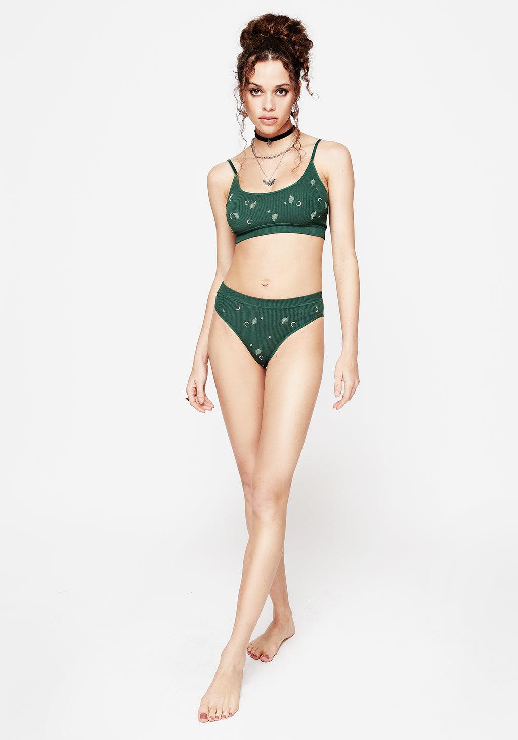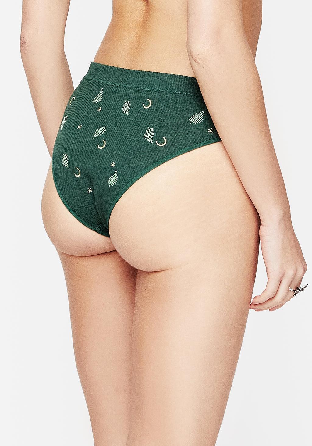 Infernal & forever- Green fern & moon embroidered high-leg briefs - Mid-rise fit with high legs for a cheeky finish - Ribbed waistband keeps garment in place - Stretchy ribbed fabrication with a smooth inner lining - Green & cream fern frond & moon embroidery on a deep green base - A fun base layer for sheer styles! 70% viscose, 25% polyamide, 5% elastane