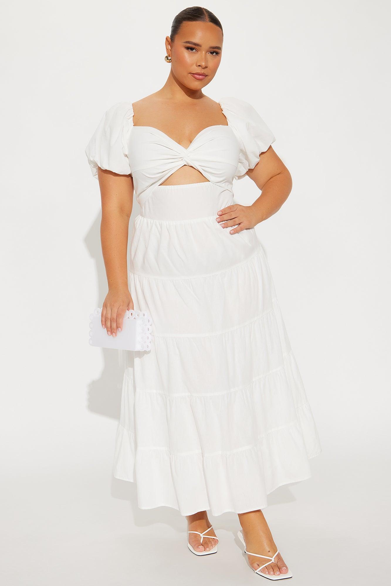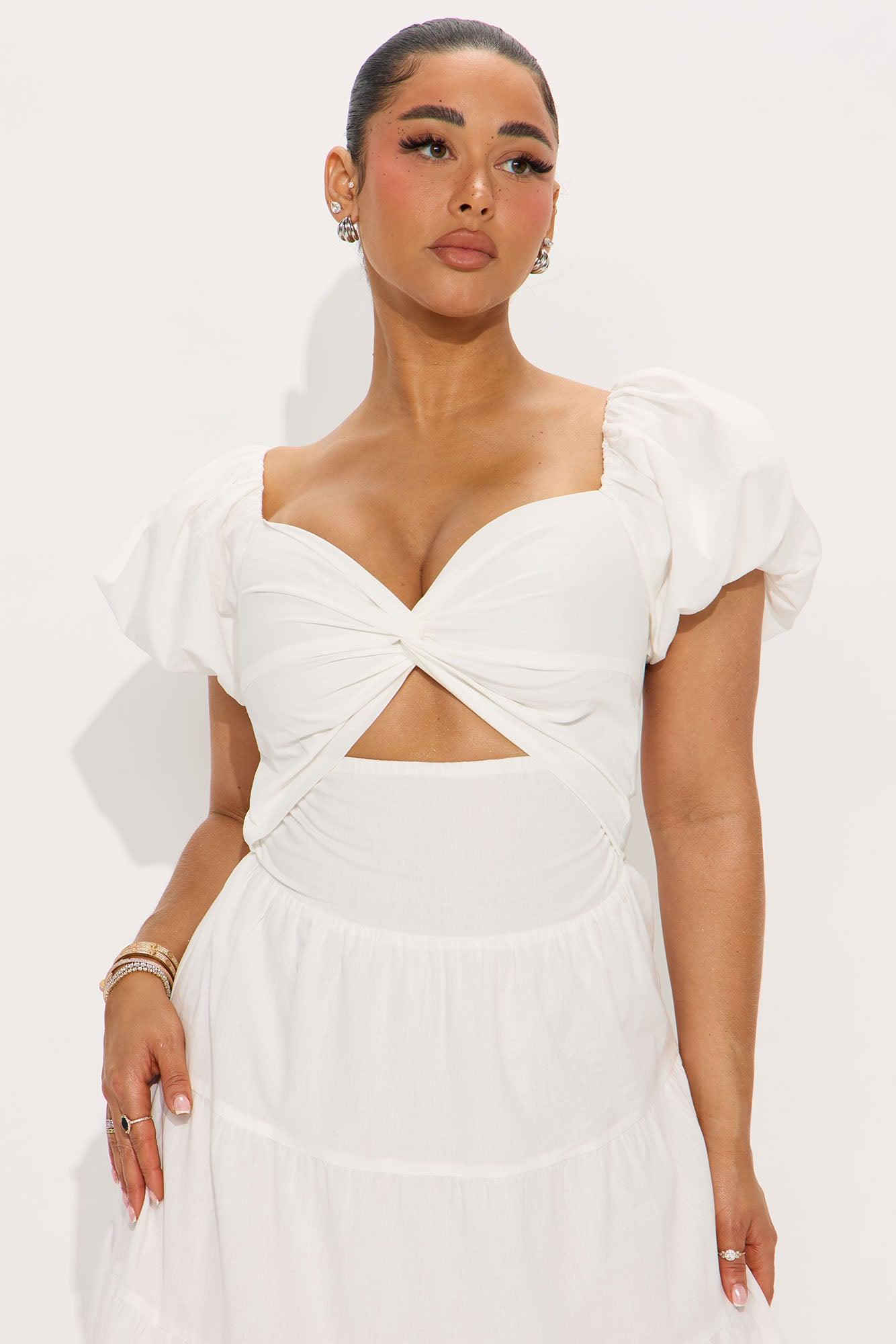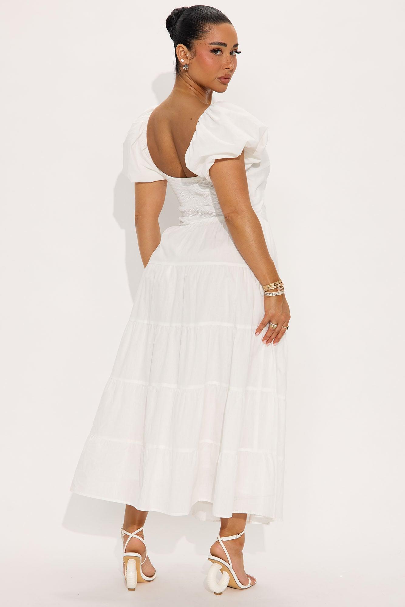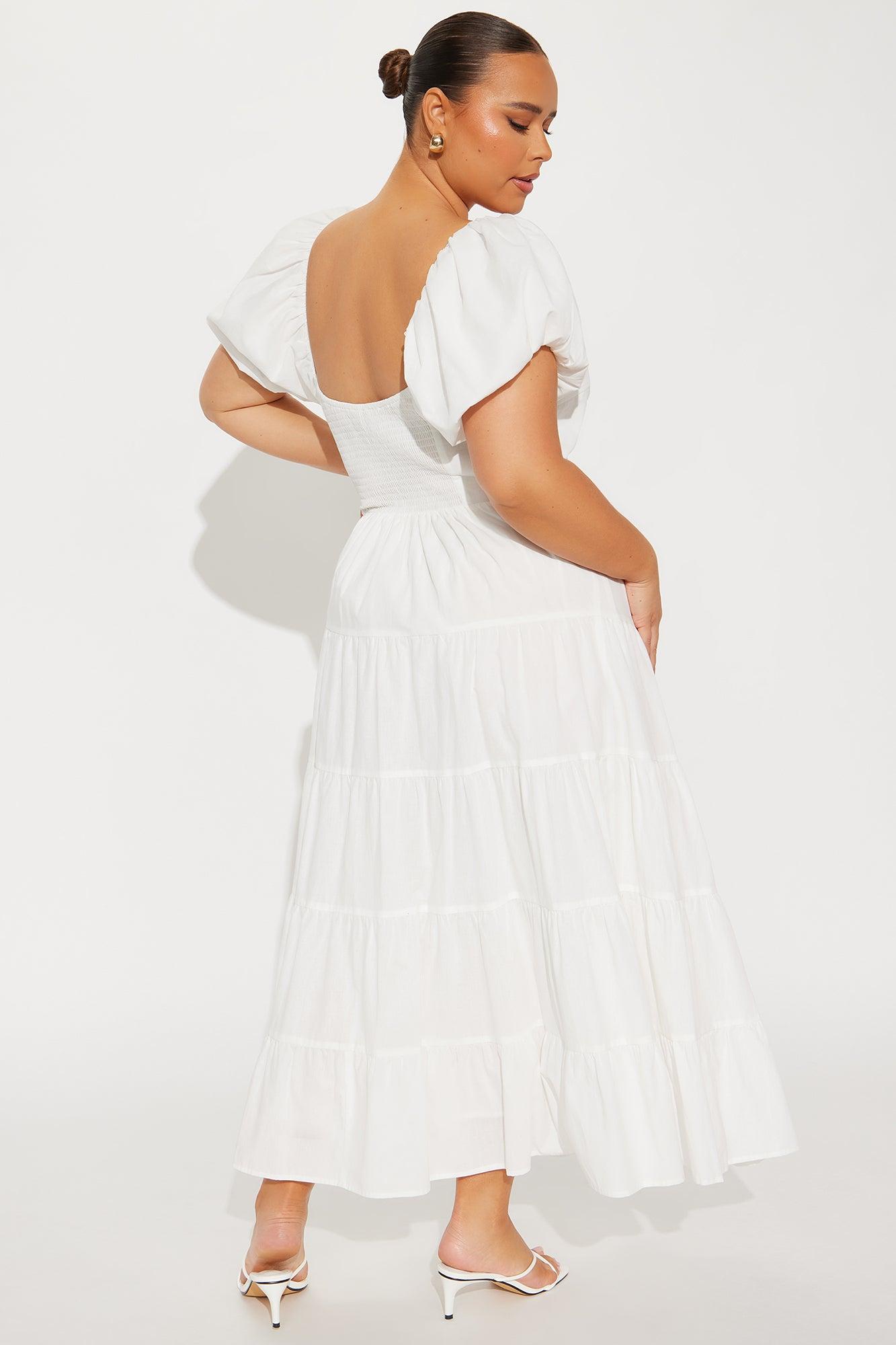 Available In White. Linen Midi Dress V-neck Short puff sleeves Knot/twist detail Tiered Smocked back Length measured flat = 49" Self : 100% Cotton Lining : 100% Cotton Imported