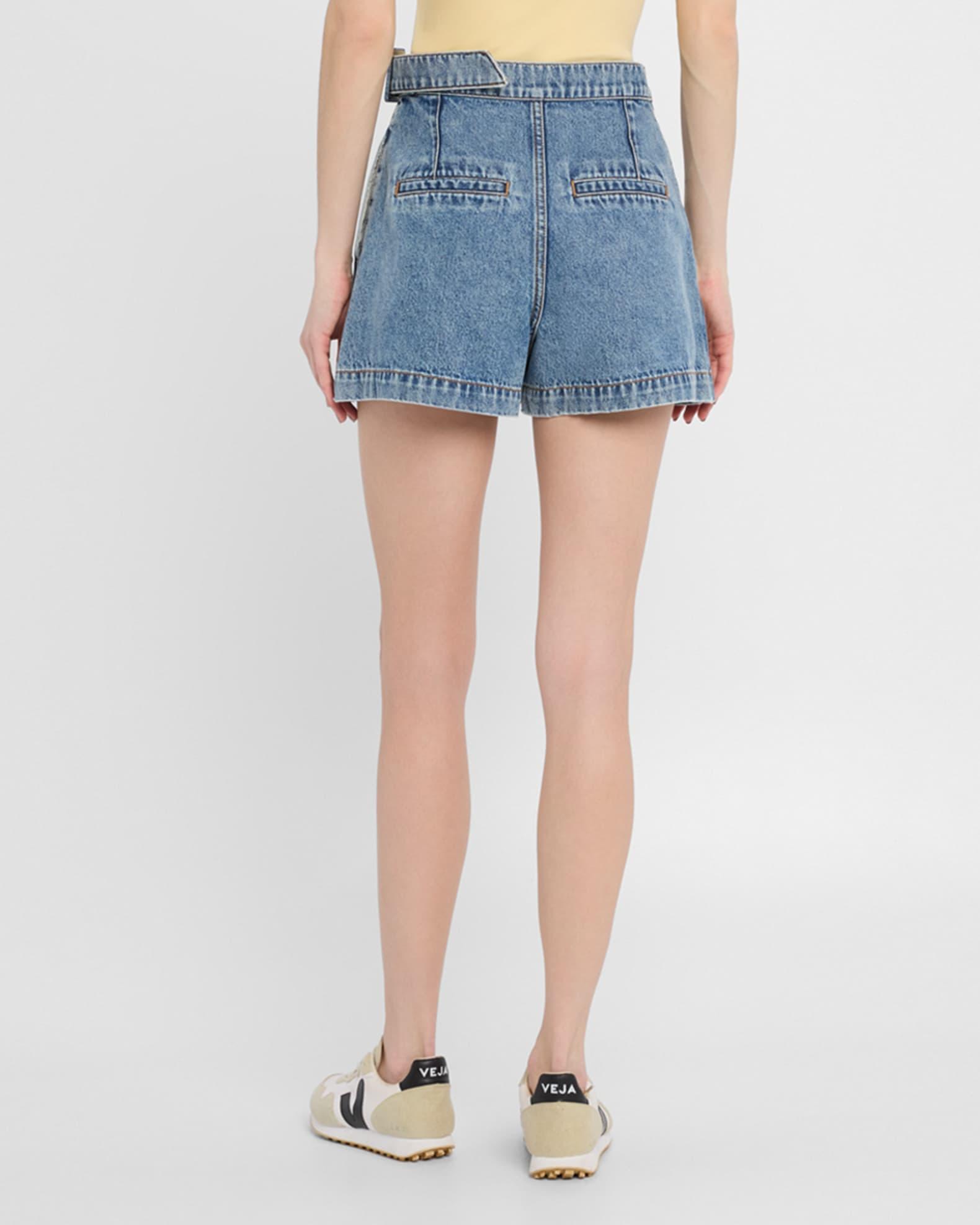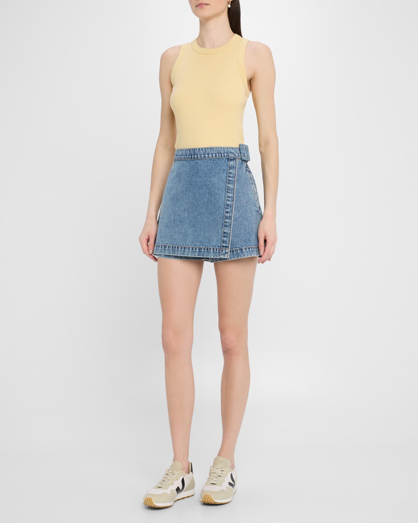 Veronica Beard "Diaz" skort in light-wash denim High rise Adjustable side buckle Side seam pockets; back welt pockets Wrap silhouette Hem falls above the knee Cotton Machine wash cold Imported
