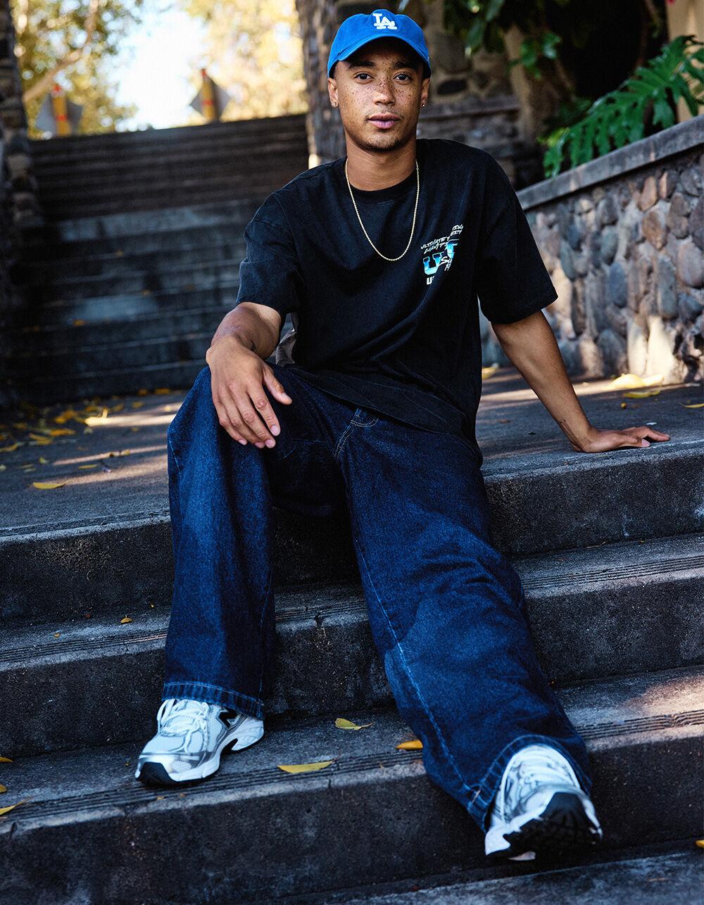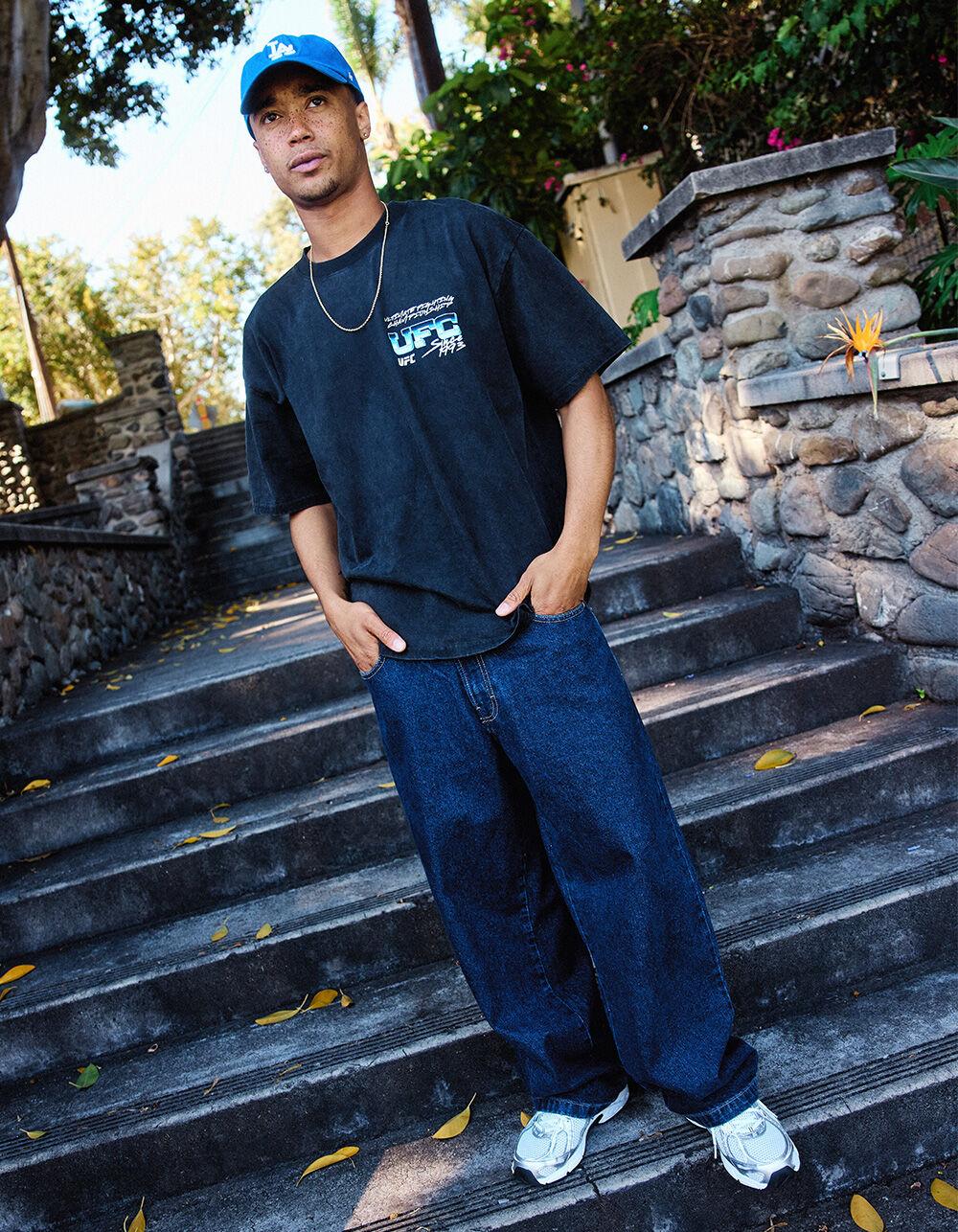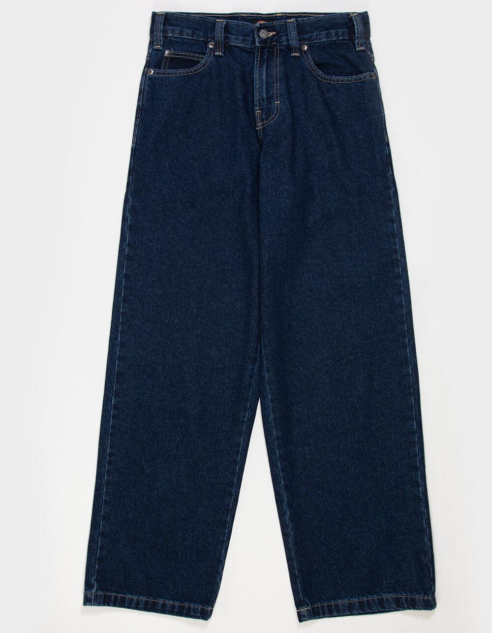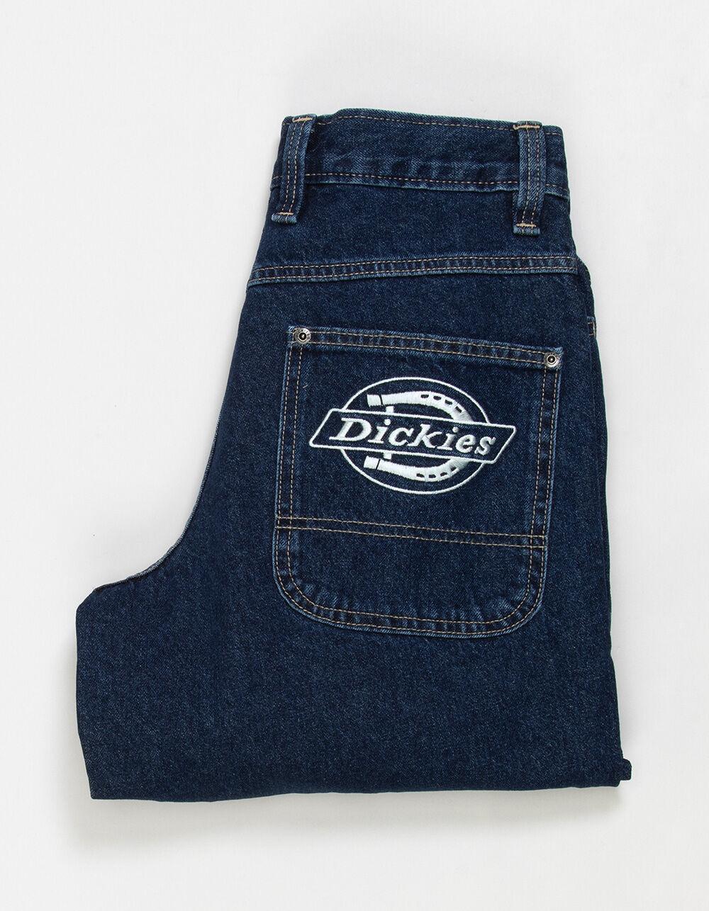 Dickies Hilham Baggy Jeans. 5-pocket denim styling. Button closure with zip fly. Belt loop waist. Mid rise waist. Baggy fit. Straight leg. Approximate leg opening: 18". Dickies embroidery on back right pocket. 100% Cotton. Machine wash. Imported.