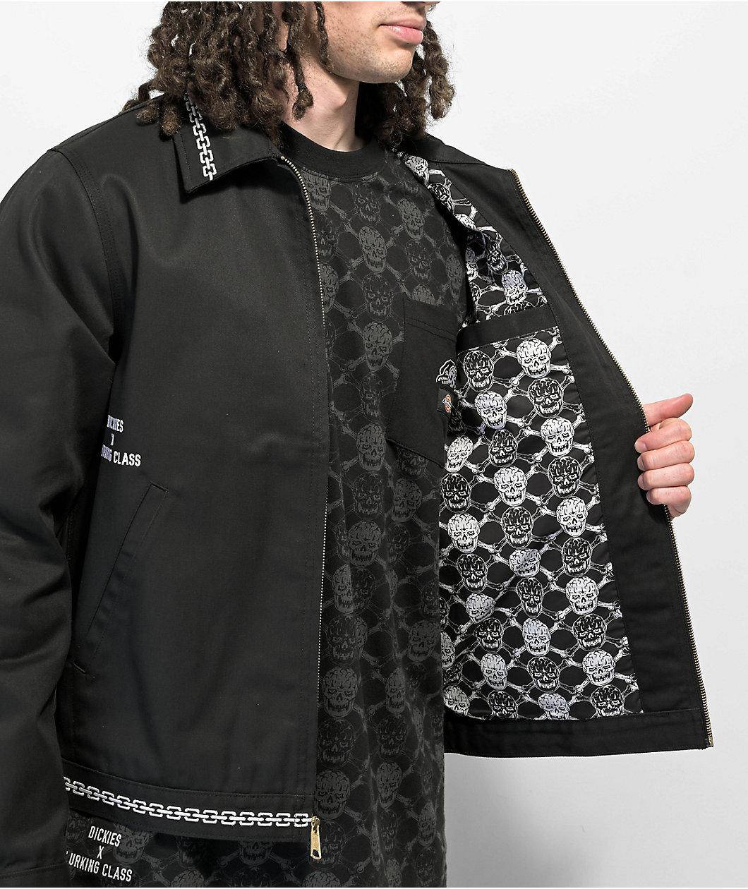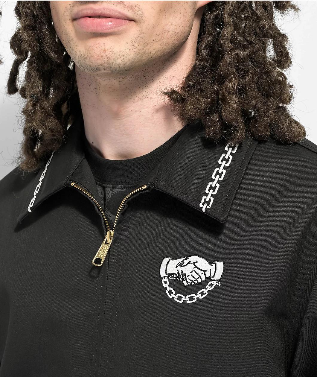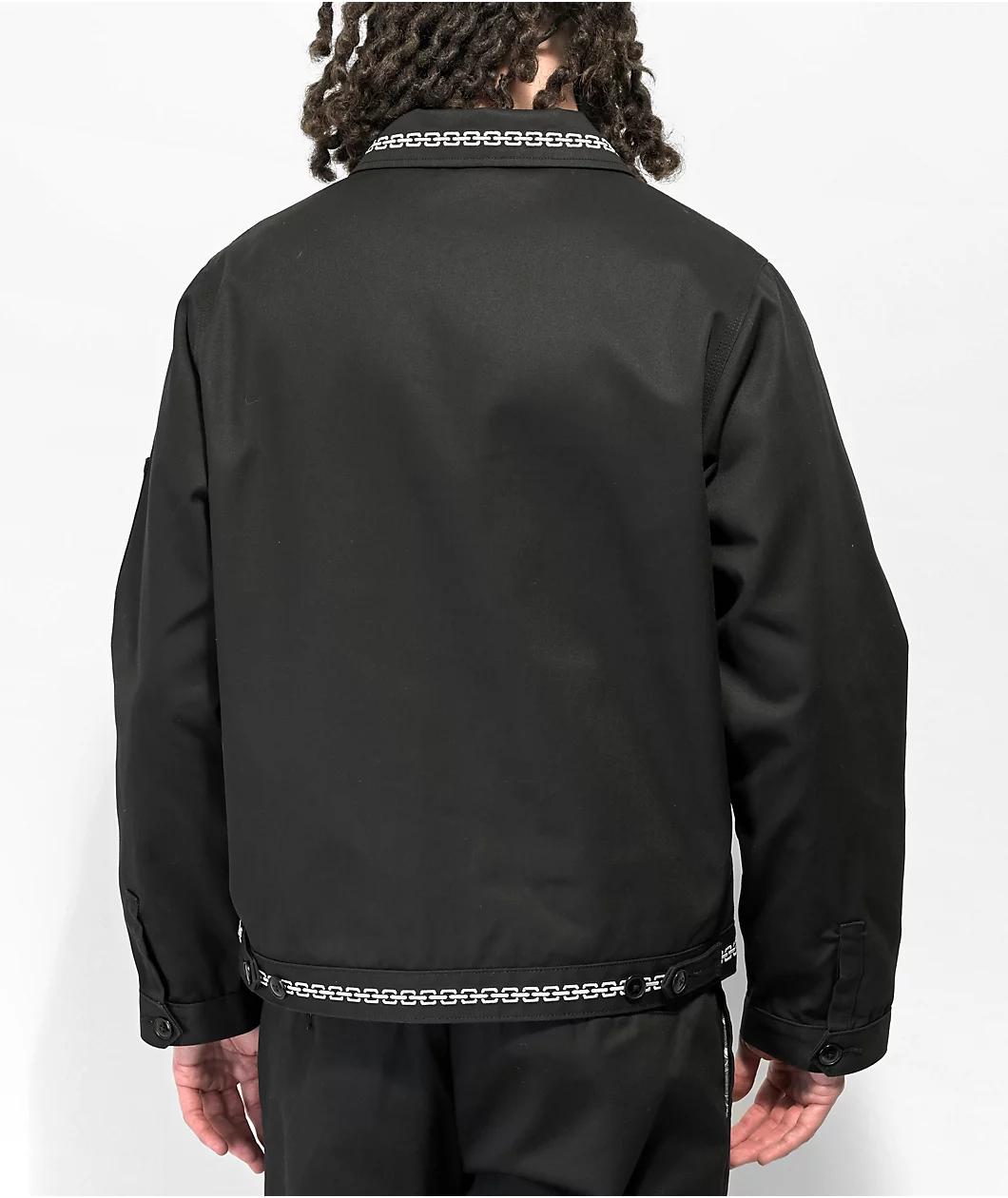 Dickies x Lurking Class by Sketchy Tank join forces to bring the Eisenhower work jacket in a sleek black colorway, offering contrast with white embroidery throughout; including detailing along the turndown collar and bottom hem that offers a unique design