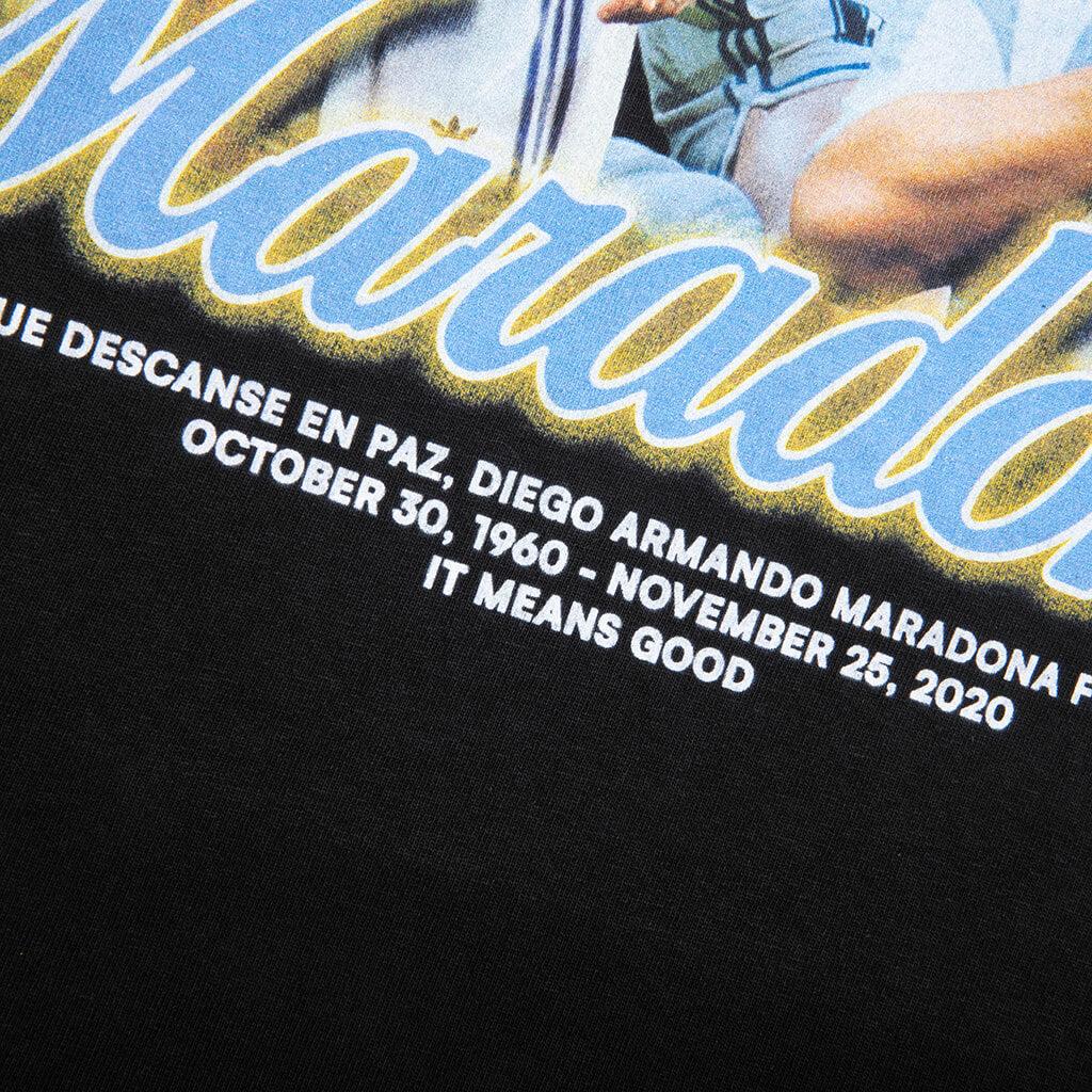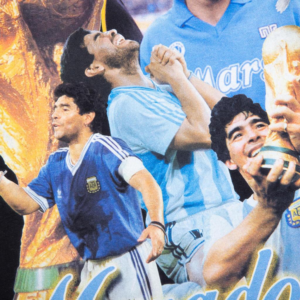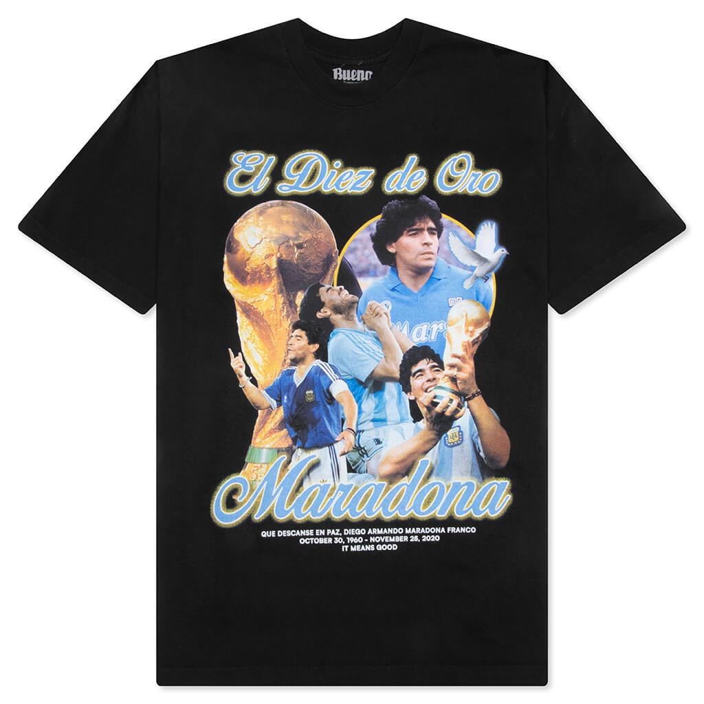 The Diego Maradona Tee from Bueno pays homage to the footballer and global icon. This tee is composed of 100% cotton and has a comfortable crew neckline. Screen-printed graphics of Maradona are the highlight of the design. The ribbed trims complete the look. 100% Cotton Crew neckline Ribbed trims Screen-printed graphics Style No: 11710-BLK