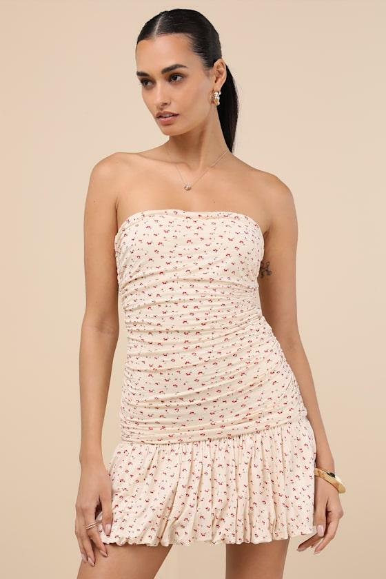 Every sunny season needs an effortlessly crush-worthy dress, like this jersey knit mini that boasts a cute cherry print as it falls from an iconic strapless neckline. Flattering ruching accents the sides of the fitted bodice that meets a trending drop waist, all atop a gathered skirt with a cute bubble hem.
