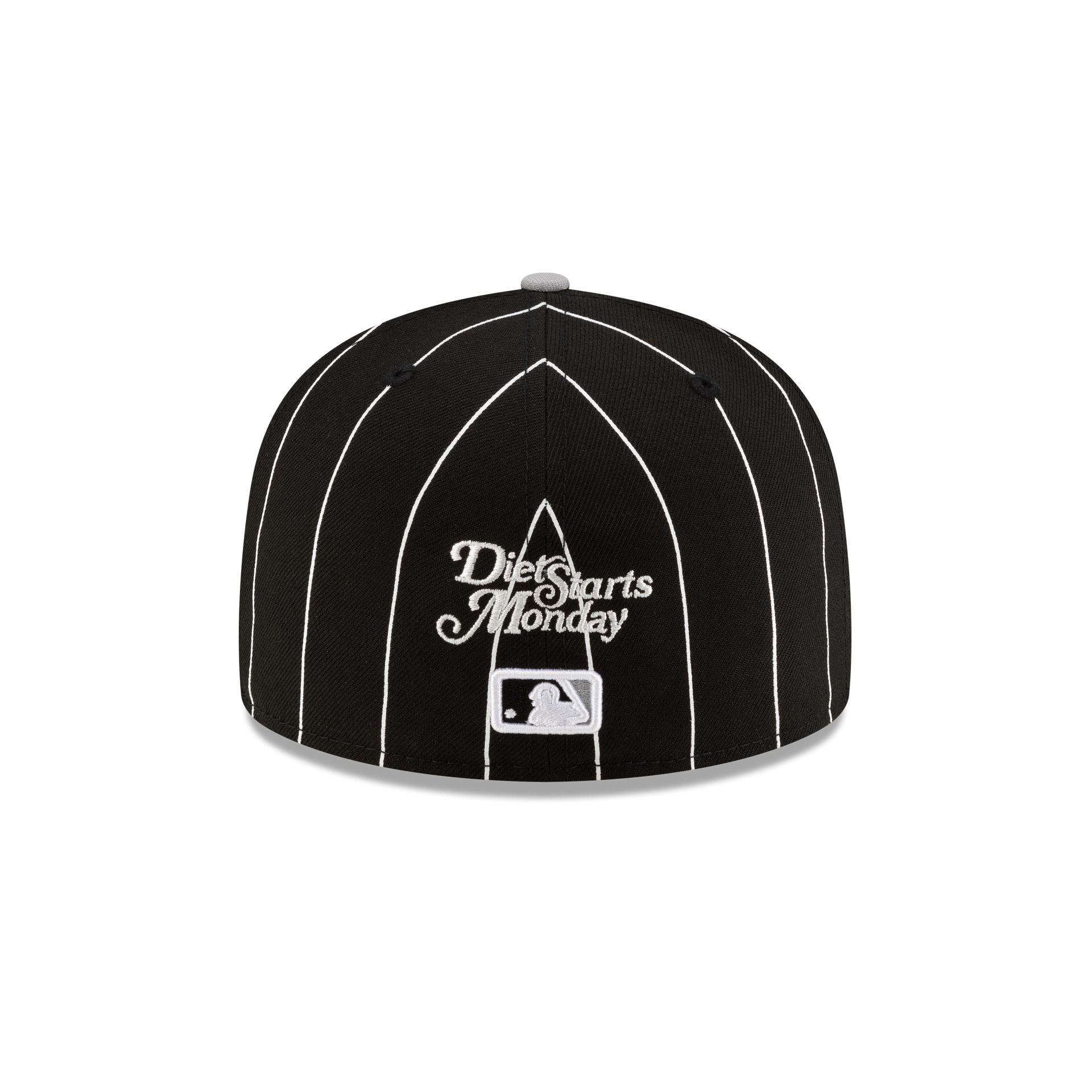 The Diet Starts Monday x Chicago White Sox Pinstripe 59FIFTY Fitted Cap features an embroidered White Sox logo at the front panels with a "Is this Love or Madness?" wordmark at the left-wear side. Additional details include a 2003 All-Star Game patch at the right-wear side, a Diet Starts Monday logo above an MLB Batterman logo at the rear, and a gray undervisor.