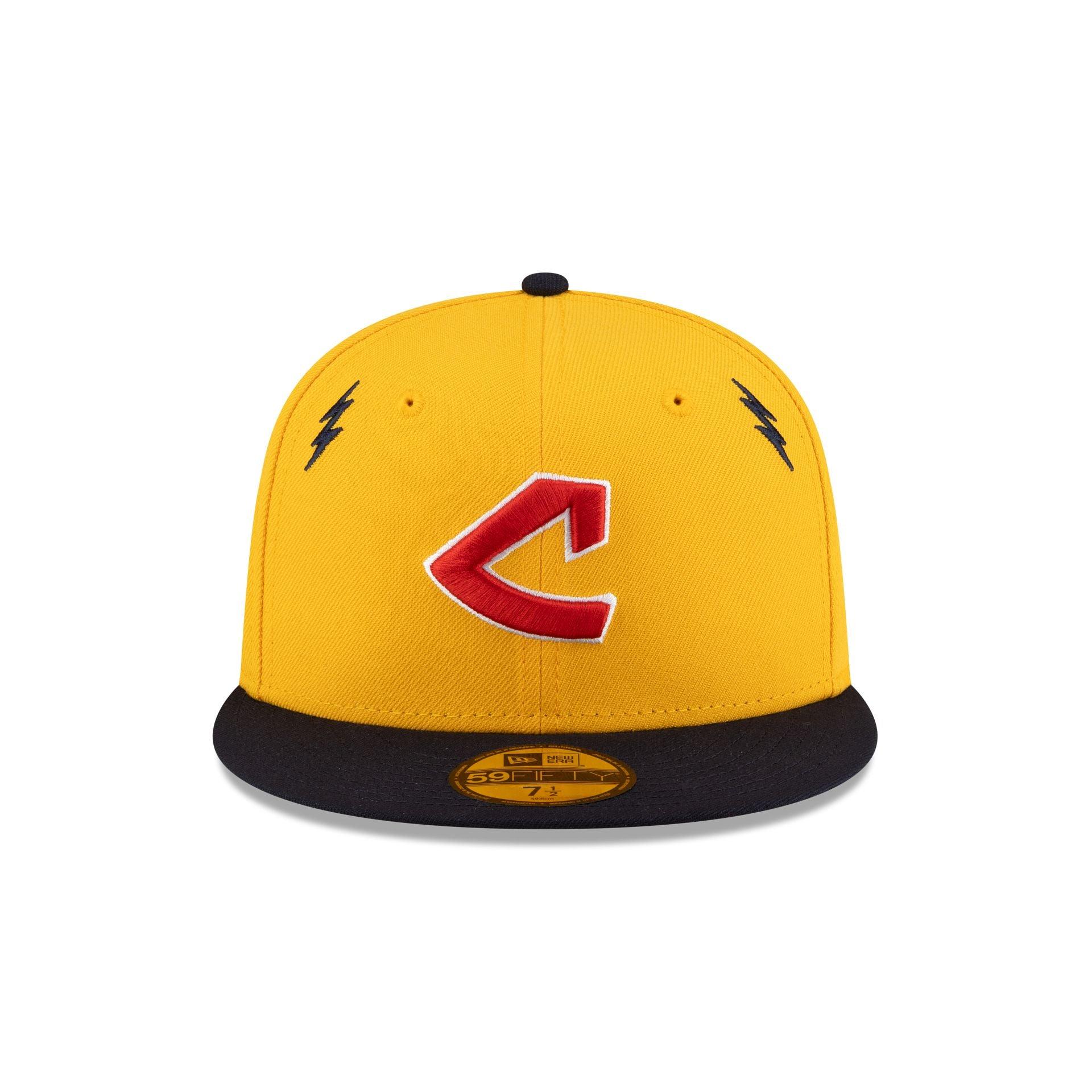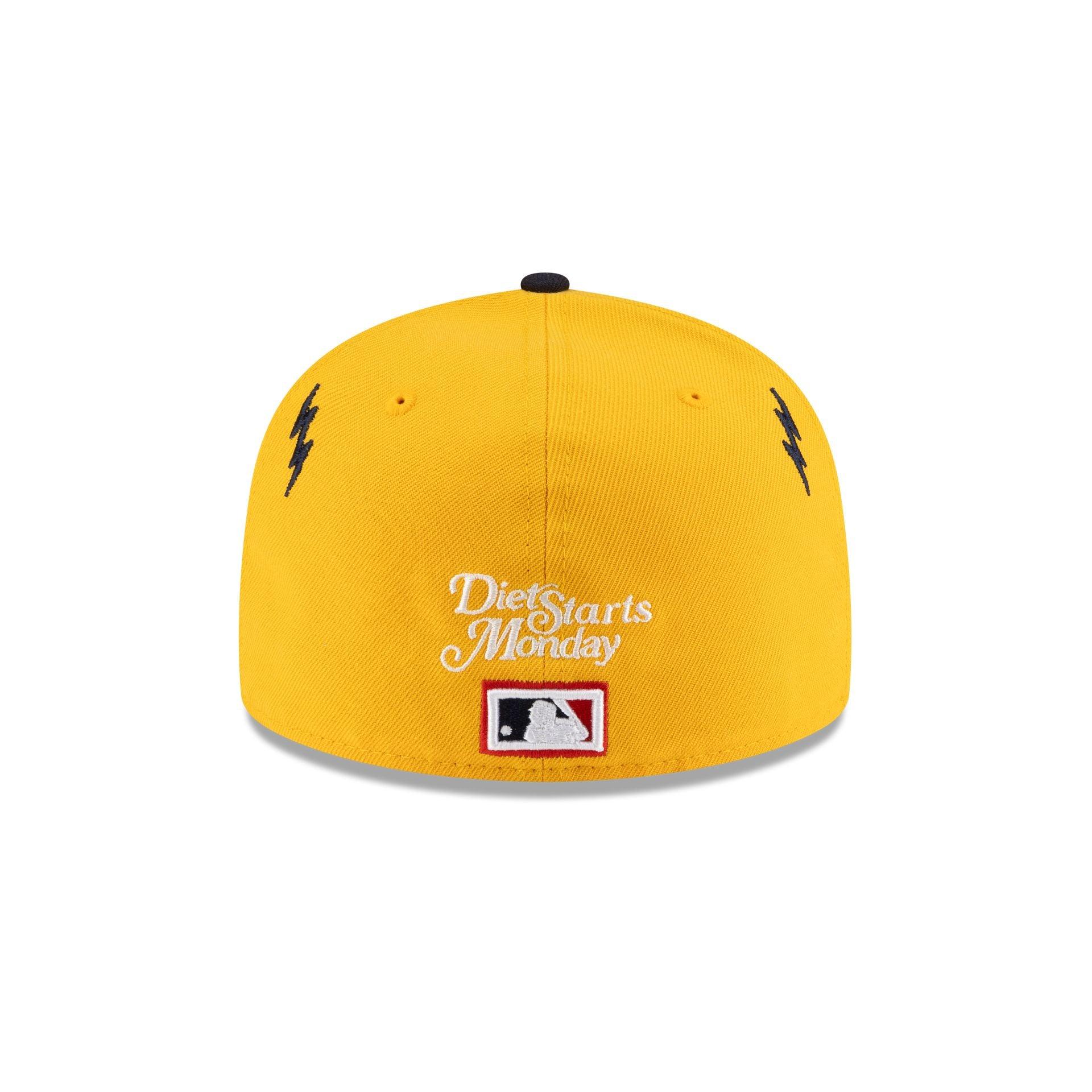 The Diet Starts Monday x Cleveland Guardians Lightening Bolts 59FIFTY Fitted Cap features an embroidered Guardians Cooperstown wordmark and lightening bolts at the front panels with a "Is this Love or Madness?" wordmark at the left-wear side. Additional details include a 1995 Champions patch at the right-wear side, a Diet Starts Monday logo above an MLB Batterman logo at the rear, and a gray undervisor.