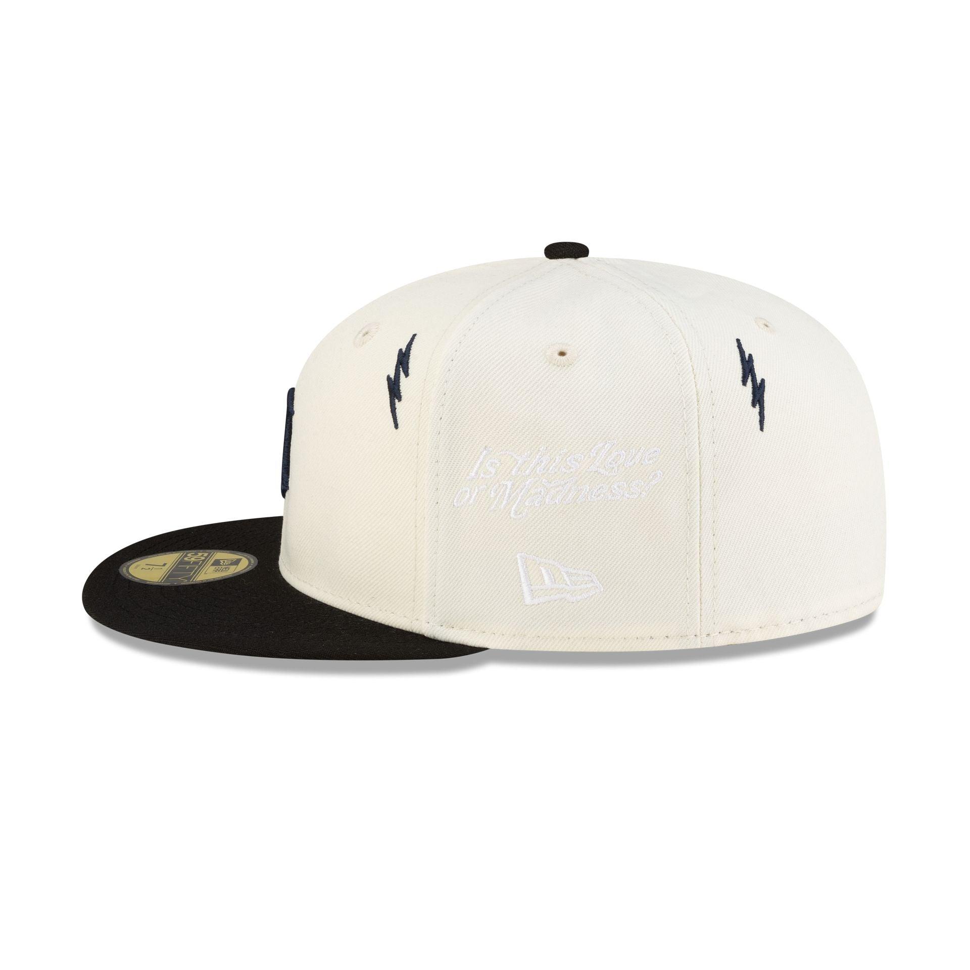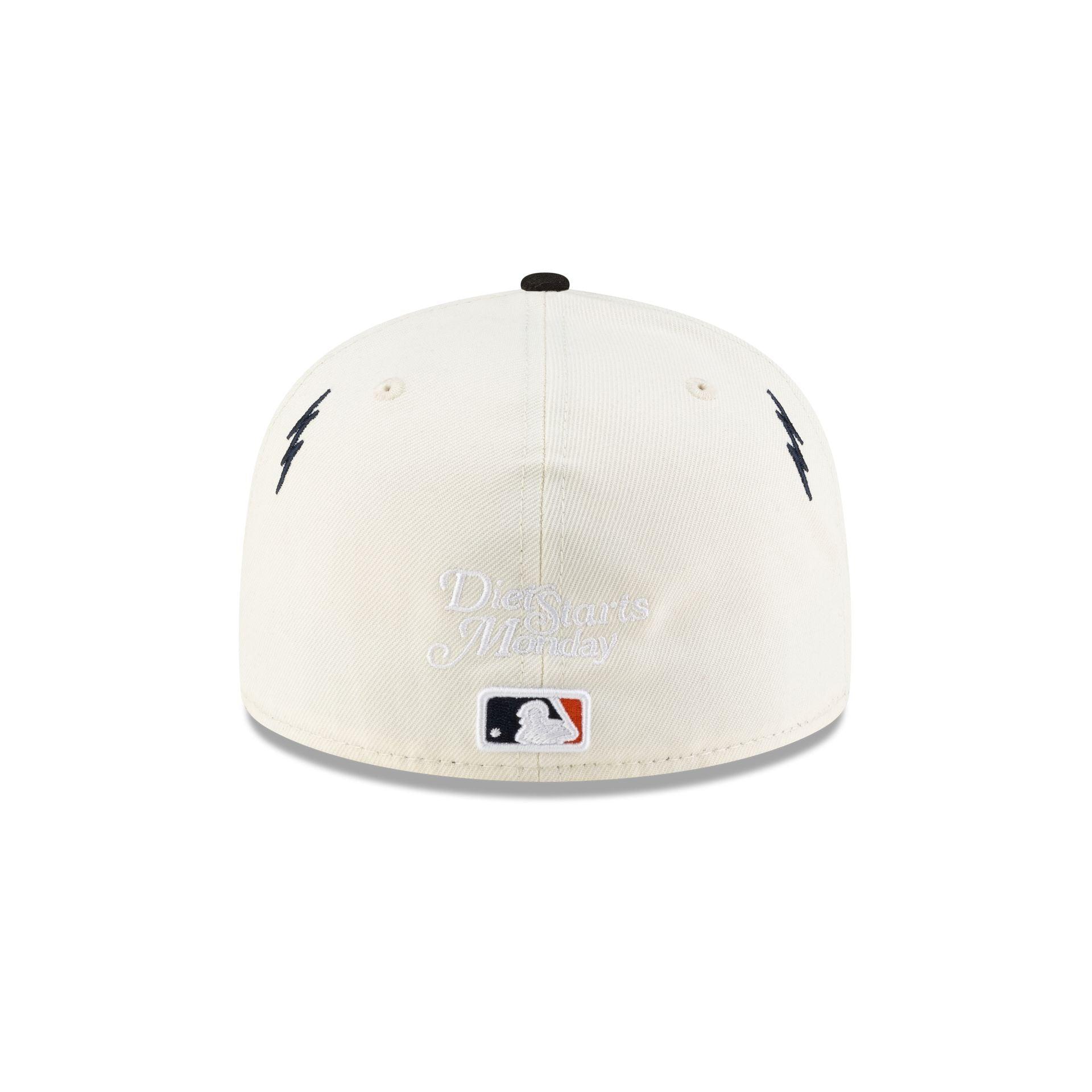 The Diet Starts Monday x Detroit Tigers Lightening Bolts 59FIFTY Fitted Cap features an embroidered Tigers wordmark and lightening bolts at the front panels with a "Is this Love or Madness?" wordmark at the left-wear side. Additional details include a 1984 World Series patch at the right-wear side, a Diet Starts Monday logo above an MLB Batterman logo at the rear, and a gray undervisor.