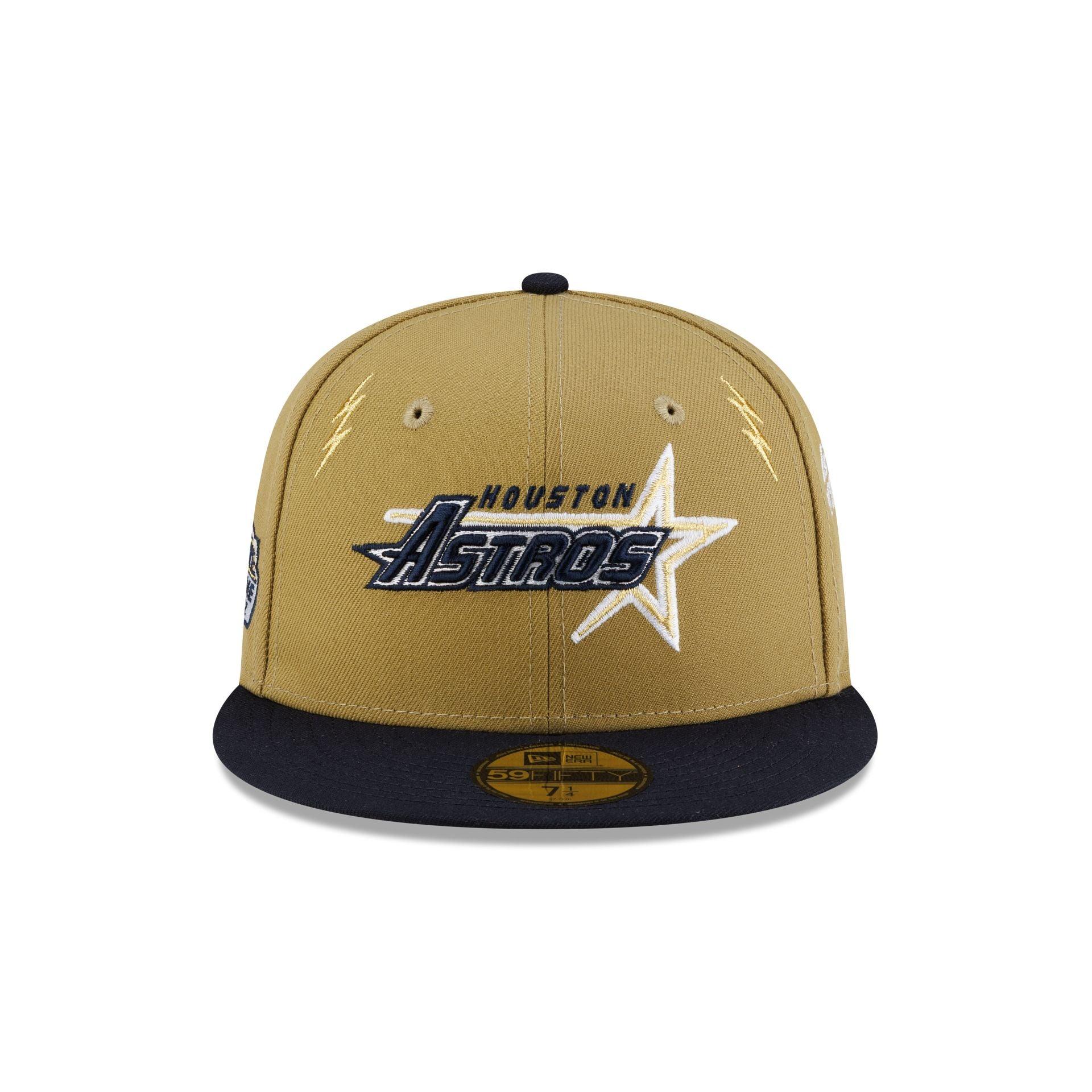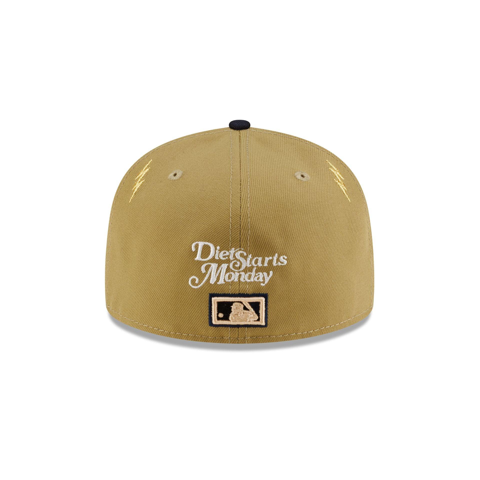 The Diet Starts Monday x Houston Astros Lightening Bolts 59FIFTY Fitted Cap features an embroidered Astros Cooperstown wordmark and lightening bolts at the front panels with a "Is this Love or Madness?" wordmark at the left-wear side. Additional details include an Astrodome patch at the right-wear side, a Diet Starts Monday logo above an MLB Batterman logo at the rear, and a gray undervisor.