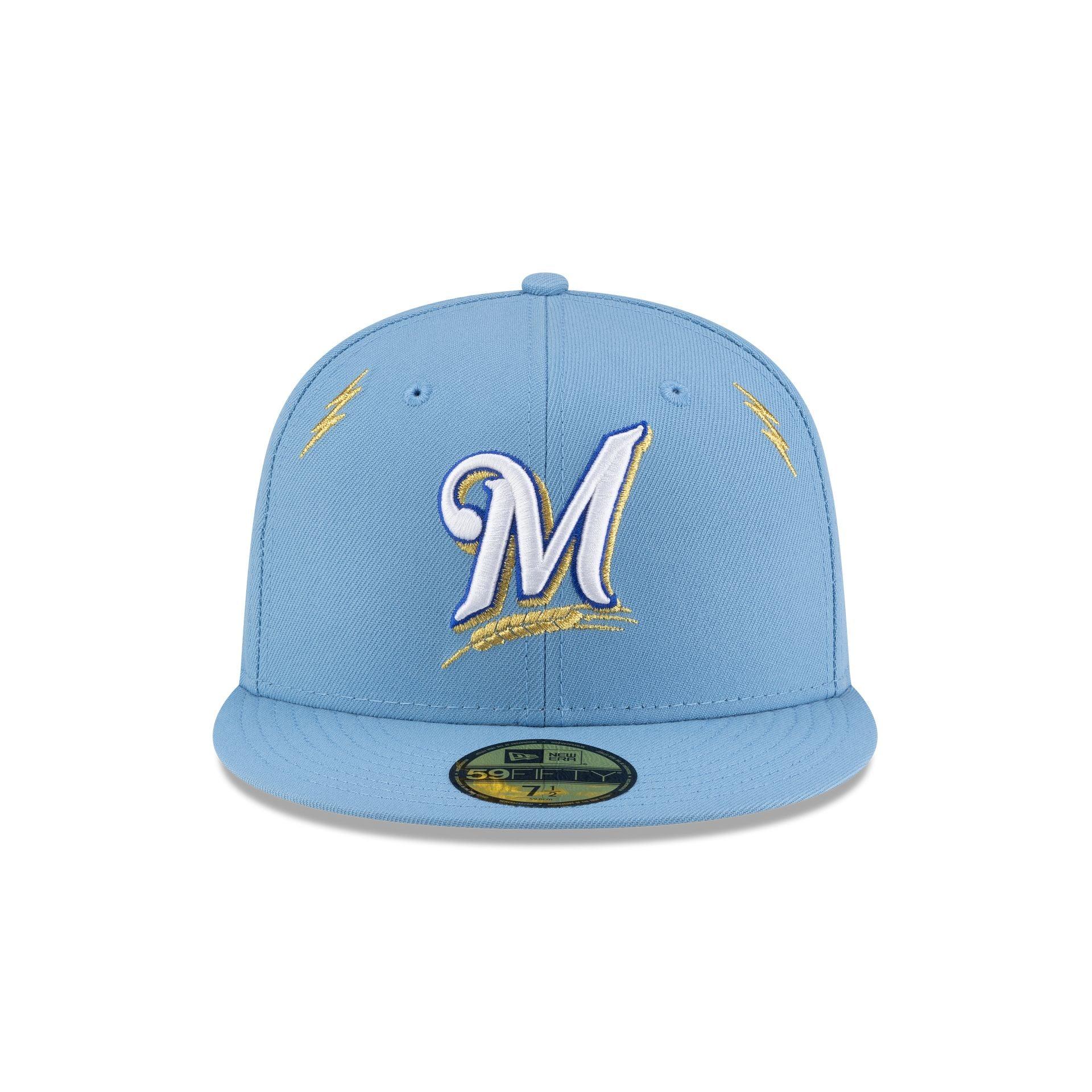 The Diet Starts Monday x Milwaukee Brewers Lightening Bolts 59FIFTY Fitted Cap features an embroidered Brewers Cooperstown wordmark and lightening bolts at the front panels with a "Is this Love or Madness?" wordmark at the left-wear side. Additional details include a 2002 All-Star Game patch at the right-wear side, a Diet Starts Monday logo above an MLB Batterman logo at the rear, and a gray undervisor.