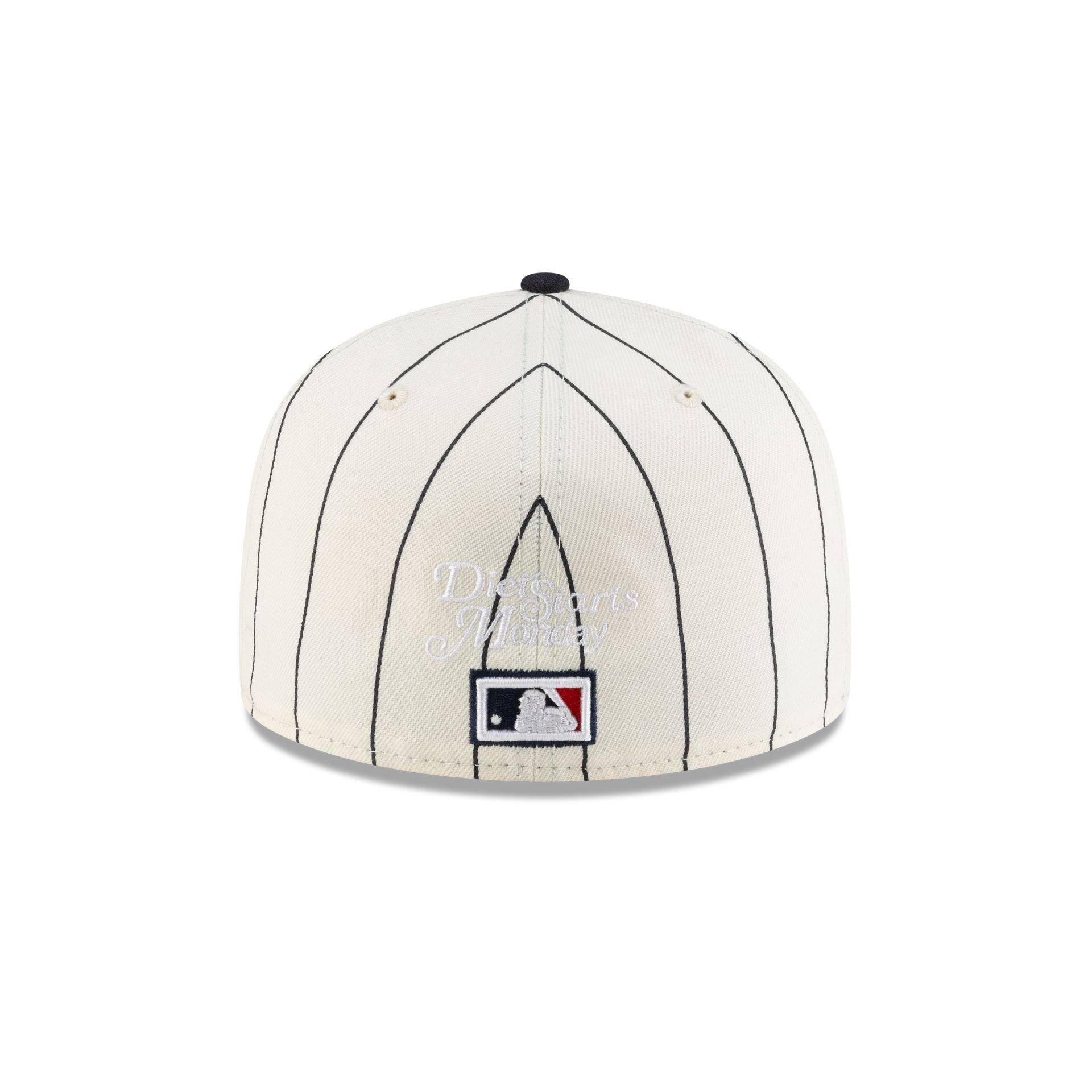 The Diet Starts Monday x New York Yankees Pinstripe 59FIFTY Fitted Cap features an embroidered Yankees Cooperstown logo at the front panels with a "Is this Love or Madness?" wordmark at the left-wear side. Additional details include a 1978 World Series patch at the right-wear side, a Diet Starts Monday logo above an MLB Batterman logo at the rear, and a gray undervisor.
