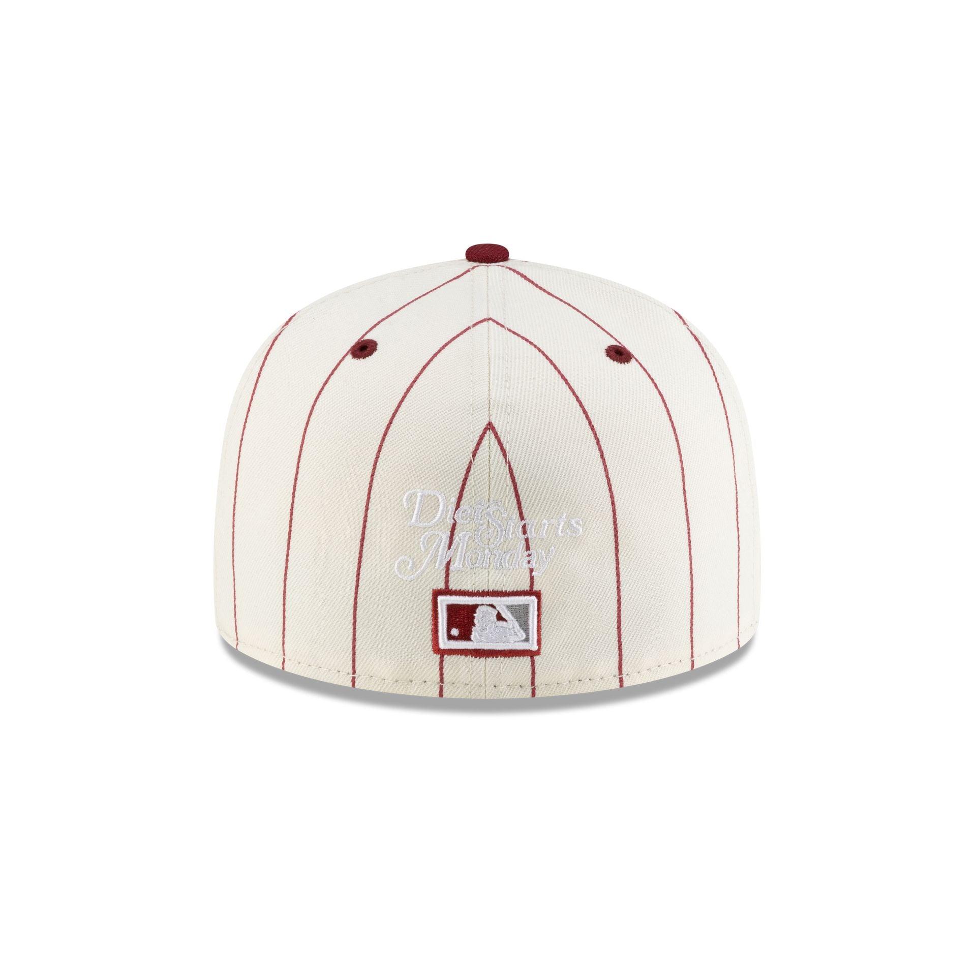 The Diet Starts Monday x Philadelphia Phillies Pinstripe 59FIFTY Fitted Cap features an embroidered Phillies Cooperstown logo at the front panels with a "Is this Love or Madness?" wordmark at the left-wear side. Additional details include a 100th Anniversary patch at the right-wear side, a Diet Starts Monday logo above an MLB Batterman logo at the rear, and a gray undervisor.