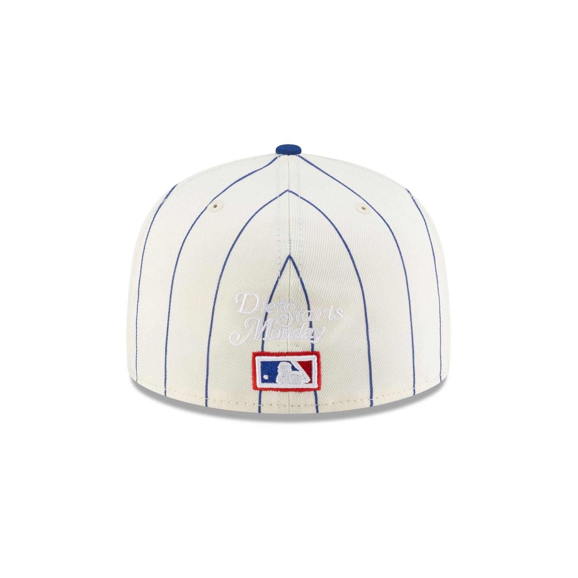 The Diet Starts Monday x Toronto Blue Jays Pinstripe 59FIFTY Fitted Cap features an embroidered Blue Jays Cooperstown logo at the front panels with a "Is this Love or Madness?" wordmark at the left-wear side. Additional details include a 1991 All-Star Game patch at the right-wear side, a Diet Starts Monday logo above an MLB Batterman logo at the rear, and a gray undervisor.