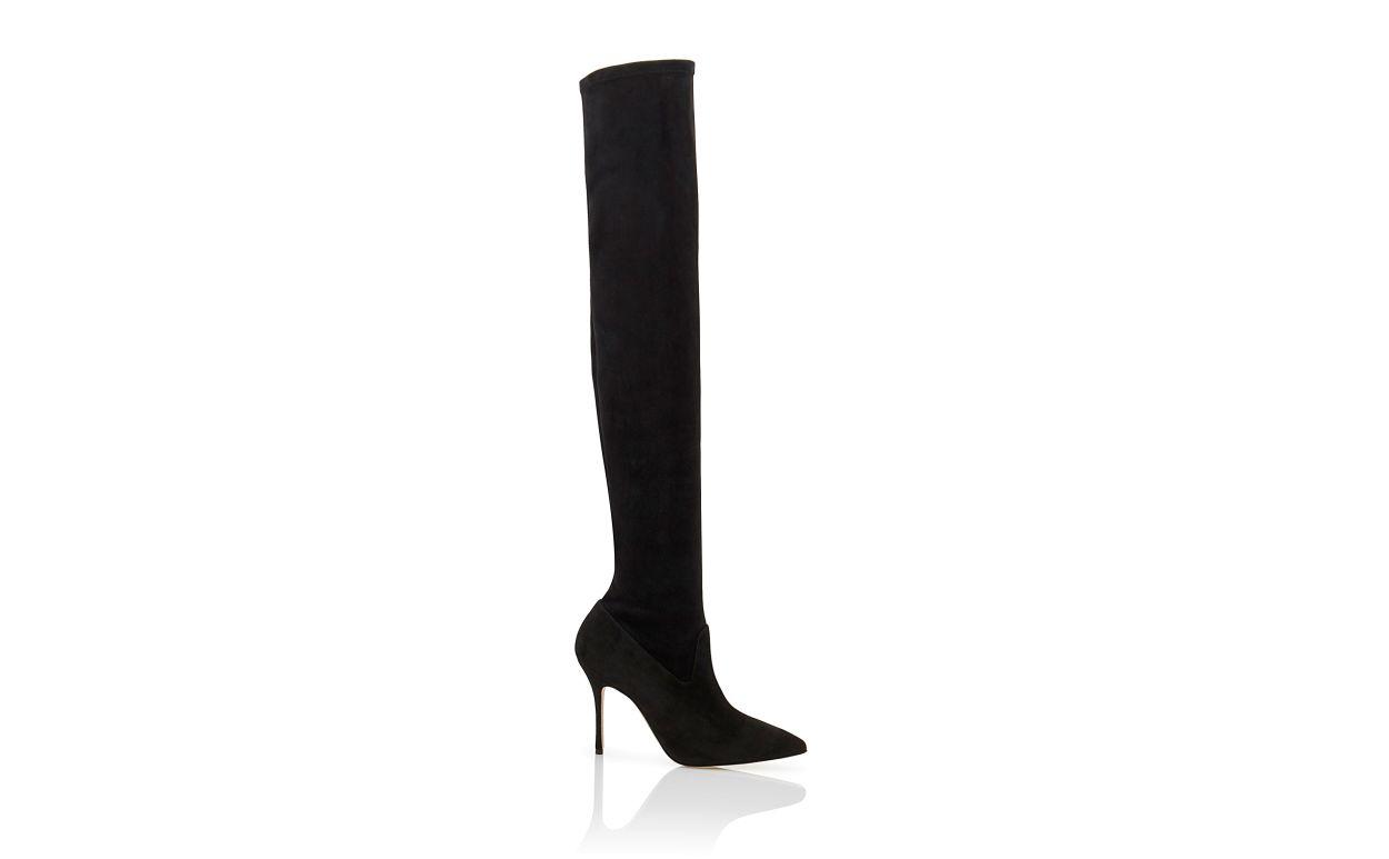 Black suede thigh high boots featuring fitted, slip on design with stiletto high heel. No zip.
