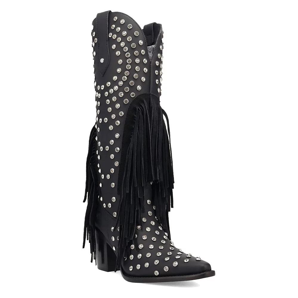 Command attention with every step in these striking boots from Dingo. Featuring playful fringe and an dazzling display of rhinestones, they are the perfect choice for those who want to make a statement and steal the spotlight effortlessly. Click this FOOTWEAR GUIDE to find the perfect fit and more! - https://www.kohls.com/feature/shoesizeguide.jsp. FEATURES: Playful fringe design that sways with every step, Dazzling rhinestones for a striking visual impact. DETAILS: Pointed toe, Pull-on closure, Treaded outsole, Heel height: 2.75 in., Imported. FIT & SIZE: Tall boot shaft, 16" shaft height, 14" shaft circumference. MATERIAL & CARE: Leather upper, Polyester lining, Foam footbed, TPR outsole, Spot clean,. WARNING: Cancer and Reproductive Harm - This product can expose you to chemicals including lead which is known to the state of California to cause cancer, birth defects or reproductive harm and butyl benzyl phthalate (bbp) which is known to the state of California to cause birth defects or other reproductive harm. For more information go to www.P65Warnings.ca.gov. Size: 8. Color: Black. Gender: female. Age Group: adult.