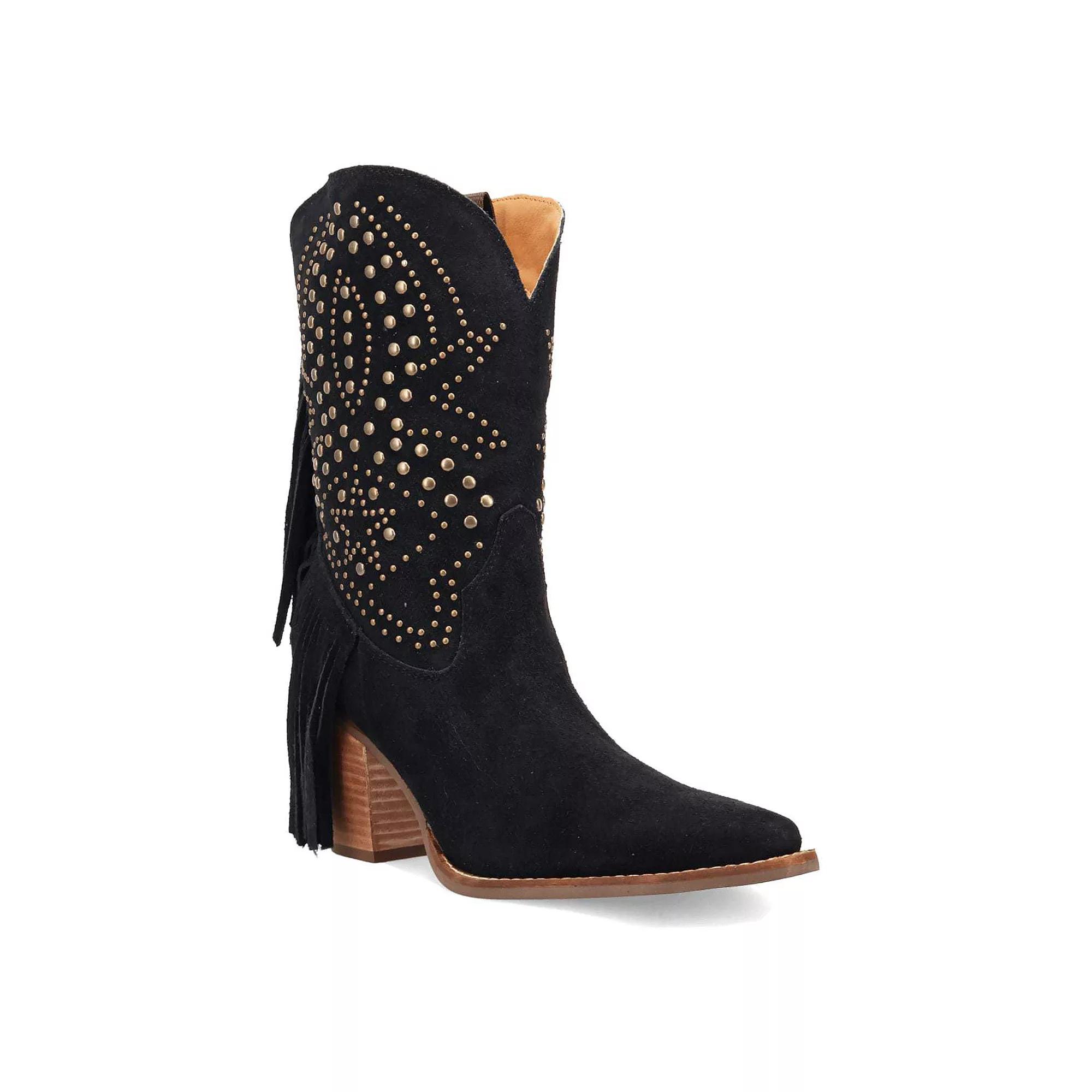 Embrace your inner star with these stunning ankle boots from Dingo that blend edgy studs and shimmering stars, complemented by playful fringe cascading over the heel. Ideal for those who crave to turn heads, these bold designs effortlessly elevate any outfit, making every entrance unforgettable. Size: 7.5. Color: Black. Gender: female. Age Group: adult. Material: SUEDE.