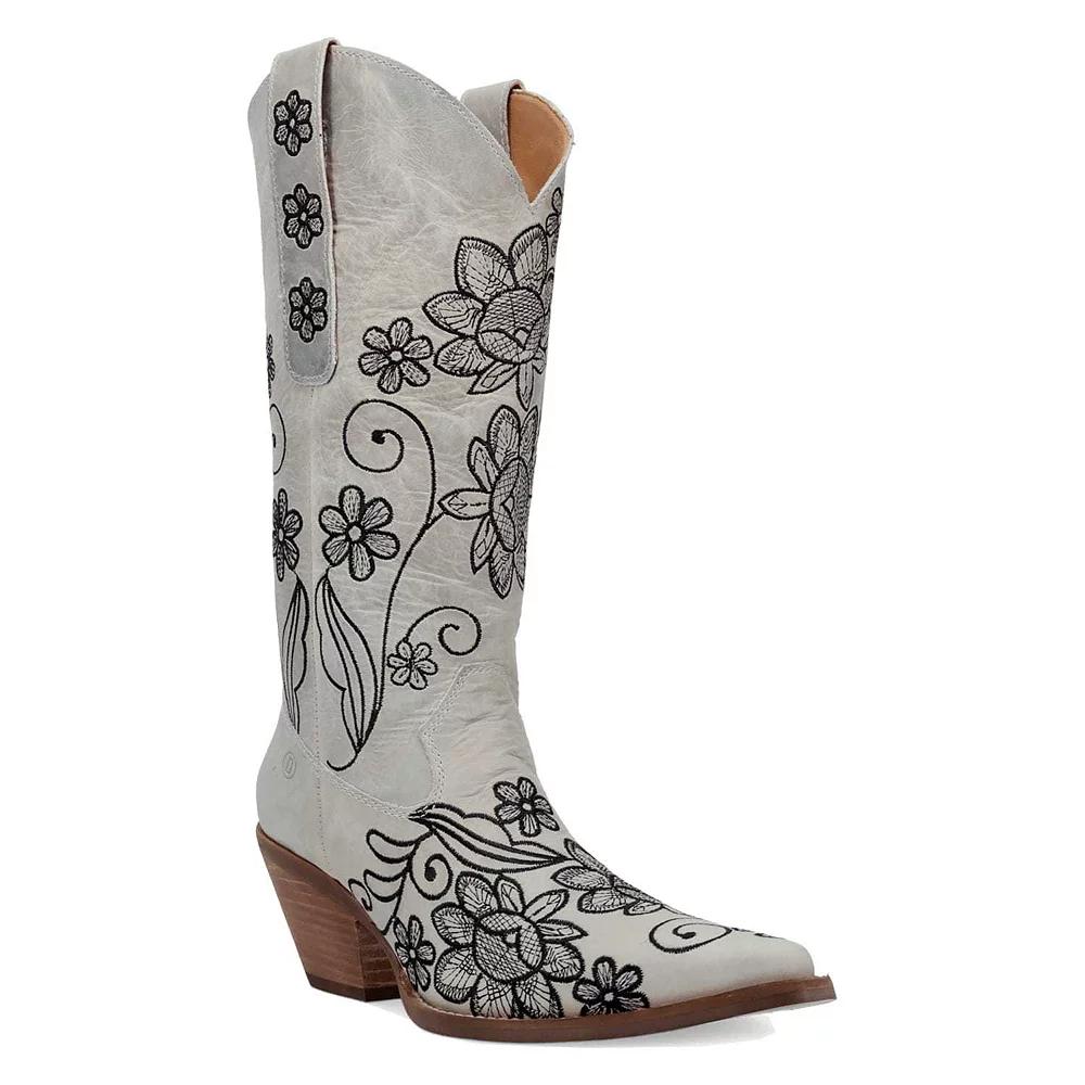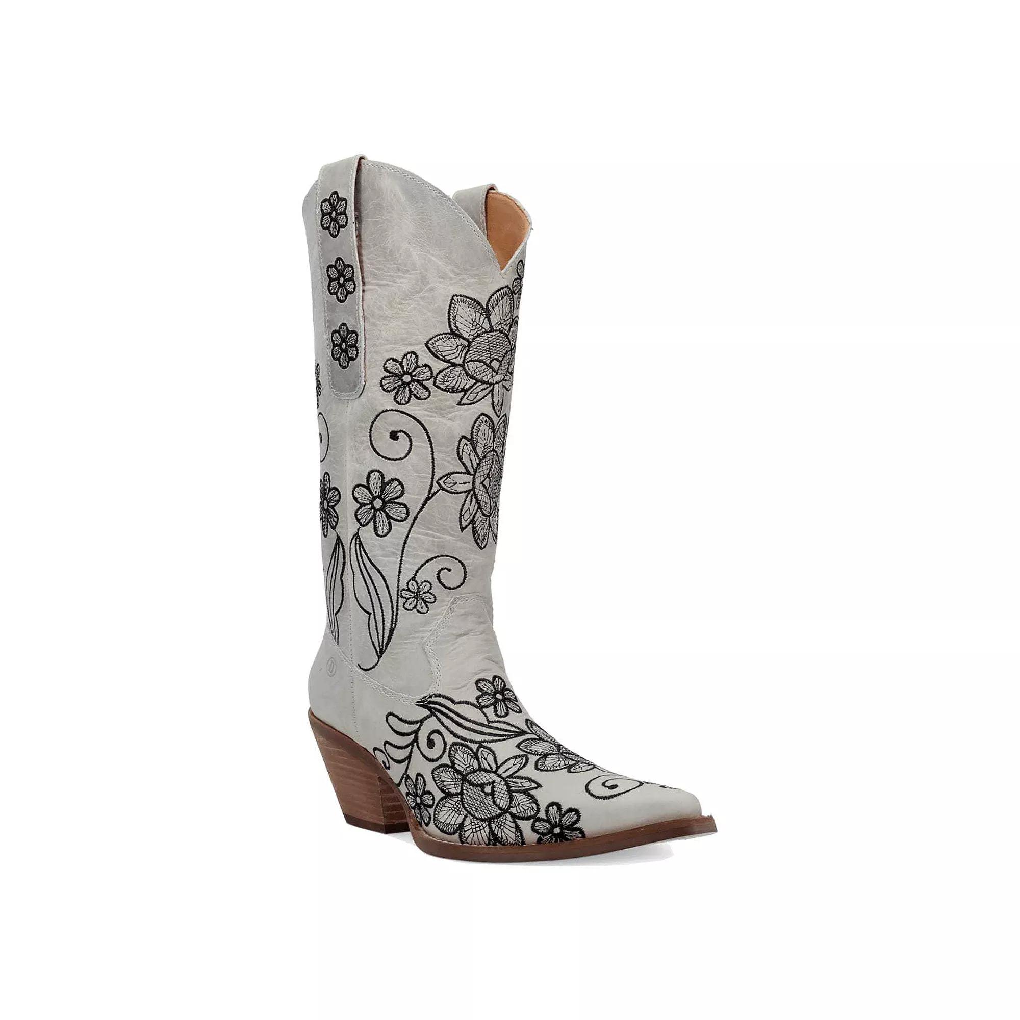 Unleash your bold side with these stunning boots from Dingo, where delicate floral stitching meets dramatic Western scrollwork for a striking visual impact. Perfect for twirling on the dance floor or making a statement in the city, these boots bring an exciting blend of craftsmanship and movement to every outfit. Click this FOOTWEAR GUIDE to find the perfect fit and more! - https://www.kohls.com/feature/shoesizeguide.jsp. FEATURES: Intricate floral stitching with classic Western scrollwork for a layered, dimensional effect, Designed for graceful movement and bold craftsmanship, perfect for casual wear. DETAILS: Pointed toe, Pull-on closure, Treaded outsole, Heel height: 2-in.,. WARNING: Cancer and Reproductive Harm - This product can expose you to chemicals including lead which is known to the state of California to cause cancer, birth defects or reproductive harm and butyl benzyl phthalate (bbp) which is known to the state of California to cause birth defects or other reproductive harm. For more information go to www.P65Warnings.ca.gov. FIT & SIZE: Mid-calf boot shaft, 13-in. boot shaft height, 12-in. boot shaft circumference. MATERIAL & CARE: Leather upper, Polyester lining, Foam midsole & footbed, TPR outsole, Spot clean. Size: 9.5. Color: White. Gender: female. Age Group: adult.