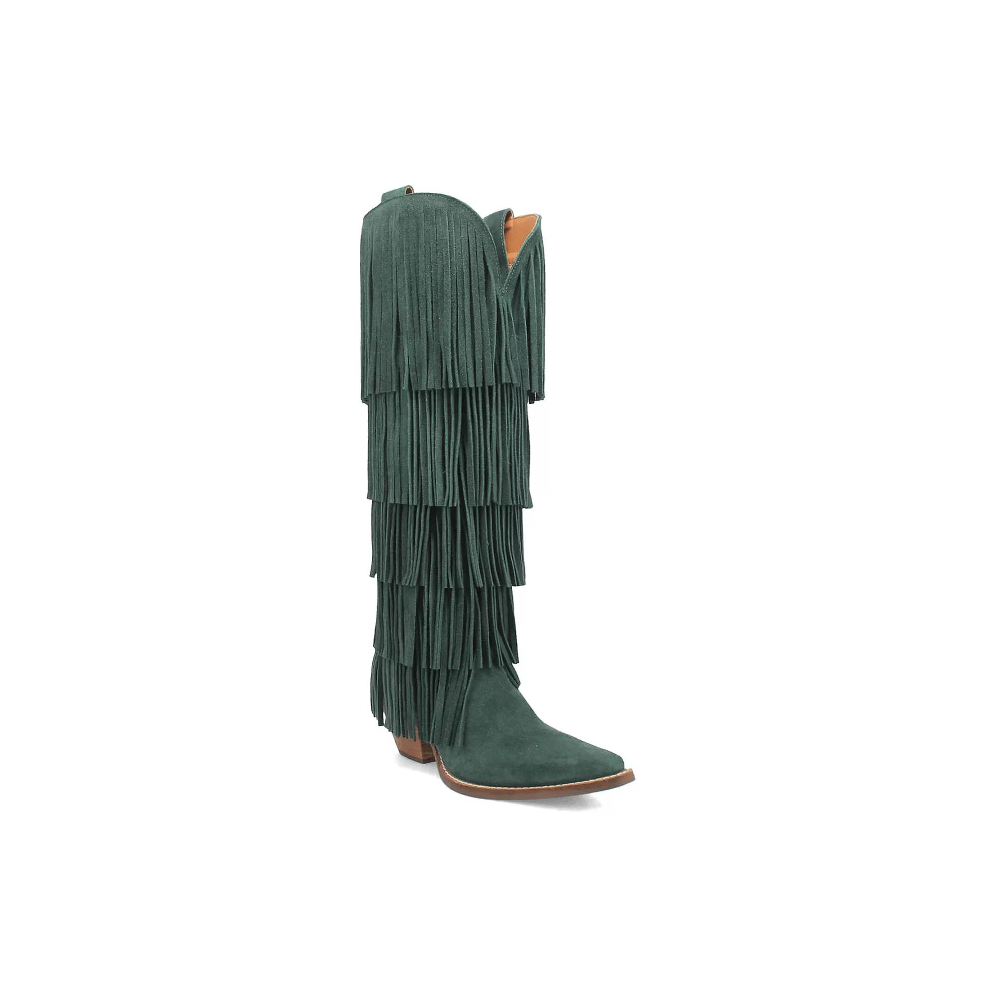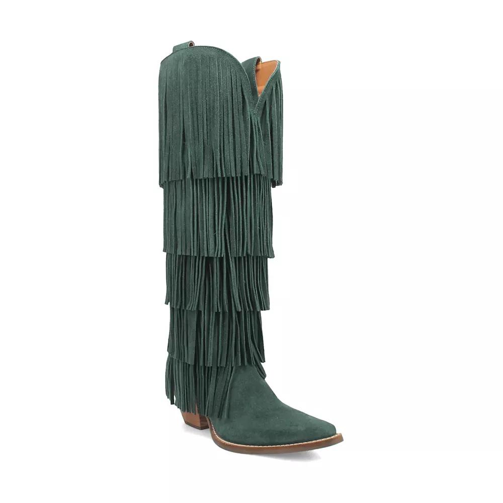 Make a fashion statement with these Dingo Wild Child Women's Suede Fringe Boots. Click this FOOTWEAR GUIDE to find the perfect fit and more! - https://www.kohls.com/feature/shoesizeguide.jsp. FEATURES: Fringe details, Tall silhouette, Foam footbed for all day comfort, Durable rubber outsole, Pull-on for easy on and off. DETAILS: Suede upper, Polyester lining, Foam midsole, TPR rubber outsole, Pointed toe, Pull-on, Foam footbed, 2 1/2-in. heel, 16-in. shaft, 12-in. circumference, Spot clean, Imported,. WARNING: THIS PRODUCT CAN EXPOSE YOU TO CHEMICALS INCLUDING LEAD WHICH IS KNOWN TO THE STATE OF CALIFORNIA TO CAUSE CANCER, BIRTH DEFECTS OR REPRODUCTIVE HARM AND BUTYL BENZYL PHTHALATE (BBP) WHICH IS KNOWN TO THE STATE OF CALIFORNIA TO CAUSE BIRTH DEFECTS OR OTHER REPRODUCTIVE HARM. FOR MORE INFORMATION GO TO www.P65Warnings.ca.gov - https://www.p65warnings.ca.gov/. Size: 8.5. Color: Green. Gender: female. Age Group: adult.
