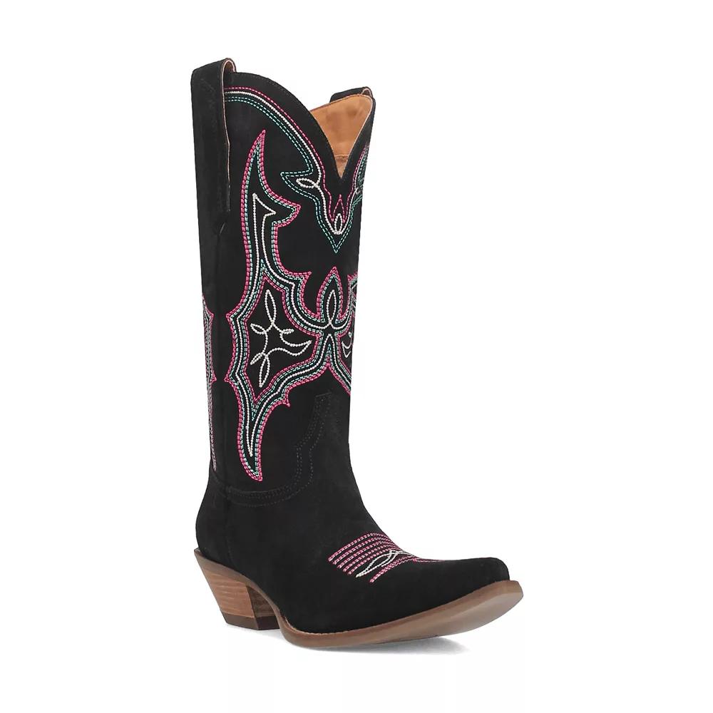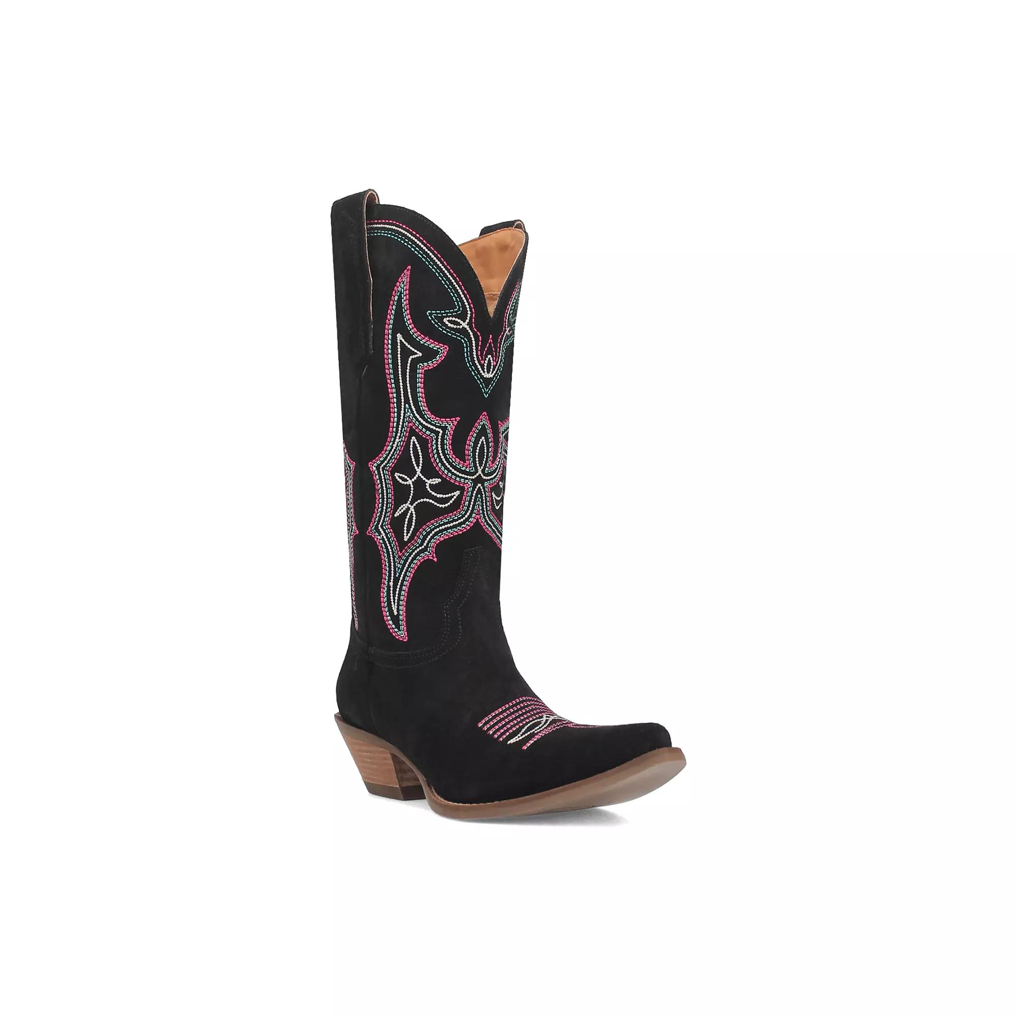 Step into a new style with these bold Dingo Womens Hot Sauce Embroidered Leather Cowboy Boots.Click this FOOTWEAR GUIDE to find the perfect fit and more! Step into a new style with these bold Dingo Womens Hot Sauce Embroidered Leather Cowboy Boots.Click this FOOTWEAR GUIDE to find the perfect fit and more! FEATURES Electric stitching details for a showstopping design Cushion comfort insole Timeless western silhouetteDETAILS Suede leather upper Polyester lining Foam midsole TPR rubber outsole Sharp toe Pull-on design Foam footbed 2 in. heel height 13 in. boot shaft 13. in shaft circumference Spot clean Imported WARNING: THIS PRODUCT CAN EXPOSE YOU TO CHEMICALS INCLUDING LEAD WHICH IS KNOWN TO THE STATE OF CALIFORNIA TO CAUSE CANCER, BIRTH DEFECTS OR REPRODUCTIVE HARM AND BUTYL BENZYL PHTHALATE (BBP) WHICH IS KNOWN TO THE STATE OF CALIFORNIA TO CAUSE BIRTH DEFECTS OR OTHER REPRODUCTIVE HARM. For more information go to www.P65Warnings.ca.gov. Size: 6.5. Color: Black. Gender: female. Age Group: adult.