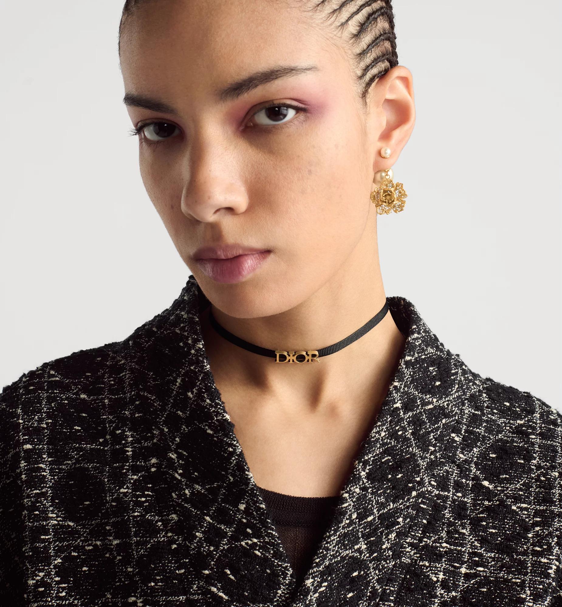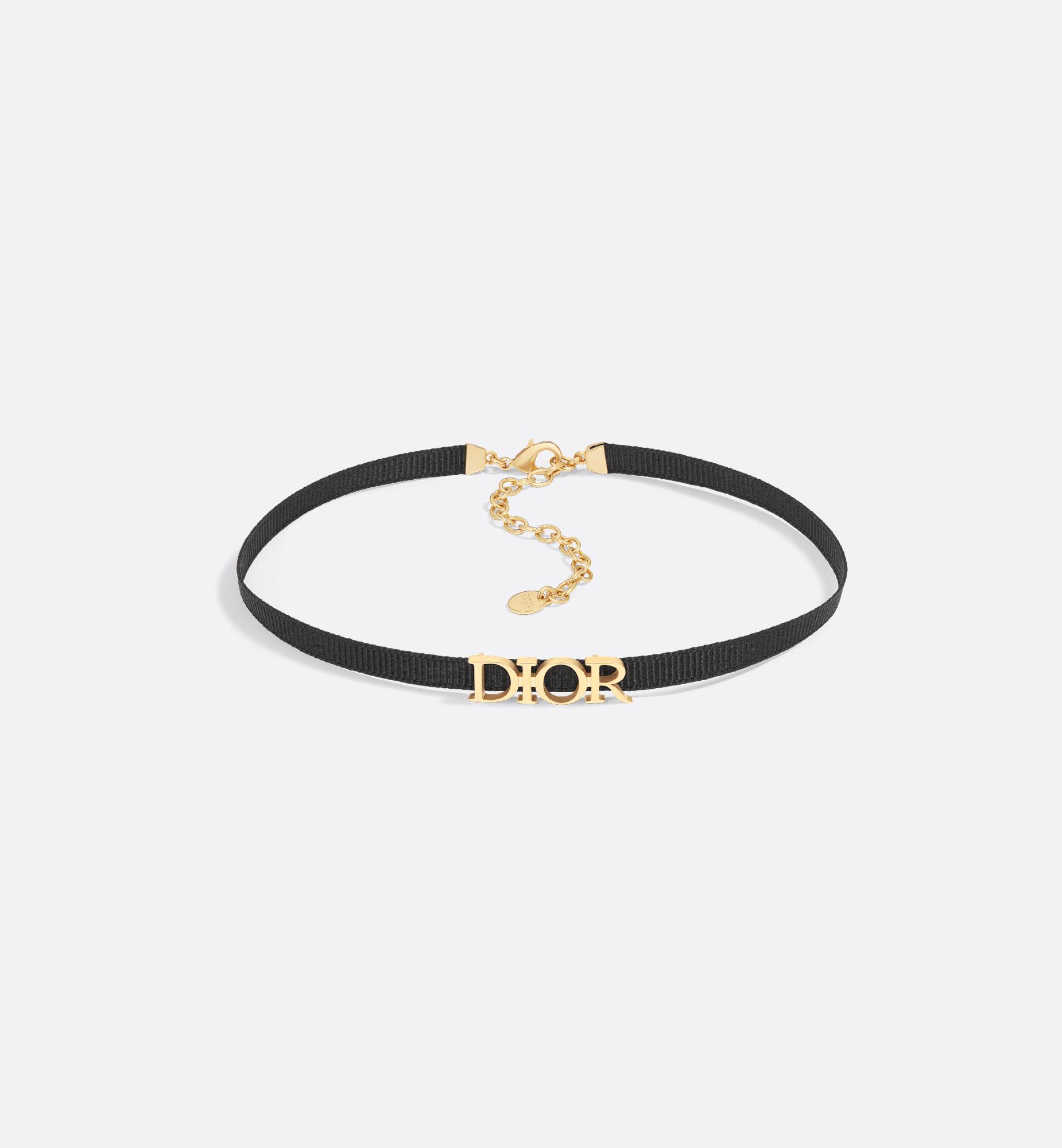 The Dio(r)evolution choker redefines codes of elegance with a contemporary touch. The black grosgrain design showcases gold-finish metal D.I.O.R. letters. The graceful and sophisticated necklace can be combined with other Dio(r)evolution creations. D.I.O.R. signature. Black grosgrain. Gold-finish metal. Lobster clasp. Made in Germany