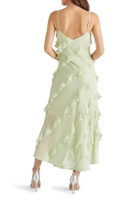 The elegant chiffon slipdress features fluttering frills that bring romance and movement, and is cut with a slit at the hem. This maxi dress has a 51 1/2" length, a v-neck, and adjustable straps, and is lined. It features a hidden side-zip closure.